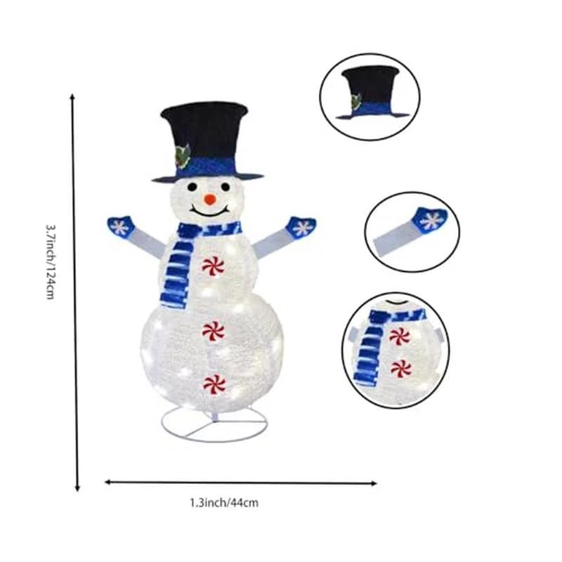 About this item Attractive Christmas Decor:Our lighted snowman is 4 ft tall, which is perfect decoration in Christmas season. With pre-lit lights,the outdoor snowman brings rich Christmas atmosphere. The Lighted hands say hello to everyone who visit your family. Lighted Collapsible Christmas Decoration - The 4FT snowman decorations with 120LT white light bulbs, wearing black top hat,Blue and white stripes scarf, carrot nose, bring warmth to families, creating a warm Christmas atmosphere Easy to Install - Collapsible structure makes easy assembly and storage. Christmas collapsible decoration no tools or specialized skills are required, you can use the ground stake to fix firmly if displaying outdoors in fine weather. (Please refer to the instructions for more details) Great Christmas Decoration - Suit for Christmas outdoor yard garden decorations, Christmas themed party, indoor & outdoor decorations, Christmas event decoration, Christmas Eve night décor, pop-up Christmas decor, winter decoration, party favor Christmas prop, classroom decorations and more. It is also an ideal and considerable Christmas gift for friends, family or relatives Safe and Durable - Pre-lit pop up Xmas decor Certified plug with built-in fuses meet US electricity standard, Low voltage provides the steady current during for steady and long-term operation. The stand is made of durable and high quality metal, and the surface is made of soft and thickened fabric, not easy to damage and can be used for years. ractical Application – Light up Christmas decoration are suitable for home, patio, lawn, garden, bistro, pub, cafe, restaurant, shopping center, supermarket, New Year, birthday, gathering, disco ball party, dinner party, evening party and wedding.