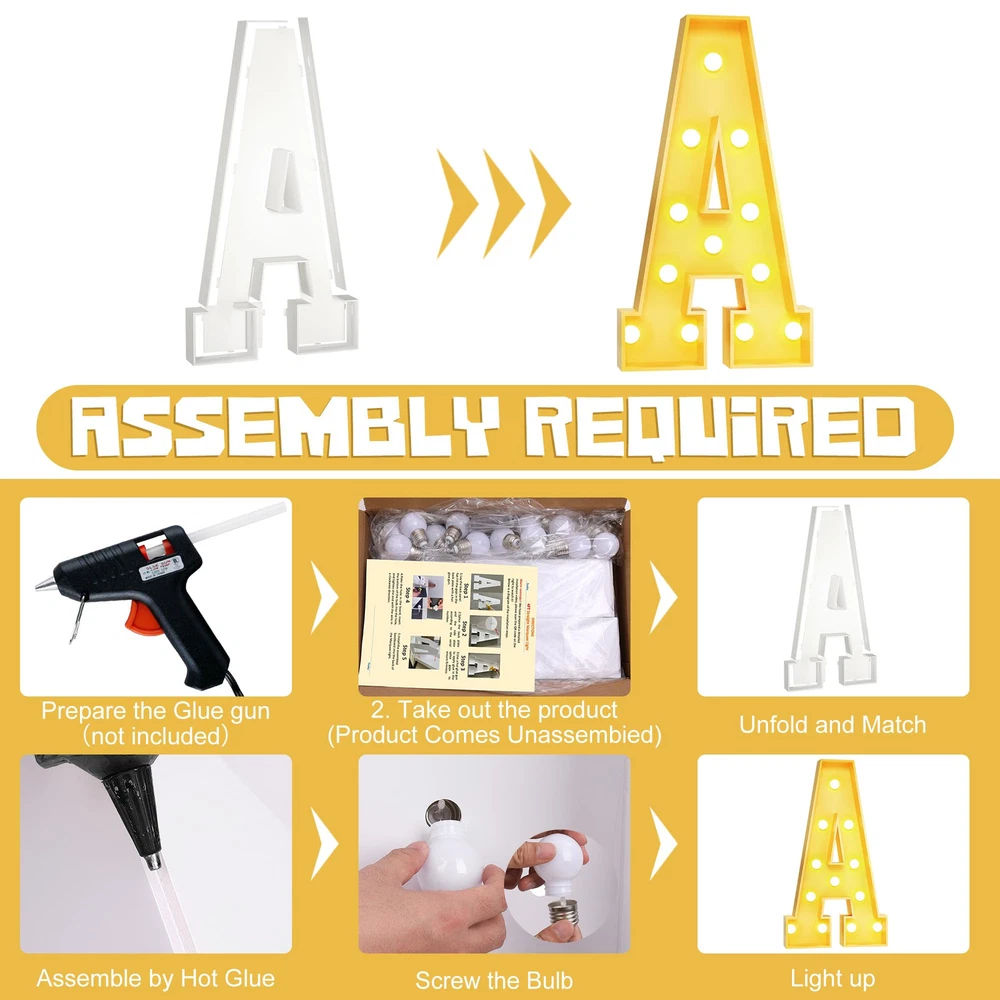 1 Packaging: You will get marquee letters pre cut foam boards, operating instructions, light string.The light needs to be equipped with 3xAA batteries.(Noted: Glue and batteries are not included) Marquee letters 4 feet tall: 4FT giant marquee letters is an attractive decoration for your birthday party decorations, wedding, and creating personalized activities. Easy to assemble: The pre cut marquee letters group has been set. According to the detailed operation instructions, it only takes 15 minutes to build the marquee letters. Stability and firmness: The 4FT giant mosaic balloon frame is made of solid foam board, with a fixed plate at the bottom, so you don't have to worry about it turning over. Satisfaction commitment: we will provide high-quality after-sales service, and we will be happy to help you set up the marquee letters!