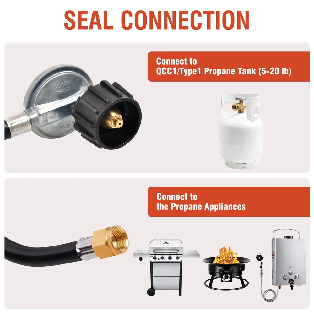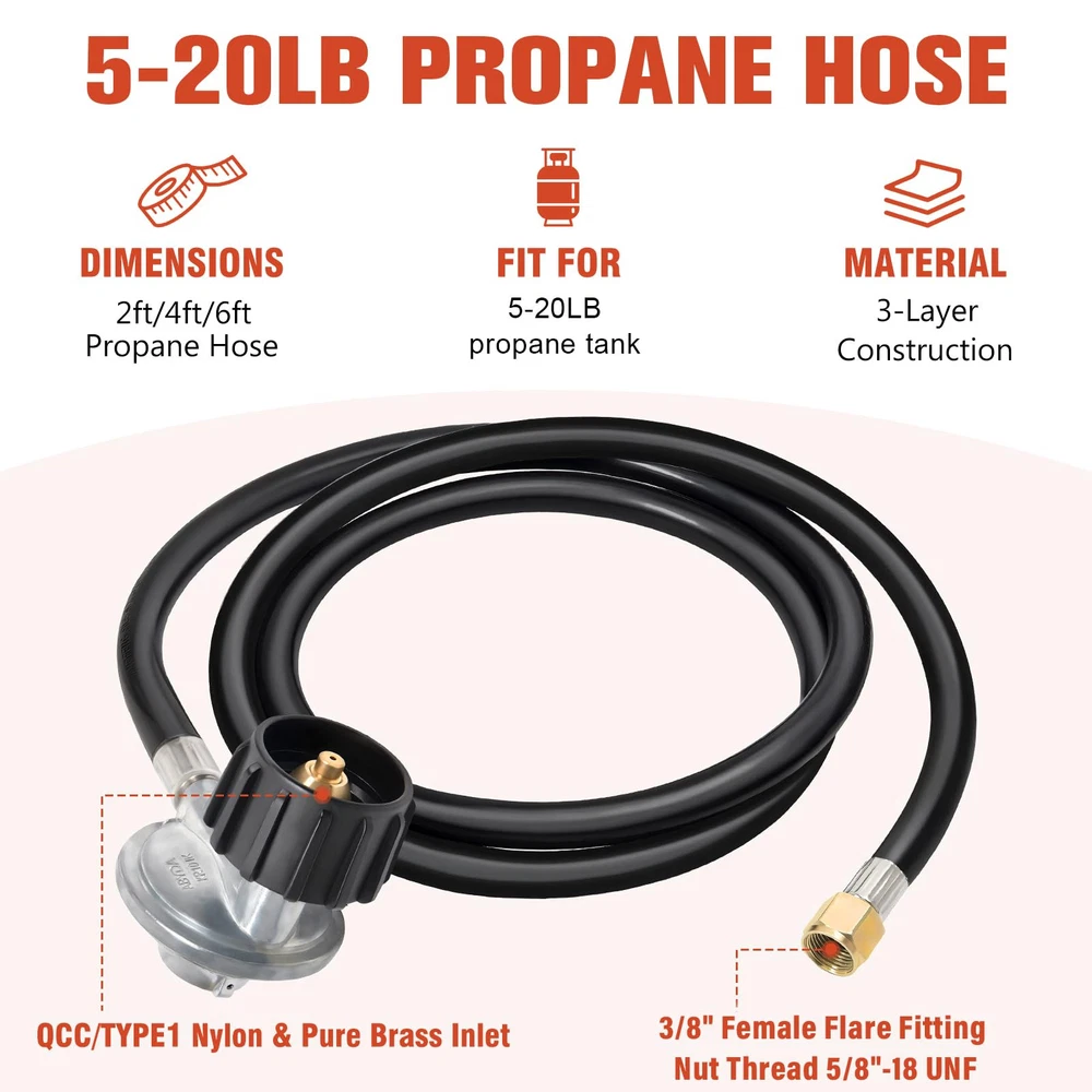 【Easy Installation】 Suitable for Type 1 (QCC 1) propane bulk tank and 3/8" male flare fitting. No tools required, equipped with a hand wheel for manual tightening. (Buy as needed:Fits all Balckstone Except 17/22" Table Top Griddle and 1LB propane tank) 【Durable & Sturdy】3-layer weather-resistant hose provide a secure and sealed connection for your propane appliances. 【Multi-Purpose】 Fits for Weber, Char-broil, Nexgrill, Monument, Dyna-Glo, Brinkmann grill, Blackstone table grill as well as outdoor propane grills( except 17/22"and 1LB propane tank), camp stoves, fire pits, water heaters gas grill, LP generator, lantern, two burner camping stove, side burner and other propane appliance. (Buy as needed:Fits all Balckstone Except 17/22"and 1LB propane tank) 【Safety & Corrosion Resistant】 CSA certificated - Pass CSA certificate for your safety. Provides secure, air-tight connection between grill or fire pit and tank, no gas leaks, ensures safety while using grill, no issues with regulator or gas, air flow is kept stable and at appropriate levels. 【Tips】 To avoid leakage issues, please check the propane tank, inspect the inside of the gasket for cracks or misshaping. And make sure the regulator enters the cylinder valve in a straight line. It is normal if you hear noise in the regulator, it is the resonance of the gas in the regulator.