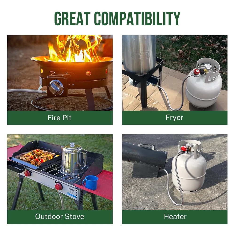 【Unsurpassed Gas Regulation & Stability of Gas Flow】 As ’s propane hose is equipped with an adjustable high-pressure propane regulator ranging from 0-20PSI, you can easily manage the flame depth and the heat degree of your grills, turkey fryers, fish fryers, burners, outdoor cookers & stoves, smokers, heaters, fire pits and propane forges. 【Built to Enjoy Durability & Longevity】 Featuring 4-layer hose construction, propane hose with high-pressure regulator is constructed from superb flame-retardant PVC and stainless-steel braid, which strengthens the propane hose’s sturdiness and its resistance to weather, tear and wear. 【100% Solid Brass Connections & Leak Proofness】 propane hose with regulator is at 4ft long and has a secure fitting with QCC1/Type1 propane tank connections. The other end of the hose is sealed with 3/8” flare fitting with an outside diameter of ⅝ inches, which fits for most propane appliances. Both ends of the propane regulator hose are accurately manufactured from high-quality brass to against corrosion and to provide an air-tight connection, ensuring 100% SAFETY! 【quality & CSA Certification】 Certified by CSA, the high pressure propane regulator with hose has a built-in protection device to automatically shut off to protect its users. What’s more, the propane hose is also known by its non-clogging inner tube to double the smooth delivery of gas flow from propane tanks to your fryers or griddles. 【1-Year 】hose regulator for propane tank are under 1-Year . As we value every customer’s voice and experience with our products and service, we provide 24hrs/7days non-stop customer support to you. Pls feel free to us whenever you are concerned about the product or after-sales service.