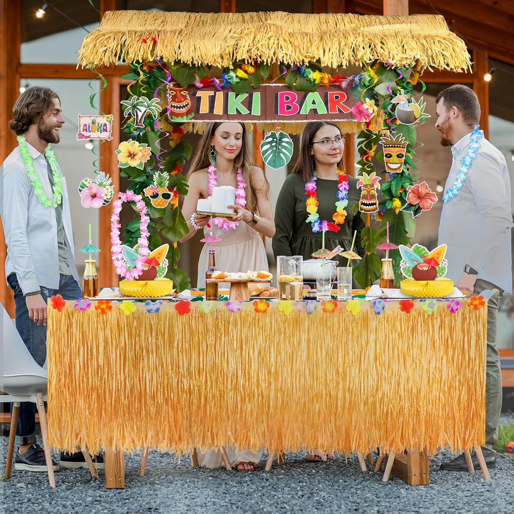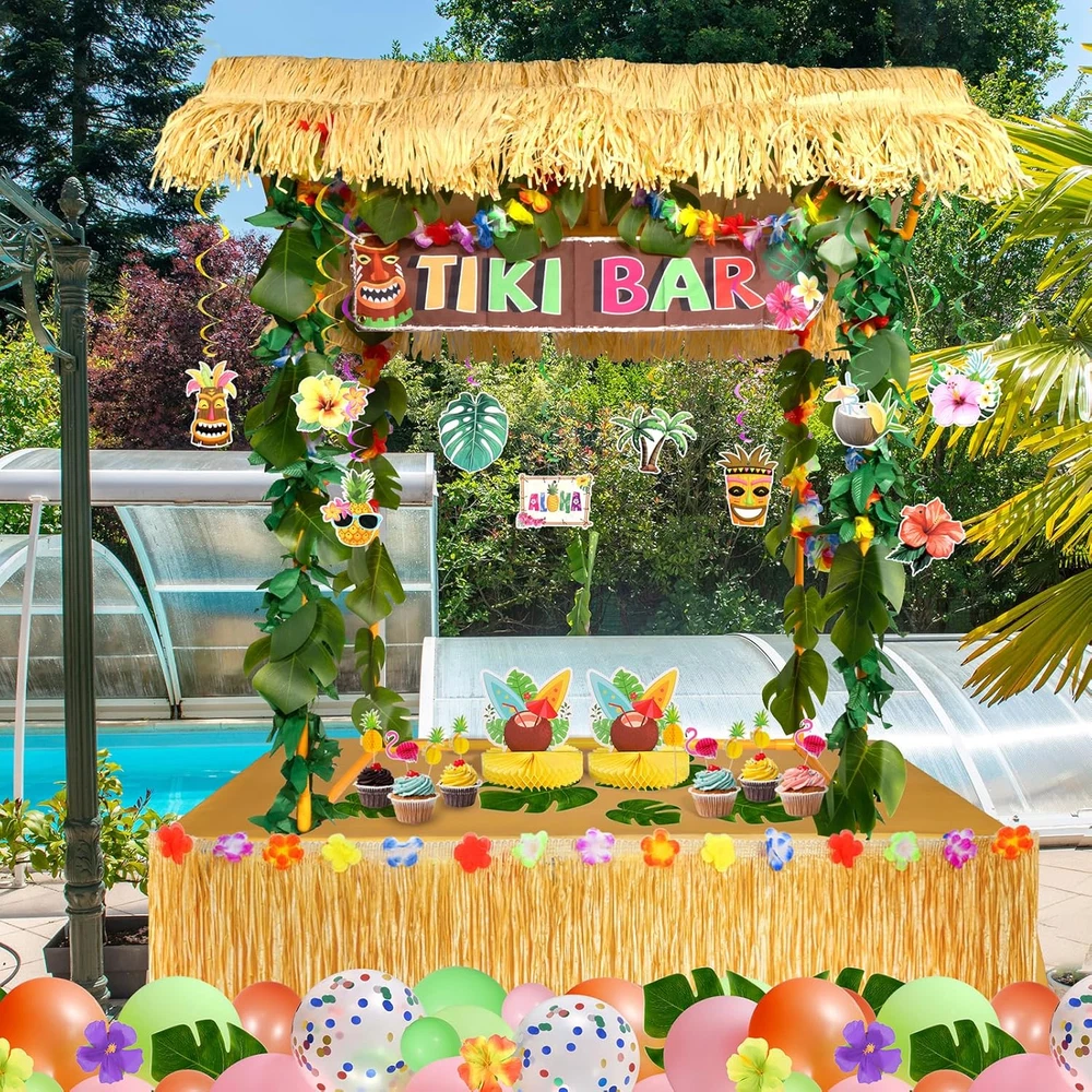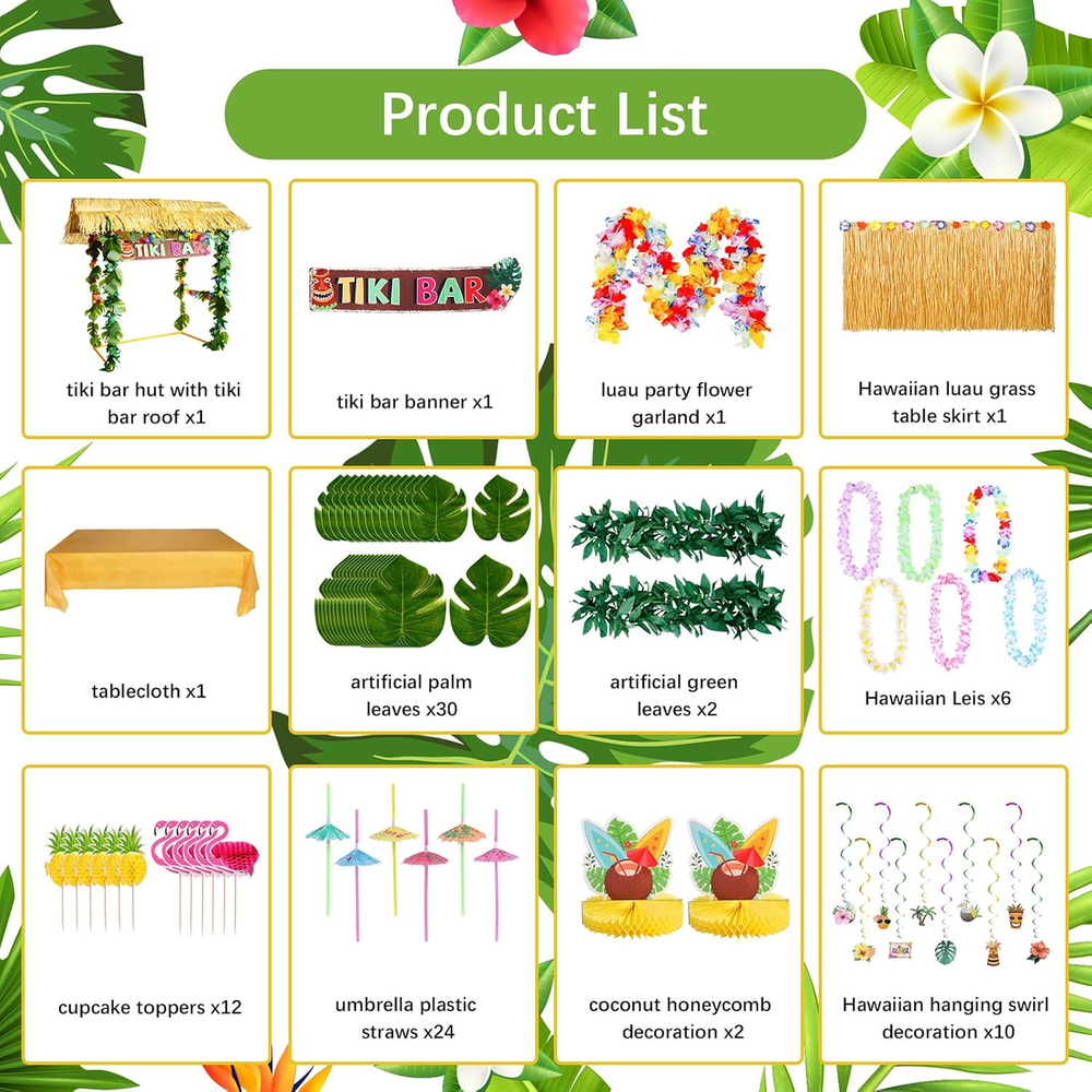All-in-One Tiki Bar Kit: Includes everything you need to create a stunning outdoor tiki bar setup: 1 tiki bar hut with roof, 1 tiki bar banner, 1 Hawaiian luau flower garland, 1 grass table skirt, 1 tablecloth, 30 artificial palm leaves, 2 artificial green leaves, 6 Hawaiian leis, 12 cupcake toppers, 24 umbrella plastic straws, 2 coconut honeycomb decoration, and 10 Hawaiian hanging swirl decoration Vibrant Hawaiian Flair: Hawaiian Leis - Made from soft, colored artificial flowers, add instant Hawaiian atmosphere. Great for greeting guests, photo ops, or table centerpieces! Hanging Swirl decoration - lightweight, twirling tiki decoration that dance in the fly, creating a festive atmosphere for poolside bars, patios, or indoor parties Easy Assembly & Reusable: Simple assembly with included instructions - attach the straw-style roof, wrap the grass table skirt, and hang decoration like palm leaves and Hawaiian hanging swirl decoration for instant tropical flair. Made from durable materials like PVC and non-woven fabric, durable and reusable Great for Any Occasion: Transform your space into a Hawaiian paradise - great for backyard BBQs, Beach weddings, Summer BBQs & birthday parties, pool parties, Hawaiian weddings, luau parties, beach gatherings and Photo booths & cocktail stations. This kit provides a festive atmosphere and serves as a focal point for serving drinks and snacks Size Information: The size of the finished tiki bar hut is 36.6 x 20 x 53.1 inches, Hawaiian Leis is 14/19 inch in different forms, table skirt is 108.7 x 29.5 inches, tiki banner is 33 x 7 inches, tablecloth is 86 x 51 inches, the flower garlands are 3m and artificial leaves strips are 1.5m. Great for transforming any space into a Hawaiian paradise