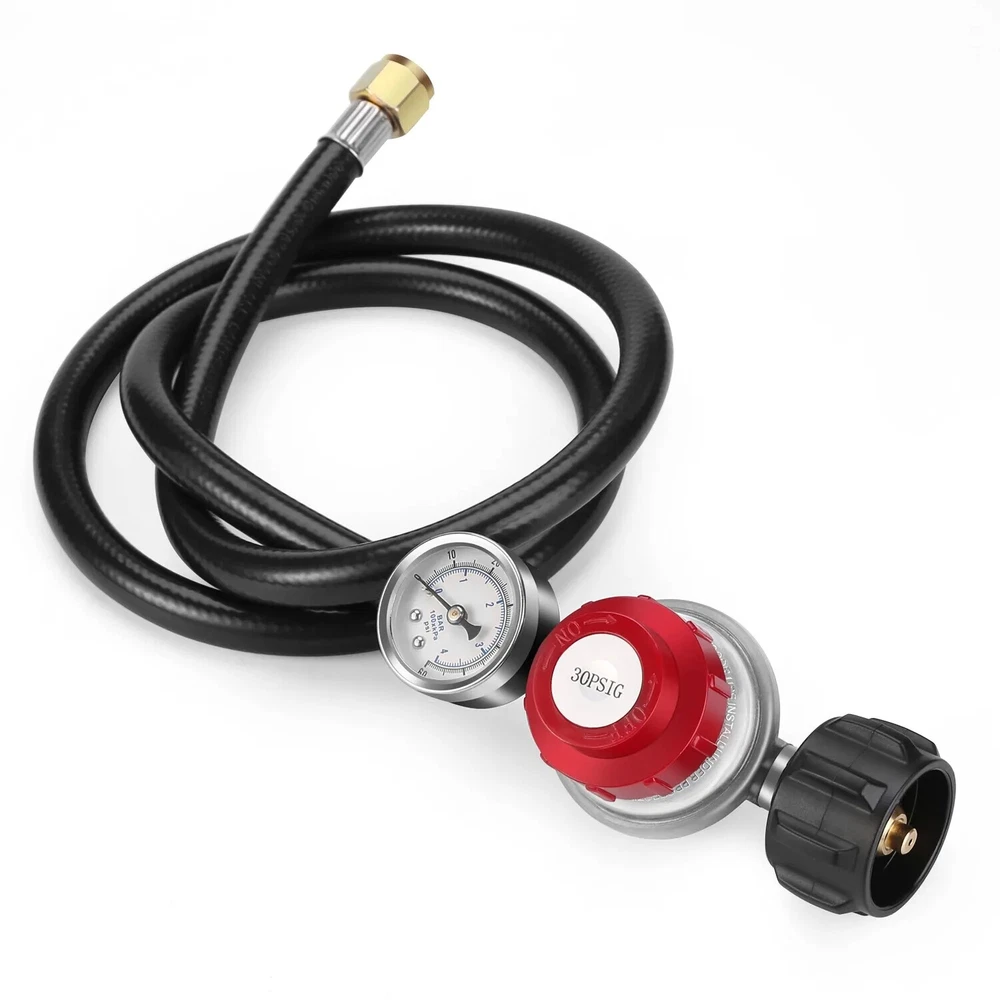 This Regulator Hose 0-30 PSI adjustable output is must have item for your propane burners, turkey fryers, heaters, smokers and all other propane appliances, Easy to use and good for secure gas flow, No gas leak, Simply connect and go, Extremely reliable. Output pressure 0~30 PSIG adjustable regulator .Hose measures 4 Feet long.Measuring from 0- 60 psi (as well as 1-4 100xKPA), the Pressure Gauge lets users control their heat with a precise level of accuracy. Easy and quick to install. Type 1(QCC 1) tank end connector & 5/8"-18 UNF outlet connection (3/8 inch female flare fitting has an outside diameter of 5/8 inch). 3/8" female flare fitting, fit for gas grills, gas stoves, turkey fryers, burners, smokers, cooker, fire pit, hot water heater, as long as your appliance connection is 3/8" male flare connector. 3/8" Female Flare Fitting has an outside diameter of 5/8", come with pipe fitting 3/8" flare M x 1/8" MNPT. Specifications: Material: PVC + Cuprum Length:approx. 123cm/ 4Feet Inlet Pressre: 25~250 PSIG Outlet Pressure: 0~30 PSIG adjutable Gauge reading: 0~60 PSI (1- 400 x kpa ) Adjustable Range: 0~30PSI Inlet connection: 3/8" Flare Fitting Male QCC(ACME) Outlet Connection: 5/8"-18 UNF Female flare swivel fitting (3/8" SAE) Max. flow capacity: 130,000 BTU/hr. Works with QCC1/ Type 1 propane tank. Note: For safety, please adjust it to 0 PSI (shut off the regulator.) Please do not apply this regulator to an appliance which supposed to equipped with a LOW PRESSURE regulator. What's included: 1 x Propane Regulator 1 x Adapter(3/8" flare M x 1/8" MNPT)