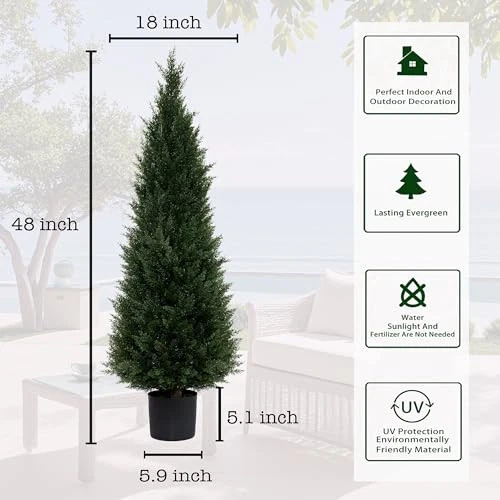 Return Policy Fast Delivery Trusted seller 4 Feet Artificial Topiary Trees 2-Set - UV Protection Potted Shrubs for Front Door, 6" Wide Heavy Duty Pots Faux Cedar Pines for Outdoor & Indoor Decor Product Description [Enjoy Realistic Full Topiary Trees] – Fabulous set of 2 upgraded quality faux trees. Perfectly modeled after lovely cedar and pine trees that grow wild in many parts of the US and Canada. These look like the real thing, but never require planting, water, fertilizer, or trimming. Simply set them out and enjoy. No need to place plastic bags over your cedars in winter like the neighbors. [Perfect for Outdoor Decoration] – These faux cedar trees for outdoor planters add a touch of elegance and realism to any outdoor setting. Being faux trees for outdoor planters, they are perfect for front porch artificial trees decoration. [Product Size] – These measure a tall 48" from bottom to top with a lush green appearance that always pleases. Trees are compactly packed in a thicker box for safe shipping. Set them out and allow a day or two for the branches to expand to their natural full look. Perfect for front yard, in planter boxes, along a walkway or driveway, or set indoors for a year round Christmas tree to add life and natural energy to any room. [Durable & Weatherproof] – Crafted from UV-resistant PE material, our artificial cypress topiary ball tree ensures vibrant color and prevents fading, making them perfect for both indoor and outdoor use without worrying having to worry about harsh weather conditions. [Great Gift Idea] – Makes a fun gift for anyone who wants to decorate their yard with easy natural looking faux trees and greenery. We use a thicker, higher quality pot and ship in a well packed heavy duty box. Many people are buying several 2-packs of trees to fully decorate their yard. They are selling fast after being spotlighted by professional landscapers as a great value. Shipping Returns Payment Shipping Shipping is FREE to all addresses other than APO/PO boxes in the lower 48 states. All our stock ships from US-based warehouses. Shipped via USPS or UPS (depending on location and package weight) Unless stated otherwise, all orders will ship within 24-72 hours of your payment being processed. Check our feedback to see the great reviews of FAST shipping we offer. Returns Seller does not accept returns Payment We currently accept payment via eBay managed payments only. Once payment is cleared, we will dispatch your shipment within 1-3 business days. Please refer to the "Shipping" tab for more information regarding shipping speed to your destination.