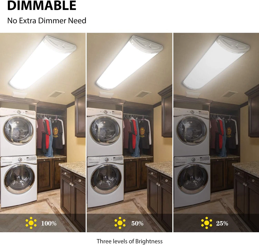 Control Method: App Installation Type: Flush Mount Brand: Does not apply Plug Format: A- US style Efficiency: High Mounting Type: Flush Mount Room Type: Storage Room, Laundry Room, Garage, Kitchen, Basement, Home Offic Batteries Required?: No Assembly Required: Yes Item model number: SUVELAM Shape: Linear Number of Light Sources: 4 Lighting Method: LED Shade Material: PMMA Shade Color: White Color Temperature: 4000 Kelvin Brightness: 8800.00 Number of Items: 1 Style: Art Deco Wattage: 80 watts UPC: 711181996272 Item Weight: 8.23 pounds Light Source Type: LED Special Feature: Super Bright, Instant On, Dimmable Included Components: 4 high quality integrated LED strips Light fixture form: Close to Ceiling Part Number: 1 Controller Type: Push Button gtin13: 711181996272 Indoor/Outdoor Usage: Indoor Fixture Type: Non Removable Specific Uses For Product: Laundry Room, Kitchen, Living Room Light Color: Neutral White Color: 4000K Material: Metal Power Source: Corded Electric Unit Count: 1.0 Count Voltage: 120 Volts Special Features: Super Bright, Instant On, Dimmable Switch Type: Push Button Type: Does not apply Bulb Base: GU10 Batteries Included?: No Product Dimensions: 48"L x 10"W x 3.3"H Recommended Uses For Product: Kitchen, Laundry Room, Living Room, Closet, Basement, Garage, Hom