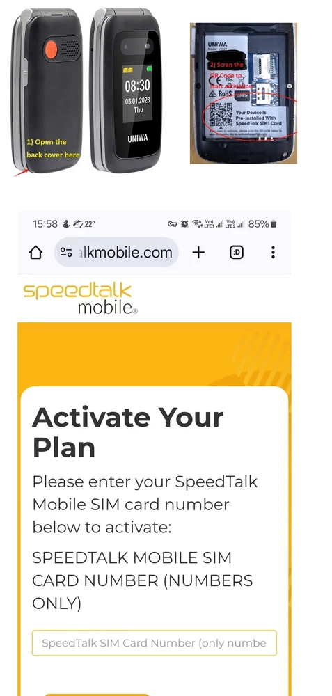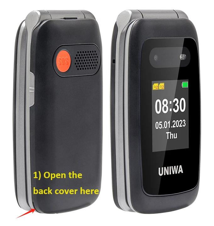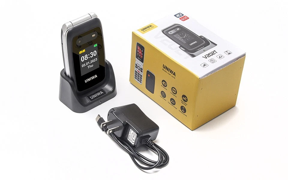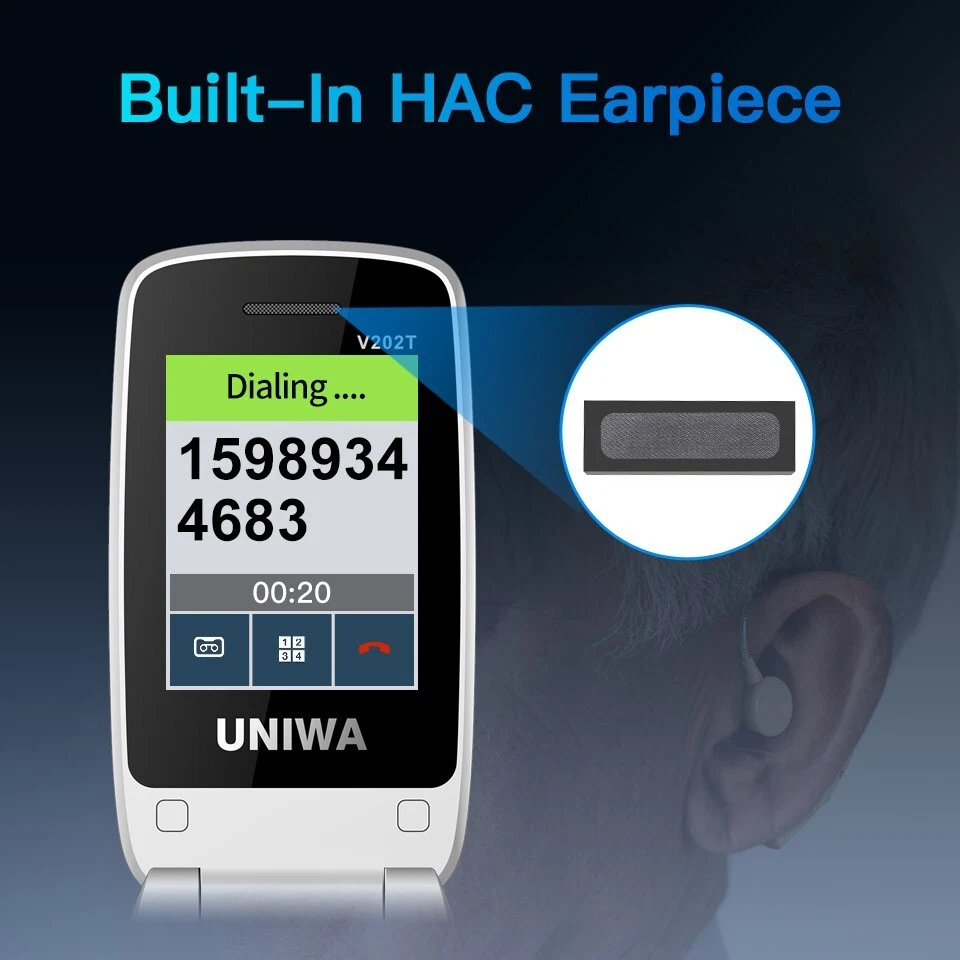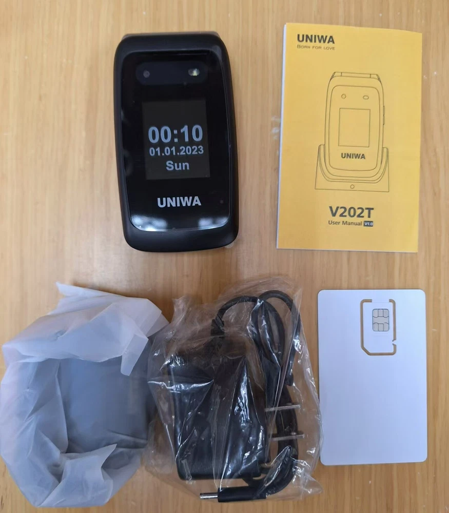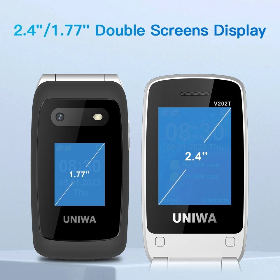 BASIC INFO Model No. UNIWA V202T Operating system RTOS (not smart) Style 4G flip senior phone Dimension 104*55*19.8mm Weight 113g (include battery) Material Plastic Color Black, blue, red Languages Multi-language HARDWARE Display Double screens: 2.4 inch QVGA inner screen, 320*240px; 1.77 inch, 160*128px outer screen Processor Unisoc T107 Cat.1 (T117 Cat.4 optional for OEM) RAM 48MB RAM ROM 128MB ROM, support TF card up to 32GB maximally Camera Single Camera: 0.3MP front camera Battery Removable 4.35V/1450mAh Li-ion battery Speaker 2030 BOX speaker (HAC support) Vibrator Support NETWORK & CONNECTIVITY Bands 2G: GSM 850/900/1800/1900MHz 3G: WCDMA 850/900/1700/1900/2100MHz 4G: FDD-LTE B1/B2/B3/B4/B5/B7/B8/B12/B17 B20/B28a/B28b/B66; TDD-LTE: B38/B40/B41 BT V5.0 WiFi & Hotspot Optional for OEM order GPS Positioning Optional for OEM order I/ O INTERFACES SIM slots *2 (Nano+Nano) TF card slot *1 3.5mm earphone port *1 USB Type-C port *1 OTHER FEATURES SOS Emergency Button Support preset 5 SOS emergency contacts and 1 emergency SMS Phonebook Number 2000 Torch light Support Wireless radio Support ACCESSORIES Battery *1 Charger *1 User manual *1 Charging Dock *1