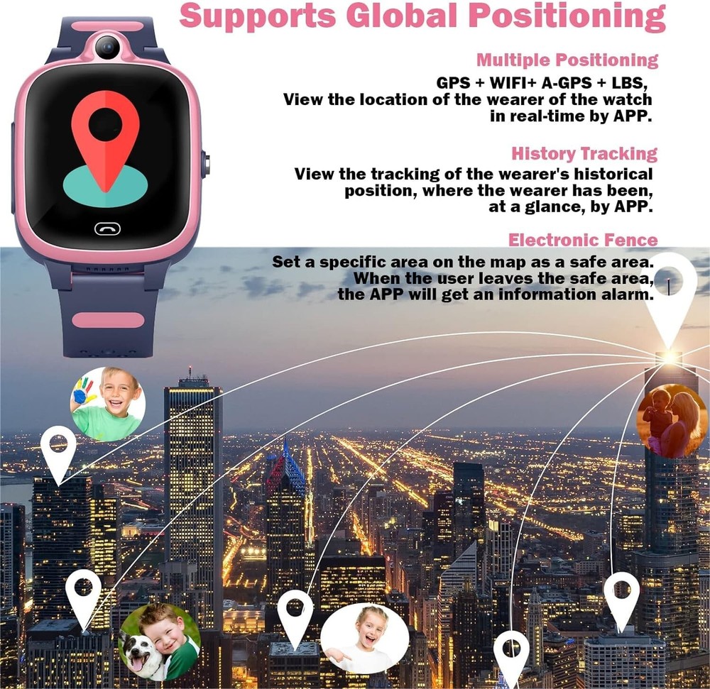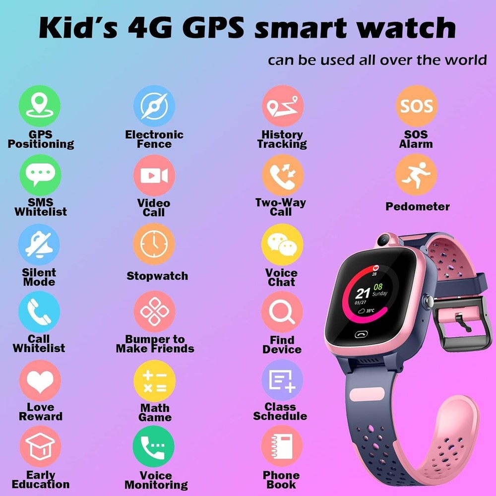 4G GPS Smart Watch for Kids Boys Girls Watches [Global Version] SOS Emergency Alarm Waterproof Smartwatch with Text Video Voice Call Watch Tracker Real Time Tracking Age 3-12 Multi functions waterproof children watch: The GPS watch can be worn in shower or rain. The main functions of the watch include real time GPS position/ call/ video call/ SOS call/ voice chat/ camera/ photo album, book/ alarm clock/ class mode/ safety fence/ pedometer/ historical route etc. This smart watch is a perfect Christmas, birthday gift for your girls and boys 4G GPS smart watch & anti-lost GPS tracker: The kids watch has a built-in GPS positioning device, a superb choice for personal safety. You can track your kids location in real time anywhere anytime; Historical Route Track: Past locations of the GPS watch in latest 90 days will be stored in system for your future checking;This smart watch is suitable for any country in the world, please rest assured to choose it Two-way call & video call: Besides serving as a kids GPS tracker, this kids watch can also work as a cell to make calls and video calls; The Cell GPS tracker supports 4G nano sim card. This 4g kids smart watch is compatible in android and iOS system; The 4G kids smart watch boys gps and calling support 4G SIM card:Speedtalk, T-mobile, US Mobile etc. Geo-fence & SOS call: You can set a safe area centering around the watch wearer, the watch will automatically raise an alarm in your application once the watch wearer leaves the area. You can also track multiple watches at the same time; SOS emergency call: The one-button SOS design,When encountering danger, Long-press the SOS button,it will automatically dial the emergency contact number. This smart watch is undoubtedly a good tool 4G gps smart watch for kids: This school smart watch supports 4G network, while most GPS watches on support only 2G network. 2G network has been shutdown in America, and you must get this watch with 4G compatibility that works perfectly in America. This is the reason why our price is higher than other GPS watches, 4G GPS watch needs much cost on the chip IMPORTANT: After installing the sim card on the waterproof 4g gps watch, the gps watch will automatically connect to Wi-Fi. If sos call watch still cannot connect to Wi-Fi, it indicates that the kids emergency watch is not online, and you need to manually set it online; The school watch has three positioning modes: GPS, LBS and WIFI. When the GPS and LBS signals are relatively strong, the Christmas gift watch will give priority to positioning through GPS and LBS instead of Wi-Fi Regarding product packaging: To ensure that customers receive products that meet their expectations, we use sealing stickers when sealing the products. Please check the packaging as soon as you receive the product to ensure that you receive the full new product 4G GPS Kids Smart Watch Realtime Tracking(GPS+LBS Multiple Positioning Modes) Call & Video Call & SOS Emergency CallWaterproof IP67Voice Messages: The watch and parents' cell can send voice messages to each other.Electronic Fence Alarm(Geo-fence ): You can set a safe area centering around the watch wearer, the watch will automatically raise an alarm in your application once the watch wearer leaves the area.Historical Route Track(Footprint Record): Past locations of the GPS watch in latest 1 will be stored in system for your future checkingmera Feature: Support photo taking, fun and Step Clock. Please read the user manual in the package carefully about how to make this watch working before you use it.