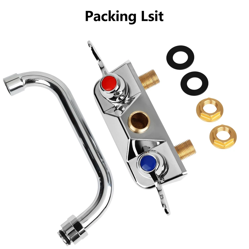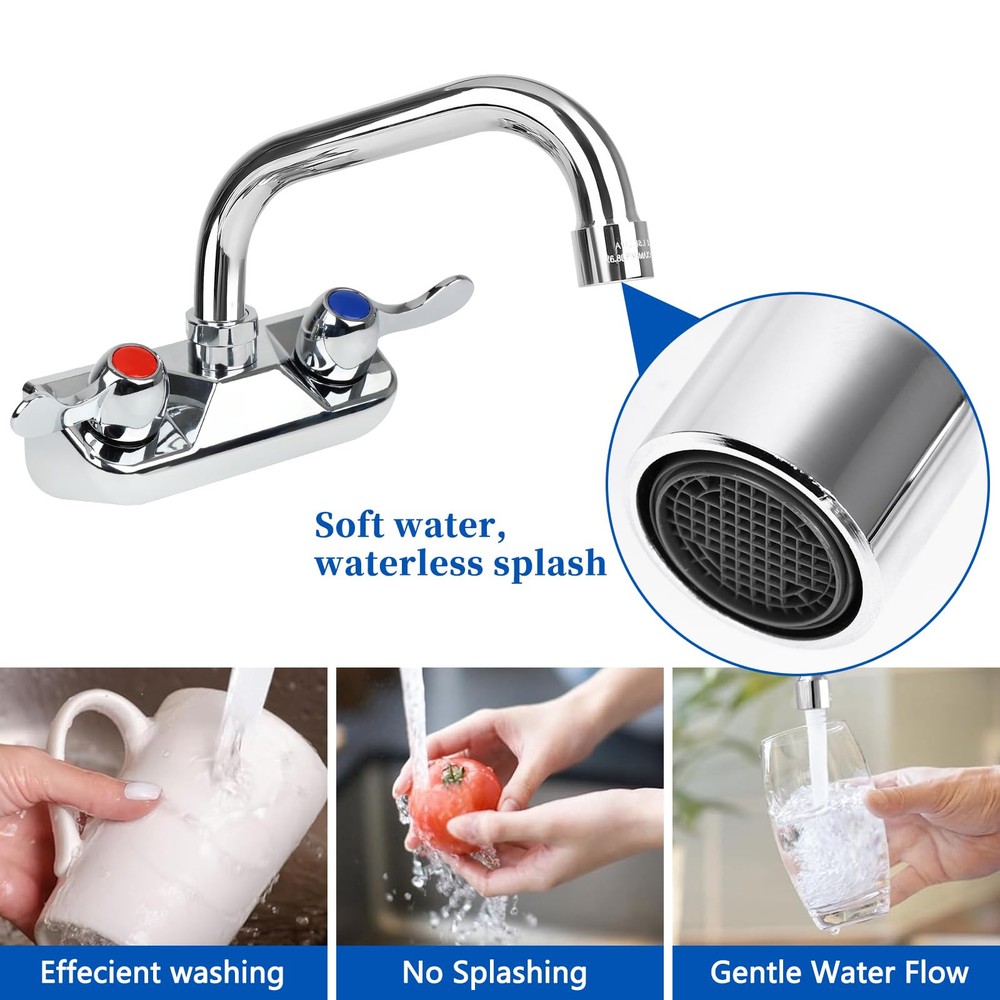 4 Inch Center Wall Mount Commercial Hand Sink Faucet Specification: Products Name: Commercial Hand Sink Faucet Type : Two lever Handle Faucet Hole Center: 4 Inch Mounting Type : wall-mounted/back splashed Material : Brass+ Stainless Steel Swivel Spout Reach: 6 inch Faucet Finish: Chrome Polished Faucet Handle Type: lever Valve: 1/4 turn durable ceramic valves Water Flow: Max 2.2 GPM Inlet Size: 1/2” NPT Male Polished chrome finish is highly reflective for a mirror-like look that works with any decorating style. Exceptional Durability Our kitchen faucet is designed ergonomically for high performance and comfortable, long-lasting experience. Durable internal parts like ceramic valves and double o-ring valve insures no leakage. Chrome Plated Finish Silver Series sink faucets remain rust-free and are corrosion resistant. Rusted taps look ugly and unhygienic in use. These faucets are easy to maintain their luxurious look with the chrome-plated silver finish. Design Features 4" spread center wall mounts for the perfect fit in commercial kitchens, bars, and hotels. It has three holes configuration with 6" swing spout flows water in your direction. 1/4 turn durable ceramic valves and 1/2" NPT male inlet. Package Included 1* Faucet Body 1* stainless swivel spout 2* Lock Nuts 2* Washers 1* Instruction 4 Inch Center Wall Mount Faucet -This commercial hand sink faucet with 4" spread center wall mounts are perfect for most commercial kitchen or bar, 6 inch swivel spout and 1/2" NPT male inlet make it ideal to use. High Quality Brass Constructed for Commercial Duty - Solid brass construction and polished chrome finish body for extra durability and longevity. It also includes reinforced double O-ring valves and ceramic cartridges that ensure that all leaks are prevented. Style with silver series faucets for kitchen sinks, bathrooms, outdoors, etc 360 Degree Swivel Spout - Max water flow is 2.2 GPM. Non-splashing coming. This Stainless 6”swing nozzle spout can be rotated 360 degree. Dual temperature lever handles control the faucet hot or cold water to anywhere you desire. Convenient Installation & Hustle Free - Simply apply seal tape (tape not included package) to the faucet inlets,and attach supply lines to the inlets. Just 15 minutes finish. (Note: please make sure the size of the water inlet is 1/2" NPT female. If different, we recommend you to look for a licensed plumber to assist you with converting the inlet for installation.) What You Get - 3 years warranty for our faucet main body. 2 lock nuts, 2 ribbed washers for you installing faucet. Any issue, please contact us from your order.