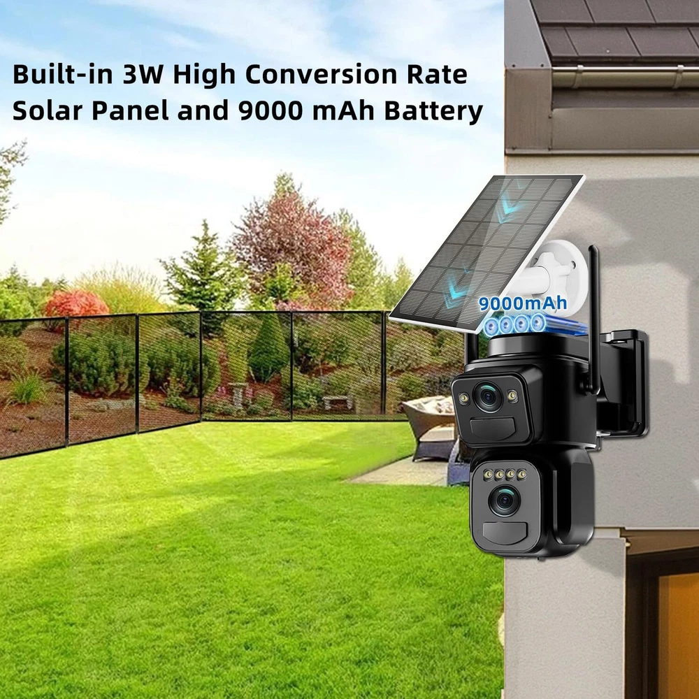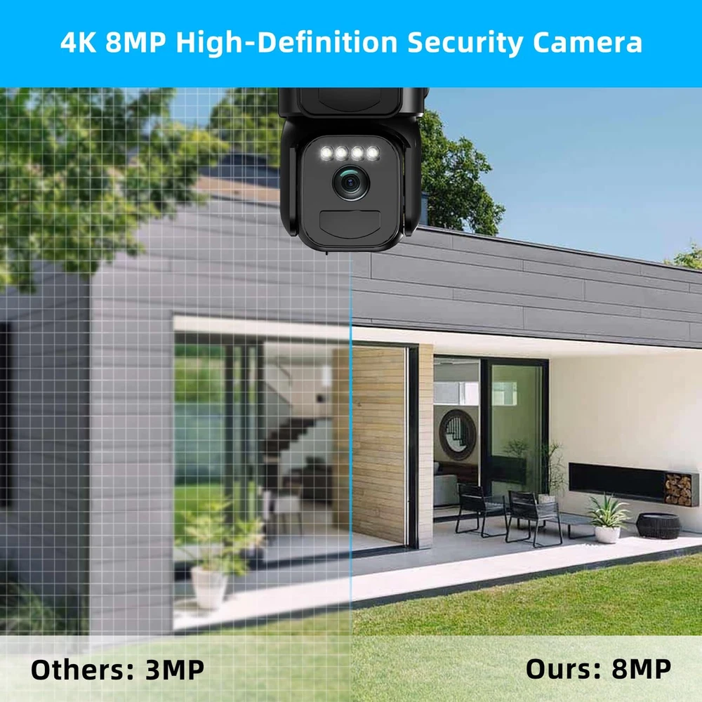 【4K HD Image & Color Night Vision】Outdoor solar security camera gives you 4K (3840 x 2160) Full HD, 8MP images and videos, sharper than other 2K or 1080P security cameras,You can Choose from 3 night vision modes. This outdoor camera was built-in CMOS sensor and IR lamp automatically detect ambient light and switch to color night vision mode for sharper detail and color images, even up to 65 feet of darkness. 【Dual Lens & 360°Coverage】This wireless outdoor wifi surveillance camera is equipped with two lenses that support 360° horizontal and vertical 90° PTZ rotation, providing you with 360° full protection with few blind spots. You can also manually rotate the security camera to see in different directions and remotely monitor any corner via the app to protect your belongings and family! 【2.4Ghz WiFi & Solar/Battery Powered】solar security cameras wireless outdoor supports 2.4Ghz Wi-Fi connection (5GHz not supported). With the solar panel, just connect the camera to the solar panel for continuous power supply. Built-in high-capacity battery allows continuous power supply through the battery even in bad weather or low sunlight, providing uninterrupted protection for your home for 365 days. 【2 PIR Motion Detection & Auto Tracking】Built-in sensitive PIR motion sensor effectively distinguishes human from other things and reduces false alarms. Once any abnormality occurs in the monitored area, you can receive a real-time push on your mobile phone. The solar camera outdoor wireless automatically tracks the movement of intruders and activates the alarm sound and spotlight to deter unwanted visitors.Support custom detection areas, only focus on key areas. 【2 Way Talk & IP66 Waterproof】With the latest IP66 waterproof rating, the outdoor camera can be used in extreme weather with a temperature range of (-4°F~122°F) without worrying about extreme cold and heat. In addition, solar camera also supports multi-user connection and multi-person sharing, just share the sharing QR code to your family and friends, then you can realize multi-person sharing to protect your home together.