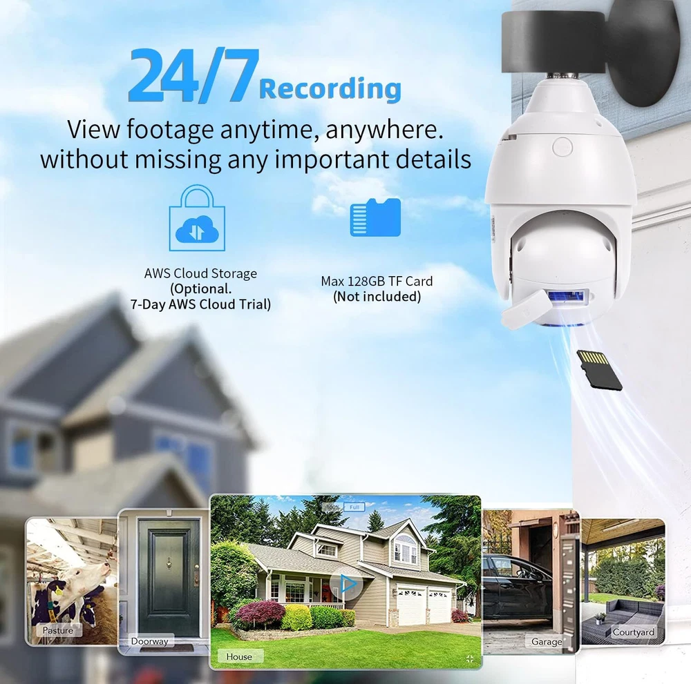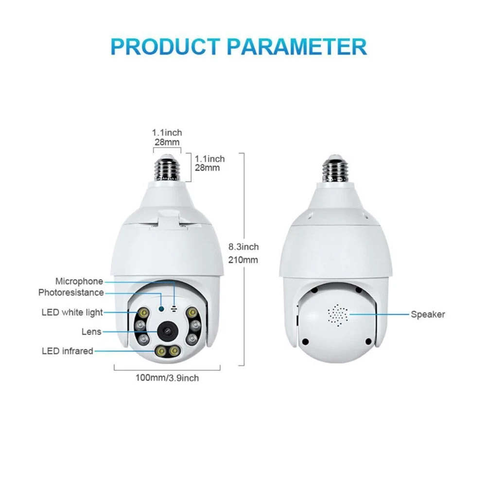 Please note that this camera is larger than a regular light bulb. Its height is 8.3 inches and its diameter is 3.9 inches. Please confirm that the size of this camera is suitable for the size of your light fixture before purchasing. [4K 8MP Ultra HD Video Resolution] : This surveillance camera produces 4K Ultra HD Video Resolution, it is built-in 4pcs IR LEDs+4pcs white LEDs with 31ft w/b and 65.6ft FULL-COLOR night vision, providing you with a super clear viewing experience. All captured by this camera will be presented to you via fluent and stunning videos. With 355˚ pan, 110˚ tilt, 4x digital zoom, you can remotely control the pan-tilt-zoom feature via the App anytime anywhere. [Wireless & 2.4Ghz and 5Ghz Wifi]: Compatible with E26 / E27 light socket makes it quite easy to install this security camera, screw this camera into a light socket(110V~240V), NO DRILL, NO WIRING, NO POWER CABLE, NO HARD SETUP, then open the free app to set up the camera within minutes. Perfect for Outdoor and indoor use! [ONVlF Conformant]: This IP camera is compatible with most other 3rd party software & Most NVR. Set a Password on the O-KAM App to Enable Onvif, RTSP address: rtsp://[username]:[password]@[ip]:10554, the username is admin. [Motion Detection & Auto Tracking & Real-time Alerts]: this PTZ dome surveillance camera adopts a highly sensitive motion sensor. If some people invade your home, this security camera will track the motion and record every single move, together with a VOICE ALERT if needed [Multiple View & Double Storage With Privacy Protection]: You could share your camera with friends and family to view simultaneously on your phone. Save videos to SD card ( Not included ) or cloud storage (3 days free trial every month ). With high-level encryption, your videos can be only viewed by you even if this wifi camera was stolen or broken, no one can access your videos