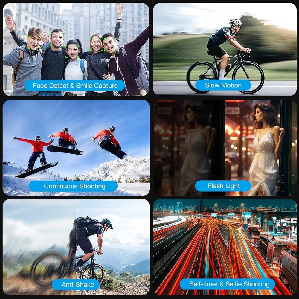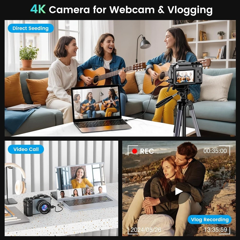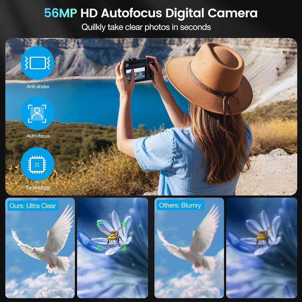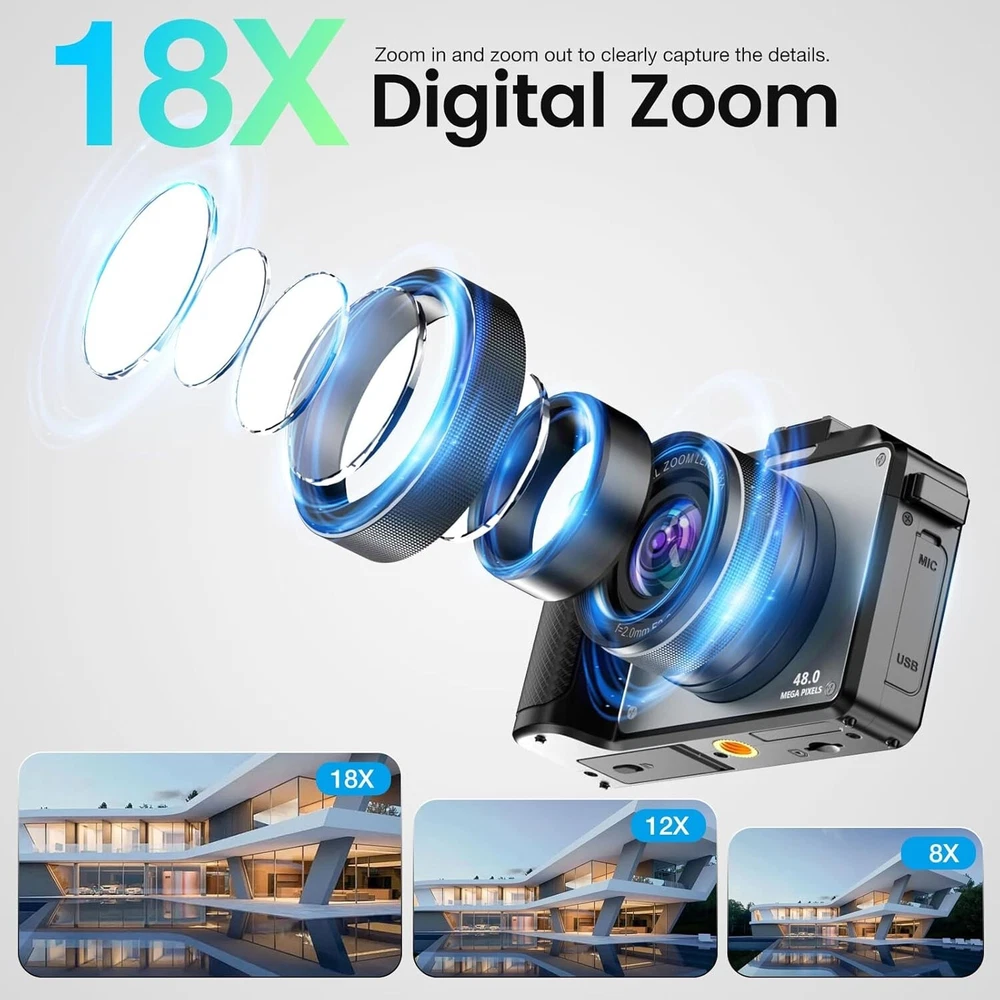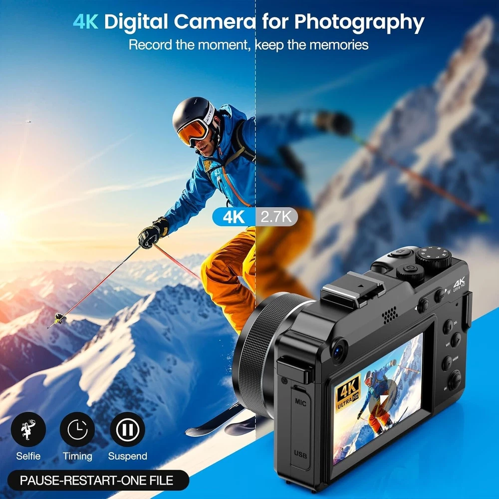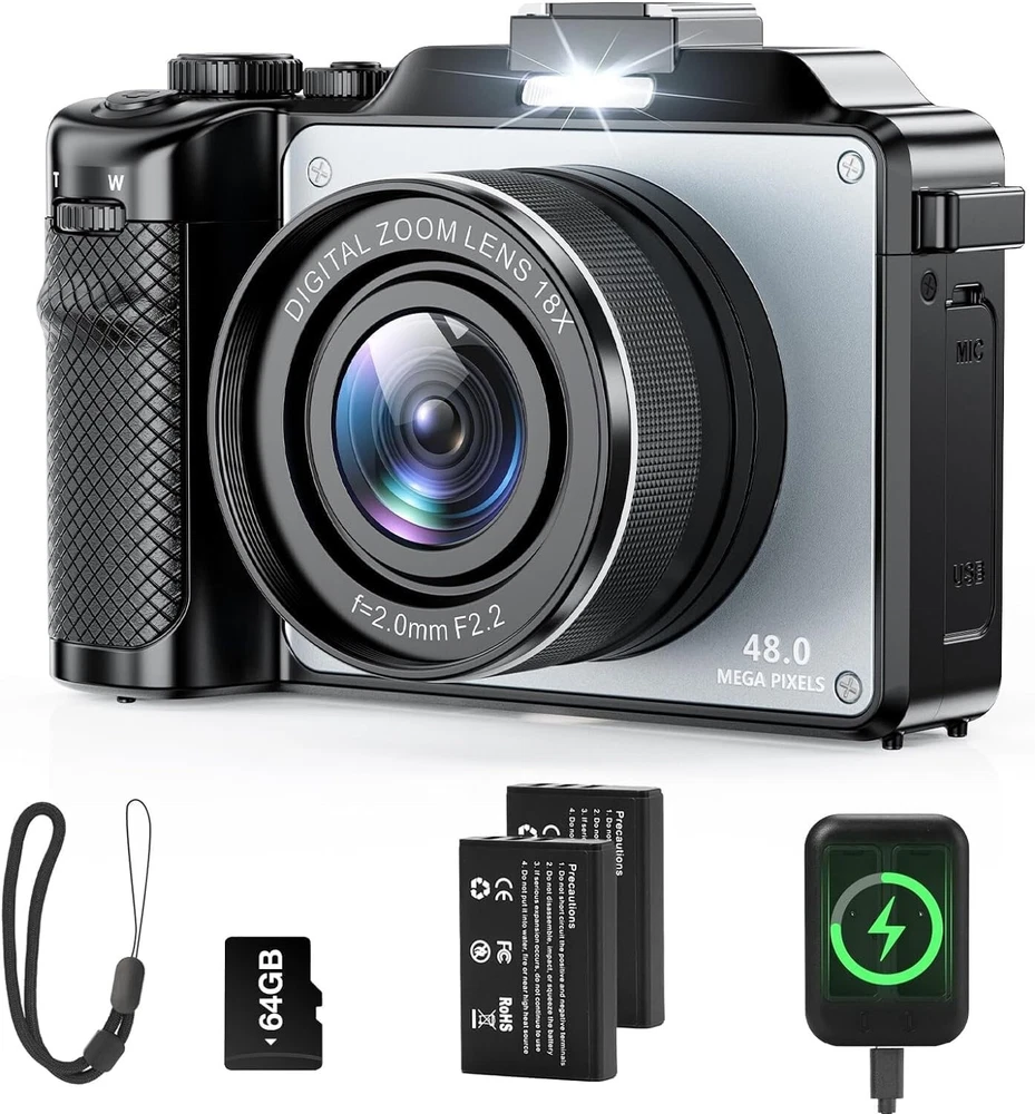 Color: Completely Black 4K Digital Camera for Photography and Video, 64MP Auto-Focus Anti-Shake Vlogging Camera with 18X Digital Zoom, Flash, Compact Travel Camera with 64GB TF Card, 2 Batteries and Battery Charger About this item 【4K 64MP & Autofocus Digital Camera】This digital camera for photography can be used for making 4k videos for YouTube features with 4K video resolution and capture ultra HD 64MP images, record every moment with high-quality images or video. Autofocus features make this 4k digital camera for beginners who want to quickly take HD photos, and take HD text or portraits up close without much work. Perfect for indoors outdoors. 【18X Digital Zoom Video Camera with Anti Shake】This camera for photography support 20X digital zoom, you can zoom in or zoom out the subject by pressing the W/T button while recording video and taking still images. This 4k digital camera transforms distant landscapes into crisp, clear images, to capture all the moments you want with clarity! 【4K Vlogging Camera with Battery Charging Stand】The vlogging camera for Youtube is equipped with 2 rechargeable batteries and charging stand, No need to stop taking images or videos due to camera battery is out of power, the charging stand can be carried anywhere in your handbags or pocket. We also offer you a 64G TF card, You don’t have to worry about which pictures to delete because the camera storage is too small. Every moment is precious! 【Webcam Function & WiFi Transfer & Pause Function】This YouTube video camera can be used as a Webcam, please insert the USB cable and switch the camera to "Webcam" mode, perfect for video calling, live streaming, blogging, vlogging, online teaching, etc. This 4k digital camera also has WiFi Transfer output. The pause function allows you to pause and then continue to record when recording. 【Compact Travel Camera & Flash】0.59 LB small compact camera for travel is the size of a palm, you can shoot photos or record videos for a long time without tired, and easily slip a travel digital camera into your bags. In addition, the digital camera for photography and video with built-in flash can take clear photos and videos in the dark, no matter it’s day or night, you won’t miss the moment captured by your camera!