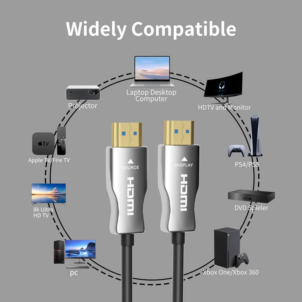 4K Fiber Optic HDMI Cable 35ft, High Speed 2.0 Cable, 35FT, Silver Product Details Product Dimensions : 5.51 x 3.94 x 2.36 inches; 2.12 ounces Item model number : SilverV2-FBA Manufacturer : MavisLink Brand: MavisLink Connector Type: HDMI Cable Type: HDMI Compatible Devices: DVD Player, Laptop, Projector, Television, Xbox Special Feature: High Speed ⚡️【High Speed HDMI Cable】This upgraded HDMI 2.0 cable adopts the latest fiber optic technology chip, supports bandwidth up to 18Gbps, transmits audio, video and photos at lightning speed without waiting for buffering. Fiber optic HDMI cable also supports Ultra HD 4K 2160p, ARC, HDR, HDCP 2.2, Dolby Vision. As a result, this HDMI cable provides enhanced depth, brightness, detail, contrast and wider color gamut for Ultra HD movies, giving users a smoother and clearer viewing experience. ⚡️【Immersive Cinema-like Sound Effect】The ARC feature of the Ultra HD Fiber Optic HDMI cable enables more advanced audio signal control. With Dolby Atmos and Dolby Vision enhancing audio details, you'll have an immersive multi-dimensional experience, giving you the best visual experience of Ultra High Definition while you would enjoy the movie theater quality sound. Plug and play, it is an essential HDMI cable for your home theater, friend gatherings and office equipment. ⚡️【Premium Construction for Durability】Our fiber optic HDMI cable features 24K gold-plated plugs for enhanced durability and resistance to oxidation. The high-quality metal shell design improves heat dissipation, while the lightweight PVC material allows flexible bending of the HDMI cord angle for long-term durability. The HDMI cables enable uncompressed and lossless signal transmission over long distances thanks to the natural resistance of optical fiber to electromagnetic interference. ⚡️【Suitable for Various Devices】Fiber optic HDMI cable is HDMI to HDMI interface and is compatible with all HDMI devices. Such as Apple TV, HDTV, XBox One, PS5, PS4, Blu-ray player, computer, laptop, monitor, projector, etc. It's also backward compatible with earlier versions of HDMI cable 1.4/1.3/1.2.