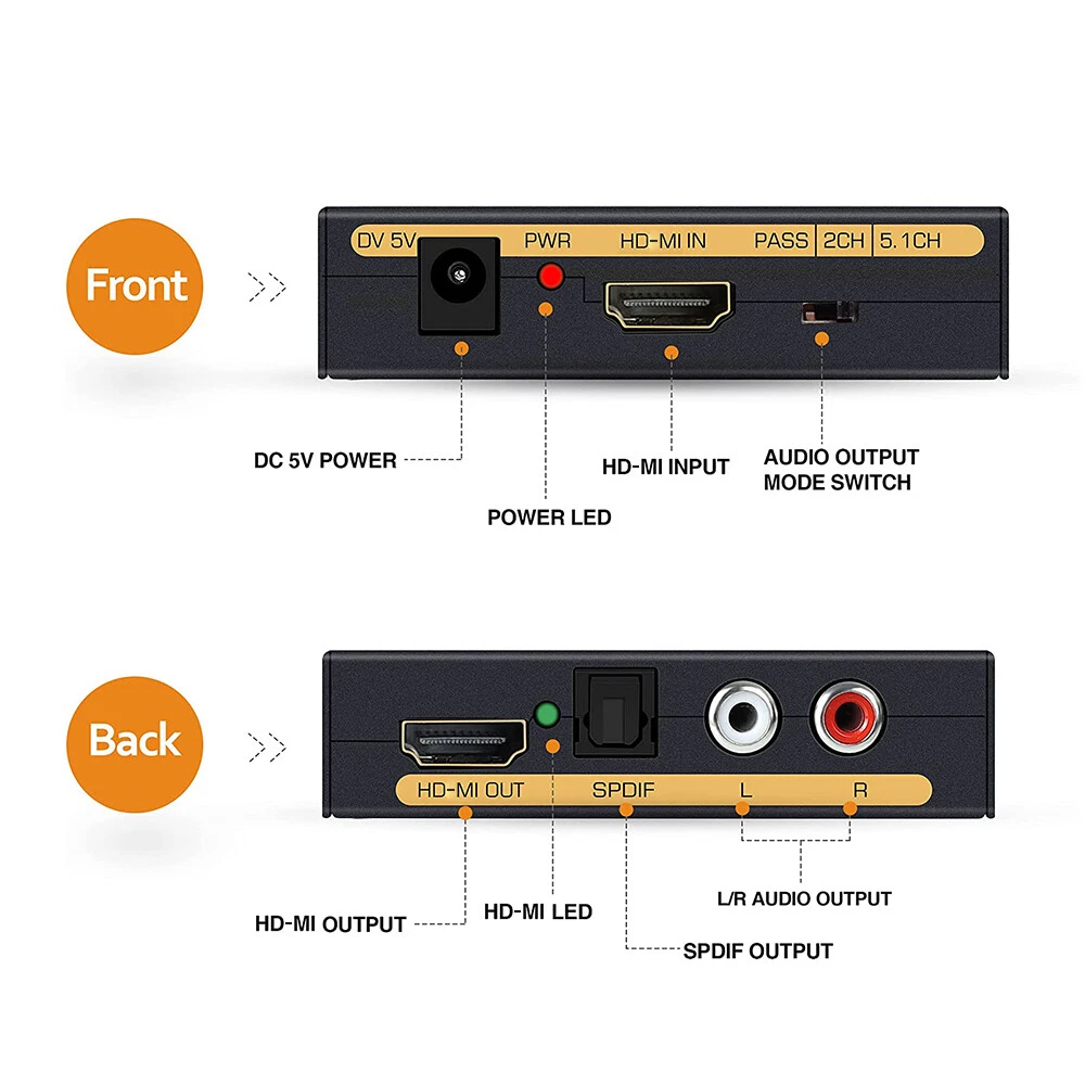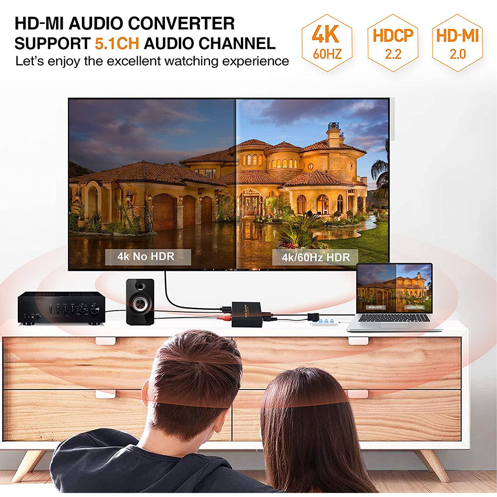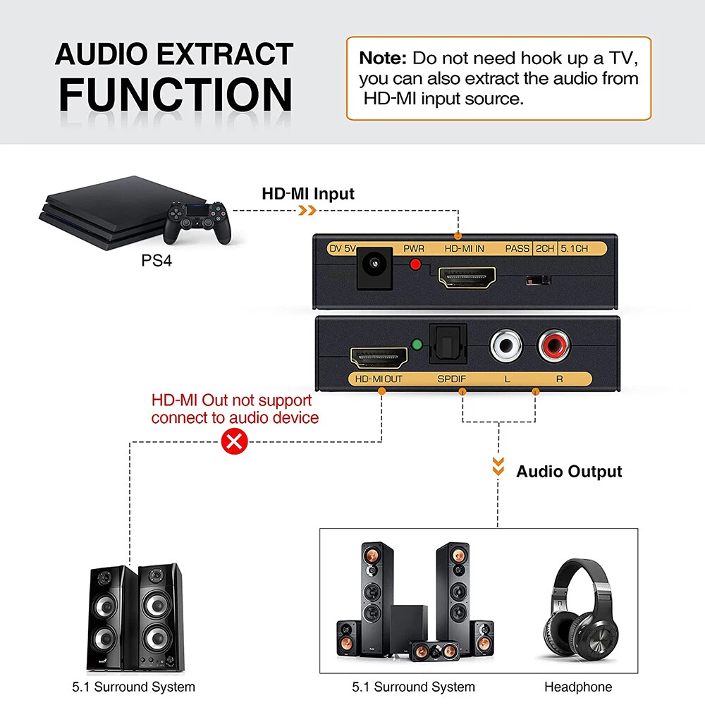 Home Arduino Module Sensor Chips About Us Features The 2-port HDMI Audio Extractor analyzes two HD Display/TVs connected to one HDMI source and also extracts the audio signal from the HDMI source. You can convert the original HDMI audio signal to digital optical or 2-channel analog audio output. This product supports Dolby Digital AC-3, DTS, LPCM and other digital audio formats output, which is a perfect audio extractor. HDMI Audio Splitter Extractor: [Upgraded 4K@60HZ version] avedio Link HDMI to HDMI Audio Extractor Converter can extract audio from digital HDMI signals to amplifiers, Soundbar, speakers, etc. via optical SPDIF or RCA L/R stereo audio output. It allows separate output to an audio receiver without powering up the HDTV/monitor. 4K 60Hz High Resolution: HDMI 2.0 Sound Insertion Extractor supports up to 4Kx2K@60Hz, HDR 10, HDCP 2.2, YUV 4:4:4, 3D, 36-bit deep color and 18 Gbps bandwidth. Gold-plated eco-friendly interface adds audio stability.HDMI audio splitter adapter delivers impressive high quality HD video for a stunning visual experience. Three audio output modes: HDMI audio extractor adapter has three audio modes to choose from PASS, 2.0CH, 5.1CH. RCA L/R output supports PASS, 2CH PCM, LPCM stereo audio; optical SPDIF output supports PASS, 2CH PCM, 5.1CH Dobly Digital, Dobly True HD, DTS-HD, DTS. note: this HDMI sound extractor is not supported. Widely compatible: HDMI to HDMI audio converter works with various HDMI source devices. HDMI input: Blu-ray player, DVD, HD player, cable/satellite box, Apple TV, PS3/PS4/PS5, Xbox, PC/laptop, HD camera, Fire Stick, Roku, HD DVR, etc. HDMI output: Full HD TV, monitor, projector. Audio output: speakers, amplifiers, loudspeakers or other sound systems. Specifications Product name: HDMI Audio Splitter Resolution: 4K 60Hz Interface type: HDM| interface / optical interface / double lotus interface Power input: DC 5V2A Product Size: 8.45*6.18*2.1cm Product material: metal Product Color: Black Packing list 1*HDMI audio splitter 1*USB cable 1*User manual Payment Shipping Refund Payment We accept PayPal only. But we only Accept your Ebay Address ,Please Make sure it's 100% right. Payment must be received in 5 business days of auction closing. Please leave note for your special request (e.g. Colors or Size) in PayPal when you pay the order. Any special request cannot be accepted after 24 hours of payment, because most of orders will be processed instantly and same day dispatched. Shipping Fill your shipping info Refund All package need to wait 30 days (US only n eed 7-10 days) , Please take care it.Less than 30 days,we can't take a refund . If the item is defect when you receive it or you are not satisfied with it, please return it within 14 days for a replacement or money back. But the items must be back in factory condition. Please contact us and double check the return address before you return it. If is item is defective in 12 months, you can return it to us. We will send you a new replacement after receiving the defective item.