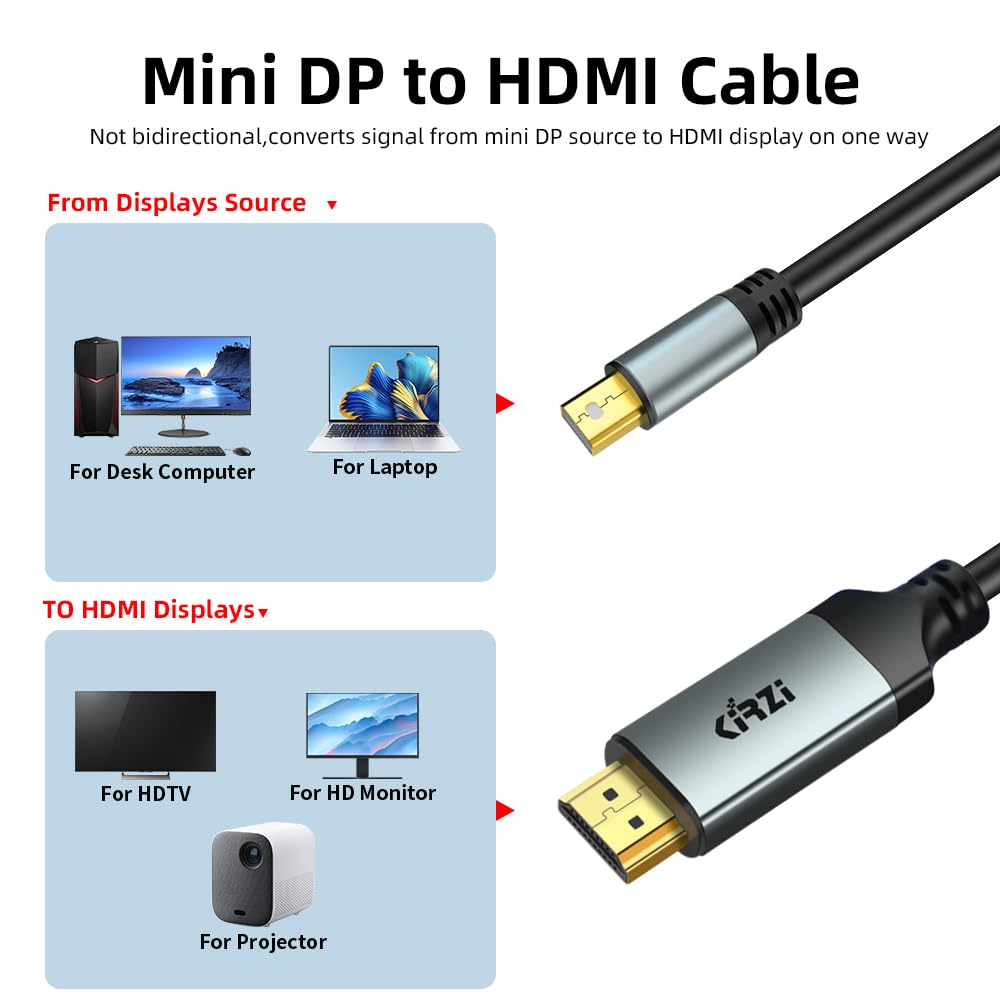 Versatile Connectivity: This A ctive mini DisplayPort to HDMI cable enables seamless connection between devices with Mini DisplayPort output and HDMI input, allowing high-definition video and audio transmission. Premium Construction: Crafted with durable materials and reinforced connectors, this cable ensures reliable performance and longevity. High-Speed Data Transfer: Supports resolutions up to 4K at 60Hz, providing crystal-clear visuals for gaming, movies, and multimedia applications. Compact Design: The sleek and compact form factor allows for easy cable management and portability. Plug and Play: Simply connect the cable between compatible devices for an instant high-quality audio/video experience. Product Description Active mini dp to hdmi cable Active Mini Display Port(Mini DP/MDP) to HDMI Cable is an indispensable companion for your Mac, PC, or tablet equipped with Mini DisplayPort. Connect your laptop or tablet to an HDTV for ultra-high definition video (4K @60Hz) and audio streaming or to a 4K monitor or projector. The low-profile connector with molded strain-relief design increases durability. Compatible with Mini DP & Thunderbolt 2 Apple MacBook 2010, MacBook Air (2009-2017), MacBook Pro (2012-2015), iMac (2011-2015), Mac Mini (2010-2014), Mac Pro (2009-2013) ThinkPad X1 Carbon 2015/2016/2017, X230/X240s, L430/L440/L530/L540, T430/T440/T440s/T440p/T530/540p, W530/W540,Helix XPS 13/14/15/17, Latitude E7240/E7440, Precision M3800; Alienware 14/17/18 Microsoft Surface Pro/Pro 2/Pro 3/Pro 4/Pro 5/Pro 6, Surface 3, Surface Dock, Surface Book, Surface Studio (NOT Surface/Surface 2 for Windows RT) Acer Aspire R7/S7/V5/V7, HP Envy 14/17, Google Chromebook Pixel, Other devices with Mini Displayport (Thunderbolt 2) port Multi function: Support AMD Eyefinity Multi-Display Technology. Support resolution up to 3840x2160 (4K) Ultra-HD @ 60Hz, including 2560×1600, 1920×1080, 1920×1200, 1440×900, 1280×720, ect. HDMI 2.0a data rates to 18Gbps, Mini DisplayPort 1.2 and 1.3 to 5.4Gbps/lane. Support one screen, two screens, three screens, four screens, five screens, six screens. Two Mode available: Mirror Mode, Extended Mode. support 4k@60hz -high-end chip: PS176 -Multi-shielded cable -Self-powered, no external power required -Supports display resolution up to 4096 x 2160 at 60Hz frame rate with 24-bit color -Includes on-chip microprocessor with internal SPI ROM -Supports RGB up to 12 bpc, YCbCr 4:4:4, 4:2:2 and 4:2:0 up to 12 bpc -Supports content protection formats HDCP 1.4 and HDCP 2.2 -HDCP 1.4 and HDCP 2.2 repeater function with on-chip keys -Supports TMDS scrambling for EMI/RFI reduction -Supports SCDC (Status and Control Data Channel) -Audio support up to 8 channels LPCM