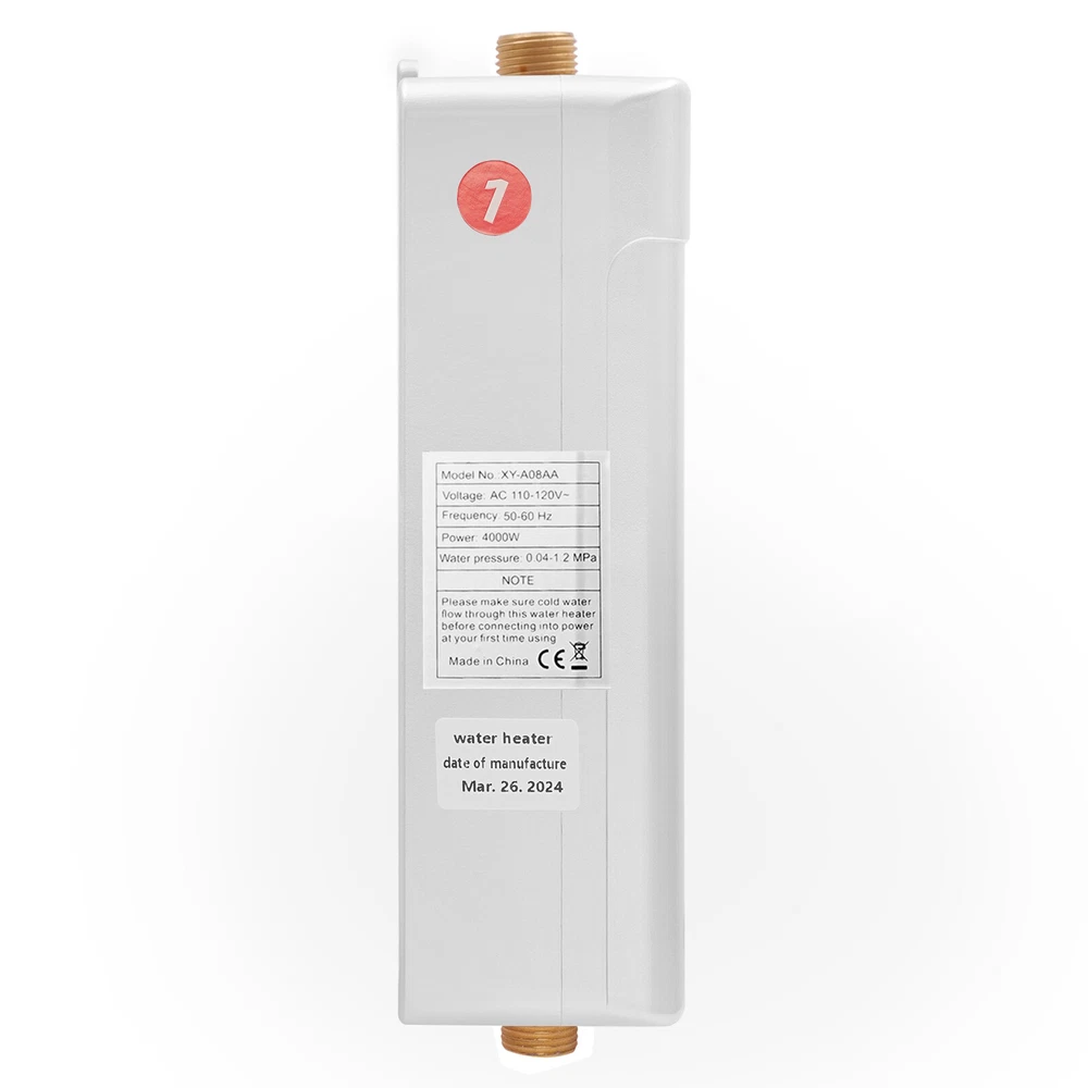 Package Included 1* Electric Water Heater 1* Remote Control 1* English Manual All Accessories for Assembly 4KW Electric Water Heater, Under Sink Instant Calorifier+ LCD Touch Screen NEW Description The exquisite electric water heater can bring you luxurious and comfortable water enjoyment, elevating your daily water use to a realm of elegance and convenience. Its streamlined design is ergonomic and blends seamlessly with the aesthetics of the kitchen, reflecting the ideal harmony between form and function. Its advanced heating technology ensures a steady supply of water at your desired temperature. Key Features Build to Last: It is mainly made of high-quality ABS and aluminum, making it insulating, strong, solid, wear-resistant, and not easy to deform, ensuring a long service life. High Efficiency: The 4000W of power and the fast heat-conducting aluminum heating tubes provide you with hot water in short time without storing water and preheating, avoiding long waits. The AI intelligent thermostat chip will quickly match the heating power required for washing according to the inlet temperature, outlet temperature, and water storage volume without having to endure hot and cold fluctuations. Safety First: It has IPX4 waterproof rating, anti-electricity wall protection, water and electricity separation technology, high-temperature dry burning, fault alarm, anti-high voltage protection, leakage detection, which ensures the safety of use. Thoughtful Design: The included remote control allows you to switch on and off and set the temperature(82.4-131°F) within 3.28-6.56ft , and the temperature can also be adjusted by touch screen on the body, plus it has a temperature memory function to meet your usage habits. Energy-saving: It uses an electric water heater with an inverter design that automatically adjusts the power input based on flow rate and temperature settings. When the water flow is reduced, the system consumes less electricity for energy-saving. Compact and Space-saving: With its compact size (5.31*2.56*9.45 inches) and simple structure, you can mount it vertically on the wall or under the sink/cabinet without taking up too much space. Ideal Gift: Thanks to its excellent performance, you can give it as a holiday, birthday, or housewarming gift to your family and friends. Protective Package : We have used a sponge to wrap this product, designed to minimize damage to the product during shipping. Details LCD Screen: It shows the temperature clearly and makes it easy for you to see. Cold and Hot Water Inlets: They make it easy for you to link water pipes, faucets or shower heads. Pre-drilled Holes: They make it easy for you to install the product. Application It can be used in homes, schools, hospitals, offices, bars, kitchens, bathrooms, public restrooms and laundries, etc. Specifications Color: White Style: Modern Shape: Rectangular Assembly Required: Yes Mount Type: Vertical Power Source: Corded Electric Material: ABS and Aluminum Model: XY-A08AA Voltage: AC 110-120V Frequency: 50-60Hz Power: 4000W Pressure: 0.04-1.2MPa Waterproof Level: IPX4 Screen Type: LCD Pipefittings: About 2cm/0.787in Temperature Adjustment Range: 28-55°C/82.4-131°F Operating Temperature: 30-50°C/86-122°F Remote Control Range: 1-2m/3.28-6.56ft Remote Control Battery Type: 2*AAA Batteries(Not Included) Product Size: 13.5*6.5*24 cm/5.31*2.56*9.45 in Package Size: 31*22.5*10.5cm/12.2*8.86*4.13in Gross Weight: 1.8kg/3.97lbs Net Weight: 1.6kg/3.53lbs Package Included 1* Electric Water Heater 1* Remote Control 1* English Manual All Accessories for Assembly Notes Please note this product is suitable for sinks but not for showers. Please note that this product must first run water before electricity. It is advisable to install this element vertically to ensure a long service life. The heating temperature depends on the flow rate and incoming water temperature. Please read the English manual and the label on the body of the product carefully before use and pay particular attention to the safety instructions contained therein. Please allow the slight color difference caused by the shooting light and 1-3cm error due to manual measurement, and make sure you do not mind before ordering. Payment Delivery details Terms of sales About us Contact us Payment We accept ebay payment 。 Fees such as import duties, taxes are not included in the item price or shipping costs. These charges are the buyer's responsibility. Delivery details Shipping: 2-9 working days to: USA Terms of sales We maintain high standards of excellence and strive for hundred percent customer satisfaction. Feedback is very important to us. We hope that you contact us immediately before you give neutral or negative feedback, so that we can address your concerns. It is impossible to address issues if we do not know about them! About us Your satis faction is our ultimate goal. We work hard to earn your trust and future business. Our certified technicians have tested each item before shipping. The unit comes with 1 year limited warranty on all manufacturing defects. a) If you receive a defective item, you may return it or ask for a discount. Please contact us within 14 days after you receive the package. b) What you returned must be intact and in its original packaging as re? u. Customer is responsible for shipping costs of the returned item. c) We will cover the cost of shipping back t with the shipping rate indicated in the registration page. We will send you a new unit or refund the full payment you paid. Thank you. Contact us Business Hour Business Hour: Monday To Friday: 8:30 AM to 5:00 PM (Beijing China time) Due to time zones, our reply to your questions may not be immediately. But within above working time, we will reply your email within 24 hours. If it's non-workdays, please kindly be patient and wait till Monday. Please contact us with ebay message. Please feel free to contact us if you have any questions. Monday To Friday: 8:30 AM to 5:00 PM (Beijing Ch