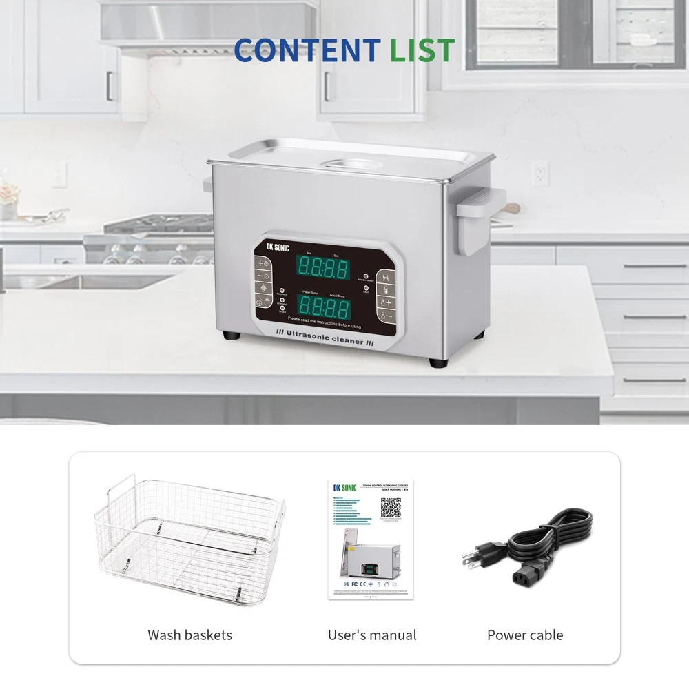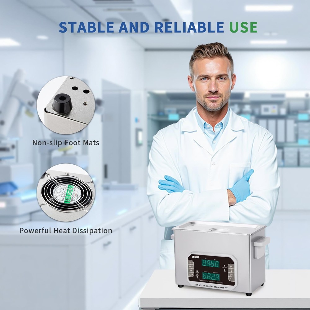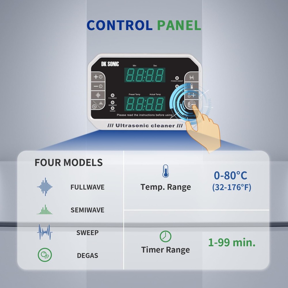 is a professional manufacturer of ultrasonic cleaners and has focused on the R&D of ultrasonic cleaners for more than 10 years. always bears in mind the "quality first, credit first" principle and tries to provide perfect products and great after-sales service. Specifications Control Mode: Touch Control Tank Material: Stainless Steel SUS304 Heating Power: 200W Ultrasonic Power: 120W Frequency: 40kHz&33kHz Power Supply: AC110V/60Hz Tank Capacity: 4L Time Setting: 1~99 Minutes Temperature Setting: Temp Settings within 0~80℃ Transducer Quantity: 2 sets Tank Size (L x W x H): 300*152*100 mm/11.8*6*3.9 in Product Size (L x W x H): 330*180*240 mm/13*7.09*9.45 in Package Contents 1 x Ultrasonic Cleaner 1 x Cleaning Basket 1 x Stainless Steel Cover 1 x Power Supply 1 x Instruction Manual Multiple Cleaning Modes for an Extensive cleaning Range: Fullwave,Semiwave,Degas,Power Sweep Cleaning Modes based on 40KHz ultrasonic frequency make the device applicable for rough surface cleaning and intensive rinse. Generally, fullwave and power sweep cleaing modes are used for making intensive rinse, while semwave is used for rough surface cleaning Touch Control Panel with LED Display and Memory Function: Touch control panel can make the device be operated without any big force and therefore make the device have a long service life; especially the preset cleaning time and heating temperature can be memorized by the device even after power-off unless it is reset manually Die-casting SUS304 Stainless Steel Tank: The inner cleaning tank of the devices is made with SUS304 stainless steel materials, and it makes the device be resistant to weak acid and weak alkali SUS304 Stainless Steel Drain Valve and Die-casting Tank: Both the cleaning tank and drain valve of the device are made with SUS304 stainless steel materials, and it makes the device be resistant to weak acid and weak alkali 0~80°C Heating Range for Degreasing and Dewaxing: Heating function is helpful for reducing the adhesion strength of oil and wax so as to improve the cleaning effect, and generally the best cleaning temperature is among 40~60°C, i.e. 104~140°F