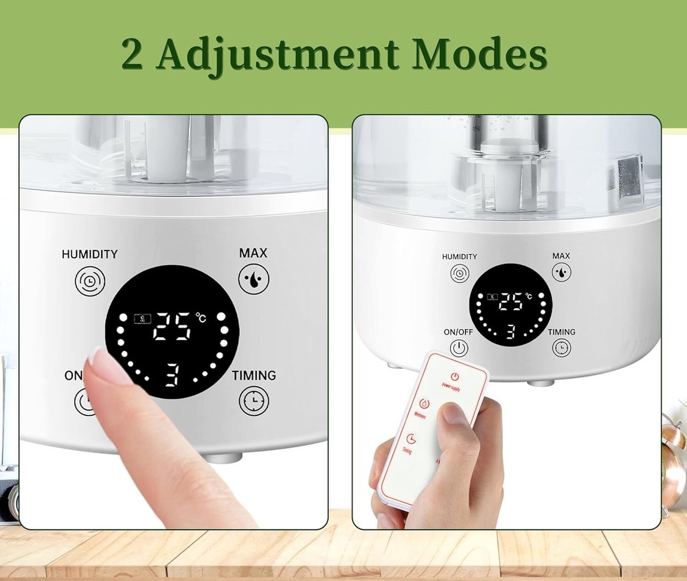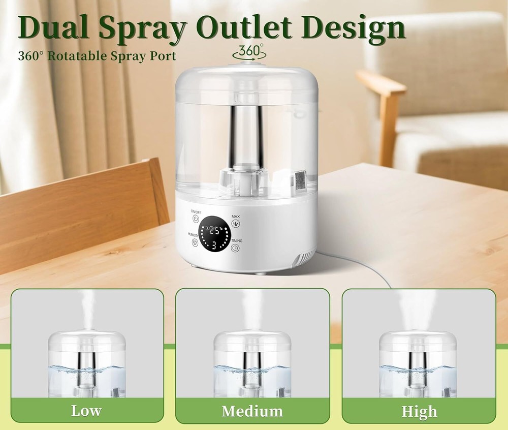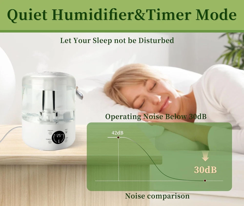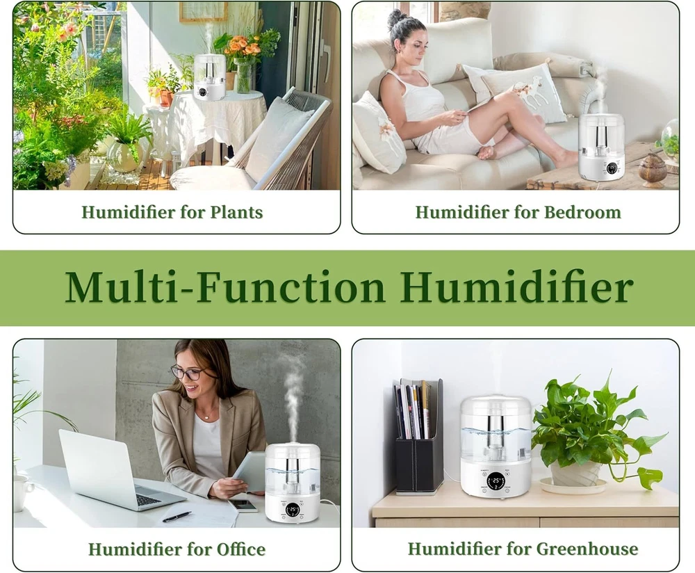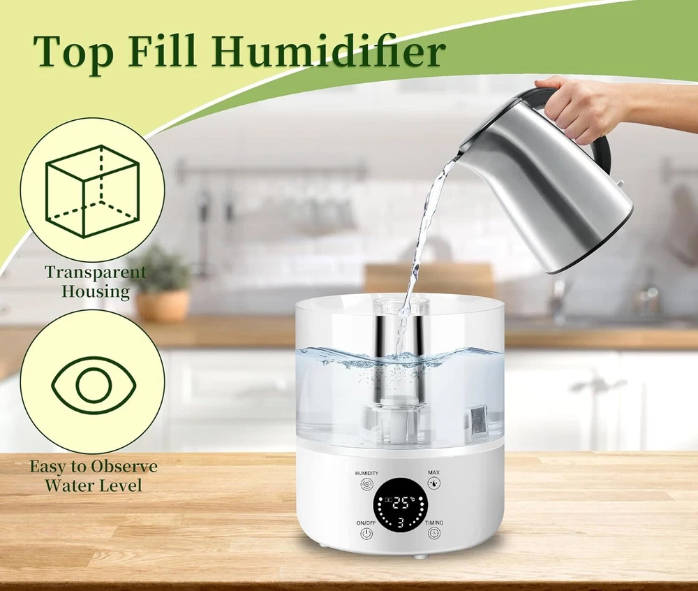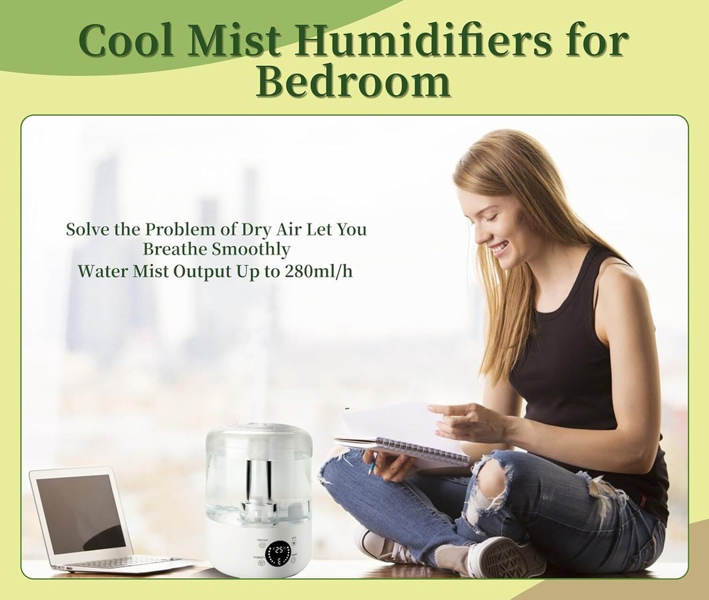 Product Description Humidifiers for Bedroom Home, 4L Top-Fill Cool Mist Humidifier, Easy to Clean, Auto Shut-Off, Quiet Ultrasound Air Humidifier for Home, Baby Nursery, Large Room and Plants 4L LARGE CAPACITY & DUAL SPRAY OUTLET DESIGN: This humidifier for bedroom has a large 4-liter water tank that can be used for a long time without frequent refilling. Our product is upgraded with dual misting ports for fast wetting, ensuring fast and efficient distribution of humidity in large spaces. ULTRA QUIET HUMIDIFICATION: Our cool mist humidifiers operate at less than 30 decibels, you won't even hear a sound when in use, creating a quiet environment for undisturbed sleep. TOP FILL DESIGN & TRANSPARENT TANK: The Top fill humidifier features a large opening top fill design, making it super easy to refill! Easily fill water from the top without spilling any water. Meanwhile, our water tank housing is transparent, monitor the water level at any time, more convenient. POWERFUL WATER MIST OUTPUT: The water mist output is up to 280ml/h, which can easily humidify a room up to 600 feet, and the high mist sprays evenly without wetting the desktop, and at the same time realizes a wide range of humidification. Relieve the dry air problem faster, let you breathe smoothly and healthy. LACK OF WATER CUTOFF: Our humidifiers for bedroom has a built-in lack of water cutoff system, which can accurately sense the lack of water, you don't have to worry about forgetting to add water to cause some problems. About Us We are a reputable seller with many years of experience selling on eBay. Our goal is to provide high-quality products and excellent customer service. Shipping Items will be shipped within 1-3 business days when we received payment. (Orders are not processed on weekends & holidays) Tracking information will be sent once item is shipped. Delivery time depends on destination and other factors Item is shipped to ebay address. Leaving correct address can minimize delay. For international shipping and shipping to Guam, Hawaii and Alaska, Please contact us before placing the order. International buyers please note: Import duties, taxes and charges are not included in the item price or shipping charges. These charges are buyer’s responsibility. We will try our best to reduce the risk of the custom duties. Local pick-up is unavailable at the moment. Contact Us We reply any email messages within 1 business / working days(off-duty at weekend). If you do not get a response from us, then please check your junk or spam mailbox. Our Business hours: Mon-Fri 9:00-18:00, UTC/GMT +8 hours. Please contact us either by clicking "contact seller" in the "purchase history" section or simply click "ask a question" at the bottom of this page. If you are unsatisfied with our item or service, please contact us before leaving any feedback. We are committed to resolve all issues in a friendly and satisfactory manner.