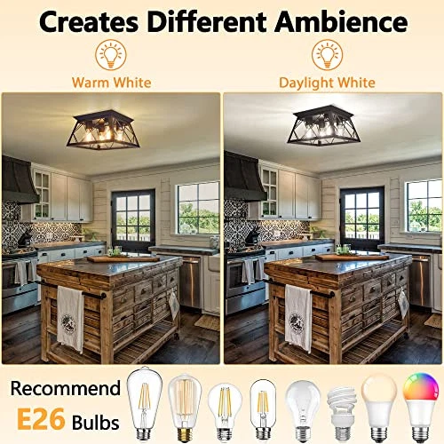 Menu 1. We require immediate payment. 2. We currently accept payment via eBay managed payments only. 3. Once payment is cleared, we will dispatch your shipment within 1-3 business days. Please refer to the "Shipping" tab for more information regarding shipping speed to your destination. 4-Light Black Flush Mount Ceiling Light for Kitchen Hallway, Industrial Close to Ceiling Lighting, Farmhouse Square Cage Ceiling Lamp for Dining Room, Living Room, Bulb Not Included Product description 【INDUSTRIAL CLOSE TO CEILING LIGHT】This 4 lights flush mount light fixture features a solid black frame and metal canopy, which embodies the charming charm of retro and modern. The kitchen light fixture provides an industrial and rustic look will add a vintage touch to your space, create striking lighting effects for your home's ceiling. 【SUITABLE FOR VARIOUS OCCASIONS】This farmhouse light fixtures ceiling uses industrial style design, perfect for farmhouse, kitchen, dining room, hallway, foyer, entryway, entrance, bedroom, sink, dining table,cafe, restaurant, warehouse and etc. The black flush mount light fixtures with an open geometric cage design that allows the light to reach the entire area and exude a comforting country glow. 【HIGN QUALITY CERAMIC LIGHT SOCKET】This light fixtures ceiling mount is made of sturdy material, scratch resistant, not easy to crack, it have passed UL LISTED for safety to use. The ceiling lights for hallway is compatible with E26 base bulb (Bulb NOT INCLUDED, Max 60W), such as incandescent, LED, CFL and halogen bulbs, also match well with the dimmer switch (Not included). 【QUICK TO INSTALL】This hallway light fixtures ceiling is fully assembled, just fix the metal canopy with the mounting screws and connect the wires. Please turn off the power before installing the ceiling lamp and read the instructions carefully. 【CUSTOMER SERVICES】Any quality problems with the flush mount ceiling light, please email us. We will provide you with the best service and help you solve it within 24 hours. PLEASE MESSAGE US IF YOU HAVE ANY OTHER QUESTIONS, AND MANY THANKS FOR READING ALL OF THIS. Copyright ©#. All Rights Reserved.