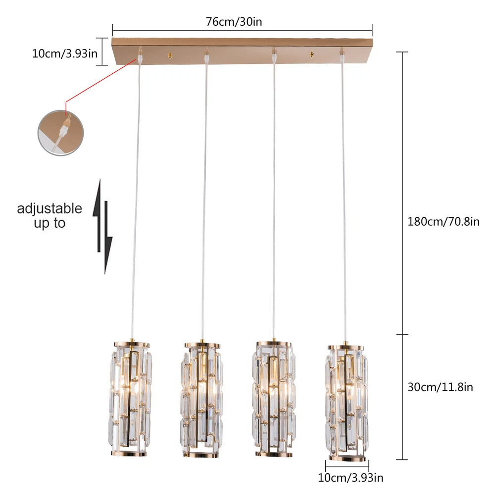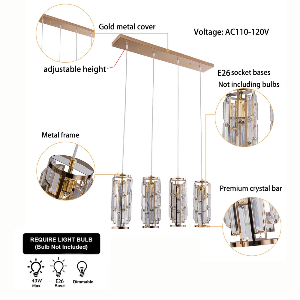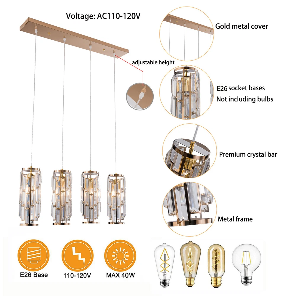 4-Light Luxury K9 Crystal Chandelier Lighting Ceiling Light Pendant Lamp Fixture About this item: Modern Crystal Pendant Lighting: High-quality K9 crystals trimmed a beautiful lampshade, and matches with nickel finished metal canopy and frame; A modern and gorgeous fixture diffuses stunning lighting wherever it mounts. Perfectly Fit: The crystal lampshade refracted when light passed through the prism crystal-formed lampshade and create a fantastic lighting effect, match with the adjustable cord, so you can customize the pendant lighting’s height to fit any ceiling height. Length of each suspension wire: 70.8" the farmhouse pendant light fixture can be adjusted from 70.8"to 5.9" easily. Application: This contemporary crystal pendant lighting is also a decorative choice for various spaces, suitable for both home and commercial place, such as kitchen island, living room, bedroom, dining room, foyer, meeting room, etc. 4xE26 Bulbs It works well with any E26 bulb base, Maximum power: 40W (each bulb,Bulbs NOT Included), LED or CFL or incandescentEdison bulbs, (Bulbs NOT Includedeach bulb is recommended). It’s dimmable when using with a dimmable bulb and compatible dimmer switch. Easy Installation: The crystal strings require some to to hang to the metal frame to formed a gorgeous crystal lampshade, but it’s easy and definitely worth every effort when it’s done, and the package includes detailed instruction and all necessary hardwired accessories. Specifications: Material:Metal and Crystal Color:Clear Input:AC 110 -120V Tips: -Please make sure the light is securely supported and is disconnected from power when installing. -Installing the light bulbs before hanging the makes the installation easier. [Easy to install] Open the package and check the appearance of the chandelier. Follow the instructions to group the lights together and test their effects before installing them on the ceiling. In the process of assembling the lamp, please pay attention to check the position of each wire interface and tighten the fixing screws Payment Delivery details Terms of sales About us Contact us Payment We accept ebay payment 。 Fees such as import duties, taxes are not included in the item price or shipping costs. These charges are the buyer's responsibility. Delivery details Shipping: 2-9 working days to: USA Terms of sales We maintain high standards of excellence and strive for hundred percent customer satisfaction. Feedback is very important to us. We hope that you contact us immediately before you give neutral or negative feedback, so that we can address your concerns. It is impossible to address issues if we do not know about them! About us Your satis faction is our ultimate goal. We work hard to earn your trust and future business. Our certified technicians have tested each item before shipping. The unit comes with 1 year limited warranty on all manufacturing defects. a) If you receive a defective item, you may return it or ask for a discount. Please contact us within 14 days after you receive the package. b) What you returned must be intact and in its original packaging as re? u. Customer is responsible for shipping costs of the returned item. c) We will cover the cost of shipping back t with the shipping rate indicated in the registration page. We will send you a new unit or refund the full payment you paid. Thank you. Contact us Business Hour Business Hour: Monday To Friday: 8:30 AM to 5:00 PM (Beijing China time) Due to time zones, our reply to your questions may not be immediately. But within above working time, we will reply your email within 24 hours. If it's non-workdays, please kindly be patient and wait till Monday. Please contact us with ebay message. Please feel free to contact us if you have any questions. Monday To Friday: 8:30 AM to 5:00 PM (Beijing China time) Due to time zones, our reply to your questions may not be immediately. But within above working time, we will reply your email within 24 hours. If it's non-workdays, please kindly be patient and wait till Monday. Please contact us with ebay message. Please feel free to contact us if you have any questions. On Nov 11, 2024 at 22:03:05 PST, seller added the following information: