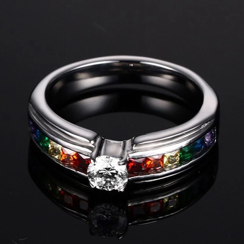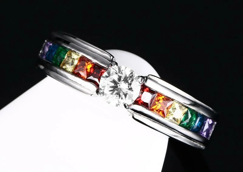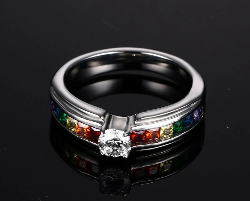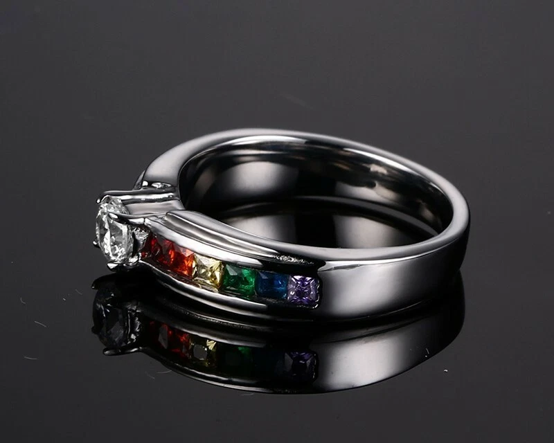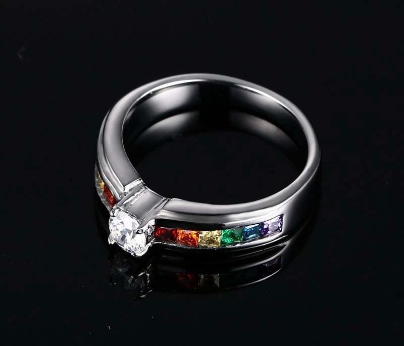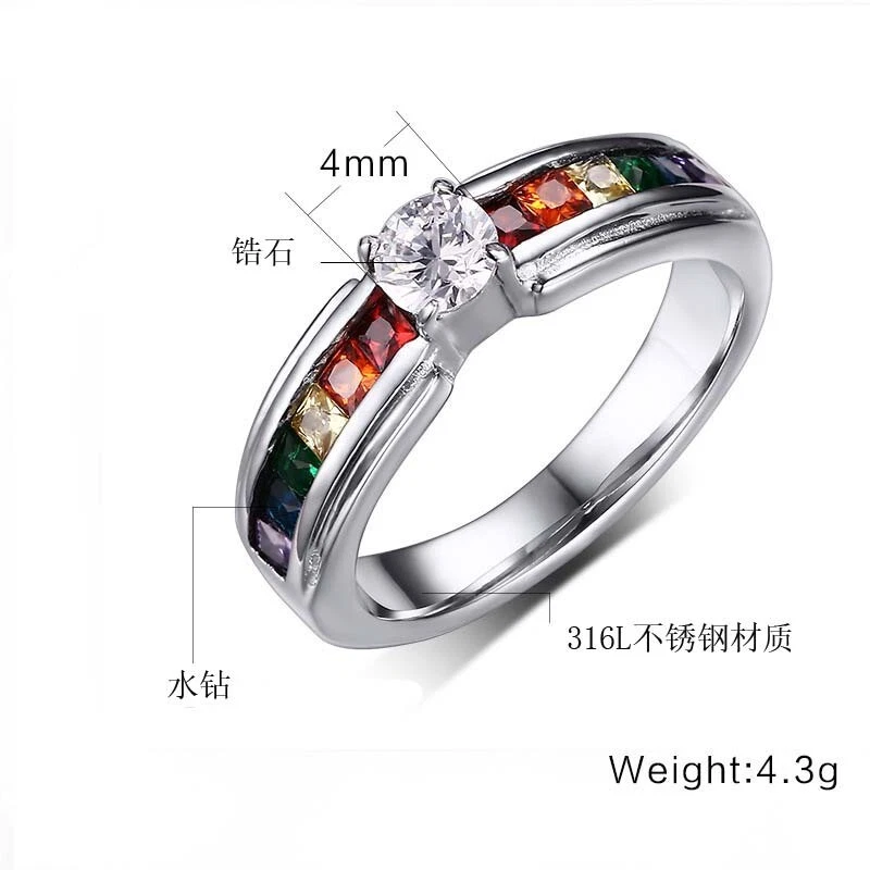 4MM Colorful Zircon Titanium Steel Women's Fashion Rainbow Ring Size 5-11