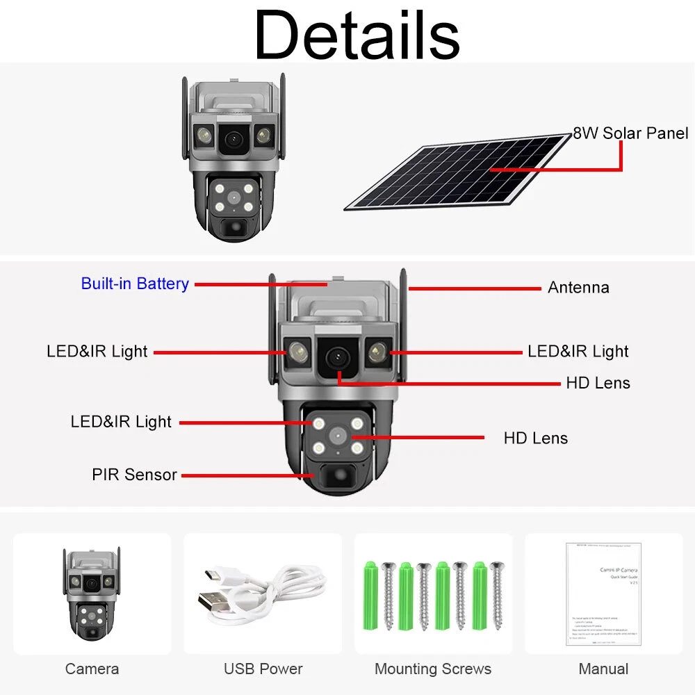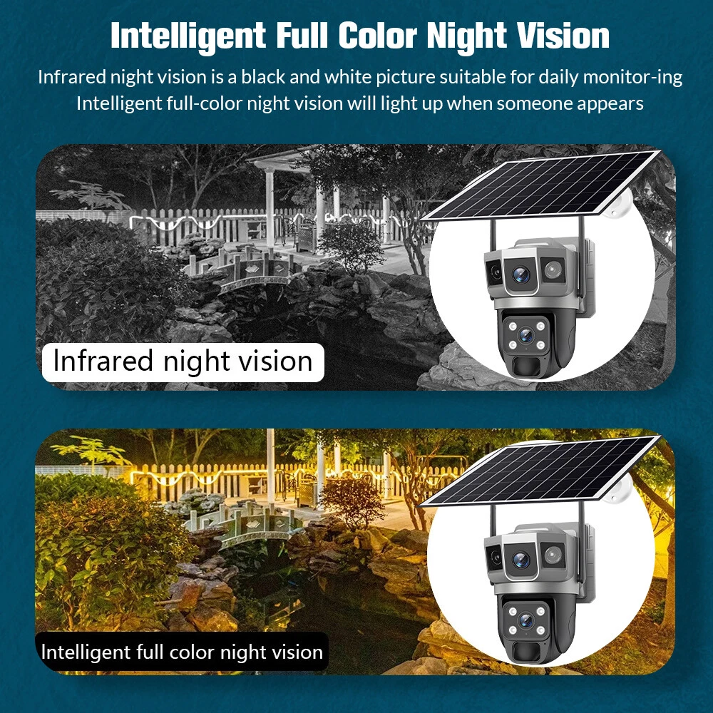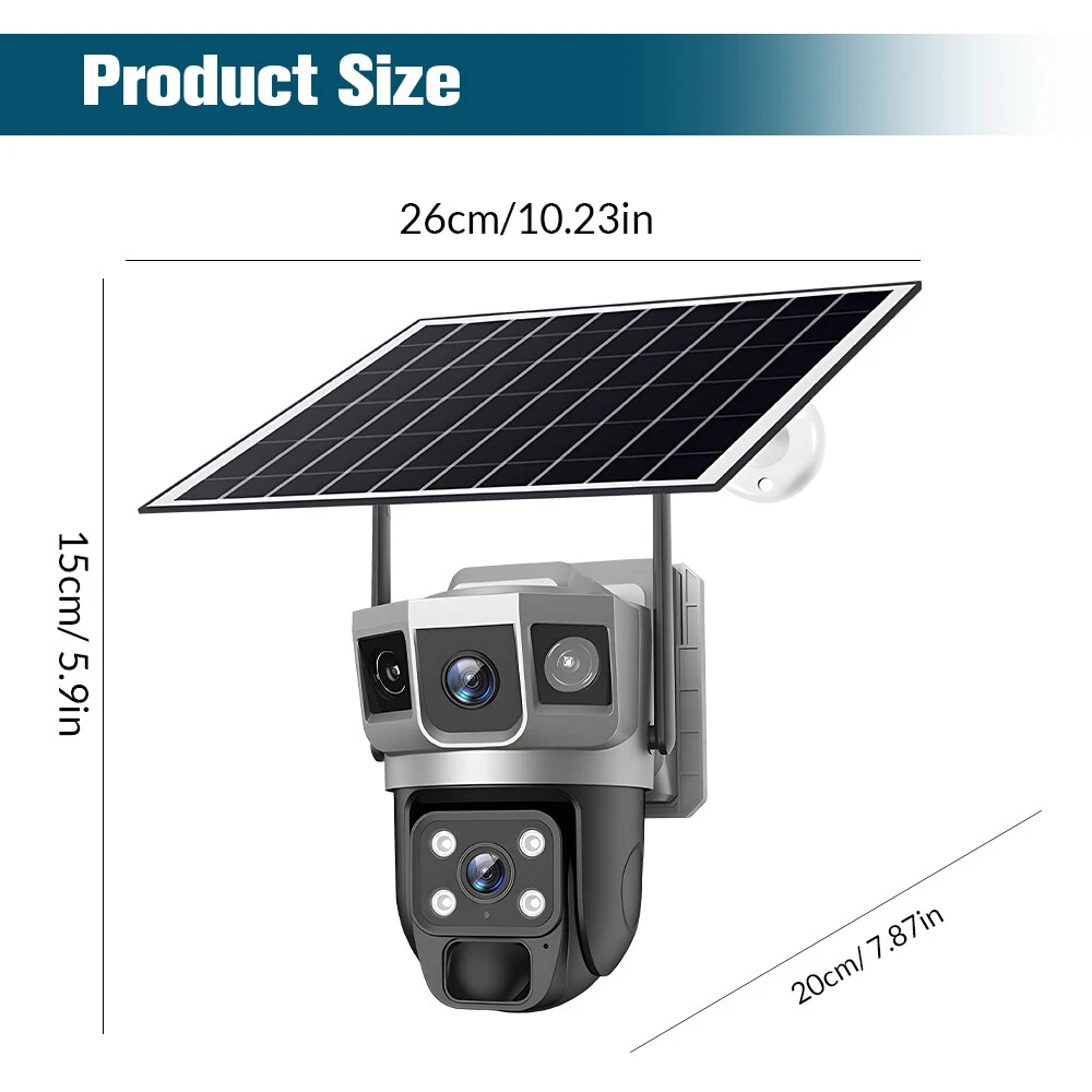 Features 1: 4 million pixel outdoor solar monitoring camera 2. High definition: Shoot with a high-definition camera to ensure the effectiveness and quality of video shooting, allowing you to have real-time control of the outdoor environment. 3. Night vision system: optional infrared or color night vision, which can monitor the doorstep in real-time at any time to ensure safe and smooth enjoyment. 4. APP V380 Pro remote operation: functions such as remote operation, photography, and video recording, allowing remote control of the outdoor environment. 5. Voice intercom: With voice intercom function, you can transmit sound to the external environment through your phone or replay the sound to visitors through the device. 6. Custom alerts: supports custom alerts, and when you receive an alert, it will immediately send an alert message to your phone 7. Multi user remote access: Share the same camera with your family, leave everything you protect, and pay more attention to your home. 8. SD card: The maximum size of the SD card is 128GB(not included). 9. Waterproof/Dustproof Ip66: The camera casing is made of high-quality ABS plastic and has waterproof, sunscreen, and dustproof functions. It is suitable for any environment. 10. Motion detection and automatic tracking: After locking the target, the camera will automatically adjust the pan tilt rotation. Track moving objects, cars, pets, humans, and push alert notifications to your smartphone. Package List: 1 x Solar Camera 4 x 2000mAh Camera(built in ) 1 x Solar Panel Bracket 1 x 32GB Card(as your choose) 1 x User Manual