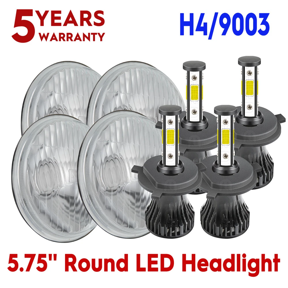5-3/4"5.75 Round Stock Style H4 Conversion Headlights with Super Bright White LED Light Bulbs. Keep the Classic Look with Modern Light Brightness! Plug And Play! This listing is for a new set of 5 3/4" stock style glass lens - metal back headlight bulbs. This set includes (4) low/high beam headlights with high intensity LED light bulbs (no wiring or bucket modification needed). These have the original shaped prongs on the back so they will plug right into your original wiring harness plugs. These will fit any car or truck that has 4 round glass headlights. Will fit into stock buckets. Each bulb is 5 3/4 inches in diameter. These are glass and we will take extra care in packaging. Product Features: Dimension: 5.75 inch Housing Color:Black LED Type: White Material: Aluminum Housing, PMMA Lens Voltage: 10V-30V DC Color Temperature: 6000K Working Temperature: -40°C- 85°C Waterproof Protection: IP67 Interchange: H5009 / H5006 / H5506 / H5001 / 4001 Specification: 100% Brand New in the box with manufacturer packaging, never been installed before. LED LIGHT BULB Specifications and Features: Product Name: LED Headlight Bulbs Luminous flux: 10000LM Working voltage: DC9-32V IP rate: IP67 Wattage:55W Connector: H4 / 9003 (Low Beam and High Beam) Life Span: Above 50,000 Hours Color temperature: pure white 6000K Materia:Aviation aluminum profile Package Included: 4pcs 5.75" 5-3/4" headlight Housing 4pcs H4/9003 High & Low Beam LED Bulbs Note: 1. Please check the size of your bulbs on your vehicle before purchasing. 2. Please make sure the headlight housing has enough space for installation before purchasing.