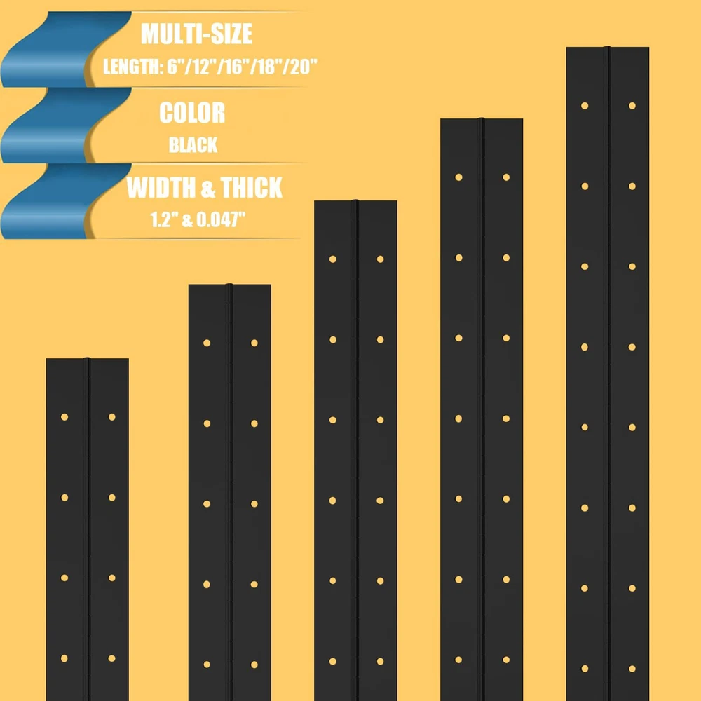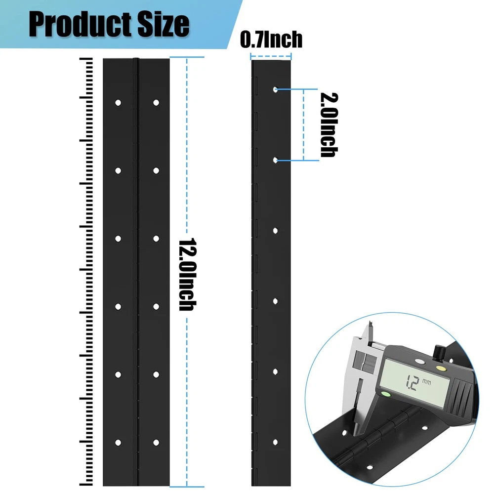 EPHECH 4PCS 12Inch Black Continuous Piano Hinge Constructed with 304 Stainless Steel, Matt Black Coated Surface Enhance Corrosion Resistant and Rustproof for Long Time Use WHY CHOOSE OUR PIANO HINGE RELIABLE MATERIAL Made from 1mm thickness 304 stainless steel ensure quality than other products on marketplace SMOOTH & QUIET Nice welded and extremely silent design ensuring that hinges open smoothly and quietly SURFACE TREATMENT Matt black electronic coated surface enhance rust resistant and corrosion resistant performance, provides good working experience for your daily use SPECIFICATION OF PIANO HINGE Material: 304 stainless steel Color: Black Surface Treatment: Matt black electronic coated Size: 12 x 1.2inch/300 x 30mm (L x W) Thickness: 0.04inch/1mm Two screw holes distance in length: 2.0inch/50mm Two screw holes distance in width: 0.8inch/20mm PACKAGE INCLUDED 4 x Black Continuous Hinges HEAVY DUTY CONTINUOUS HINGE - These premium piano hinges are made of high quality 304 stainless steel with matt black coated surface enhance corrosion resistant and rustproof for long time service. 12INCH PIANO HINGES - Cabinet door hinge size: 12 x 1.2inch/300 x 30mm, Thickness: 0.04inch/1mm; Two screw holes distance in length is 2.0inch/50mm; Two screw holes distance in width is 0.8inch/20mm. PACKAGE NOT INCLUDED SCREW! EASY OPERATE FOR DOOR HINGE - All holes are countersunk design for convenient operate and easy to fix the screw firmly; Nice welded and extremely silent ensuring that hinges opens smoothly and quietly. WIDE APPLICATION - The furniture hardware door butt hinges are suitable for furniture lids, cabinet doors, wardrobe doors, tool boxes, jewelry storage boxes and more, practical and useful accessory for your daily use. SATISFY SERVICE - Every product comes with a 100% satisfaction guarantee. If for any reason you are not completely satisfied with your purchase, you may return for a refund or exchange.