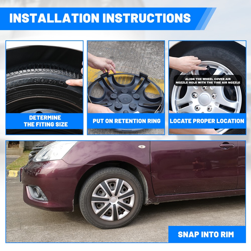 Head Lights Tail Lights Fog Lights Turn Signal Bumper Fender Flare Inner Fender Hubcaps Refrigerator Other Items for sale Head Lights Tail Lights Fog Lights Turn Signal Bumper Fender Flare Inner Fender Liners Portable Refrigerator Description This set of 4 wheel covers easily installs over your existing factory steel wheels in minutes! These wheel covers are constructed from durable, automotive grade plastic and feature an attractive silver finish for a custom look. Feature Set of Silver & Mould Texture Wheel Covers. To Buy This Hubcap Your Rim Size Must Be 14". The high-quality manufacturing process can prevent the product from cracking, fading and powdering. Made of high-quality hard and durable ABS plastic, which is strong and durable. Hubcaps have the A grade retention ring. It won't come off while driving as long as the hubcaps are installed properly High quality Flexible ABS material Adjustable buckle design. NOTICE: Just fit for ironhub,Not for aluminium alloy hub! Please check the hubs before purchasing! Package include: 4× Wheel Hubcap Cover