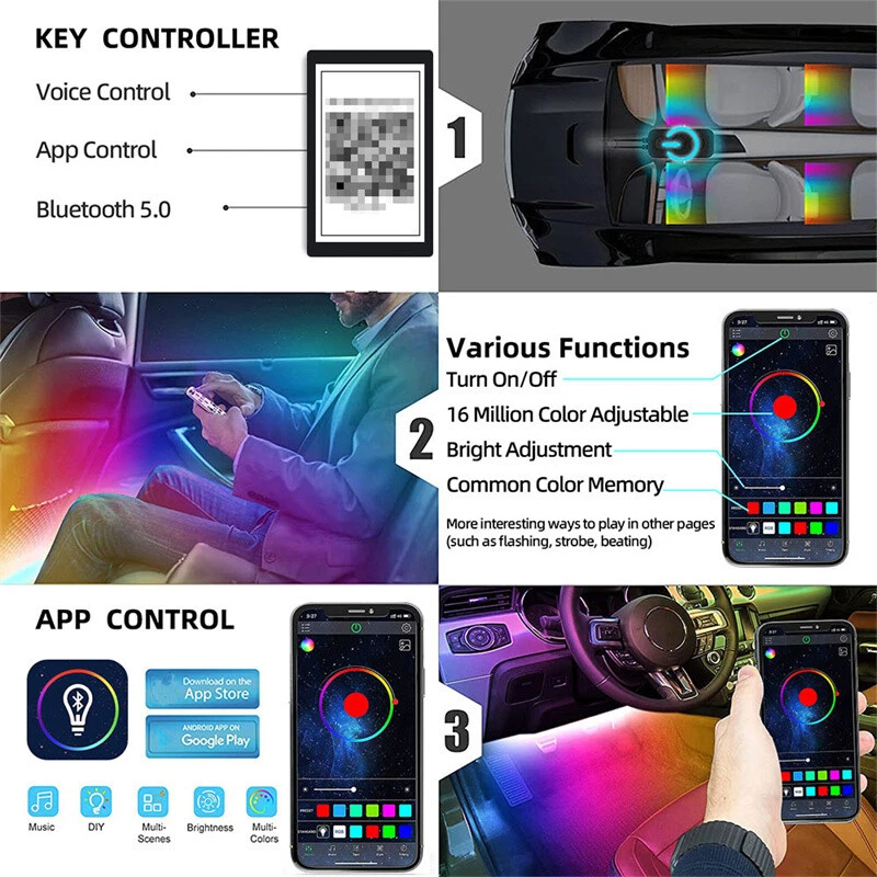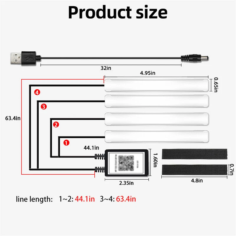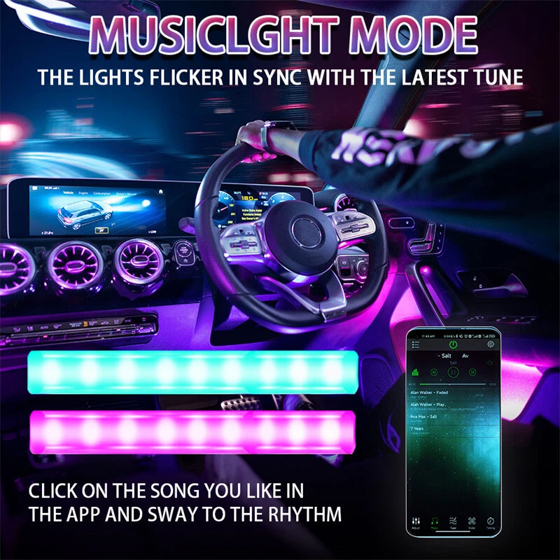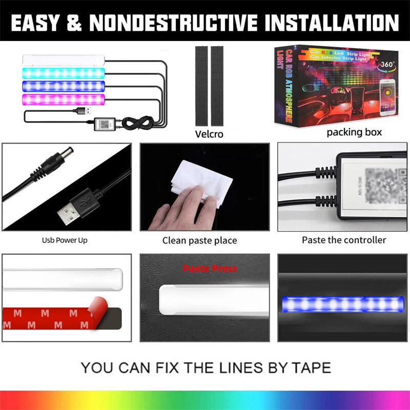 Product Description If you have any questions, please contact customer service first, do not open disputes easily, thank you! Features: 1.APP WIRELESS CONTROL: APP Blue-tooth link to control 56 modes (including voice control, music playback control, frequency adjustment of various modes. No button malfunction, more convenient and smarter App control, you can change the colour, brightness, music mode at will.) 2.Multi-colour: Equipped with 4 RGB car LED light strips, over 460 colours and 29 different shades to choose from, you can DIY your own unique colour patterns to create a comfortable and romantic atmosphere, in addition to the custom effect, they are also perfect for illuminating low-light areas in the cabin. 3.Unique Light Bar Housing Design: Compared to the common rubber-clause ambient lights on the market, this ambient light uses a PC housing, which provides good moisture resistance and also protects your eyes from direct light, making the light softer. 4.MUSIC SYNCHRONISM: Sensitive microphone sound sensitive function, the car lighting will synchronize the sound captured from the microphone, then the lighting will change colour according to the music rhythm. 5. EASY INSTALLATION: Installation is very easy and safe. Equipped with a USB port, allowing installers to install it quickly and say goodbye to installation hassles. 6. High Quality and Multi-purpose: Made of high-strength PC material, ultra-thin, waterproof IP67, anti-collision. Atmosphere Decorative Interior Lights can be installed into the interior of any cars and trucks (under dashboard, under seat, console) also suitable for TV oblique lighting, indoor cabinet, KTV, party. Specification: Working voltage: DC 5-12V Lamp bead specification: 5050 lamp beads Number of lamp beads: 9smd/strip Line board: single-sided 1.0 aluminium substrate Wire material: 11 cores pure copper core, 3mm neutral anti-conductive wire skin. Lamp shell material: PC shell Operation mode: APP Blue-tooth control (IF no blocking connection control) Lamp length: 14*2.1*1CM Connector: USB connector (5V use) Package Includes: 2*LED lights + 44.1in cable 2*LED lights + 63.4in cable 1*32in cable 1*APP controller 2*Wire Tie Note: 1. Please allow 1-3 mm error due to manual measurement. Please make sure you don't mind before ordering. 2. Please allow 1-3g weight error. Please make sure you don't mind before ordering. 3. Due to the lighting of the photos and the difference of monitors, the pictures may not reflect the actual colour of the real item. Please make sure you don't mind before ordering, thank you! About Us We accept all payments authorized by eBay. powered by