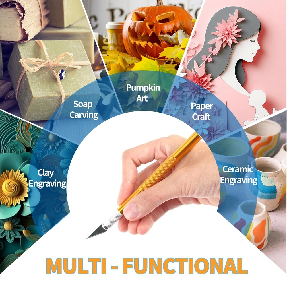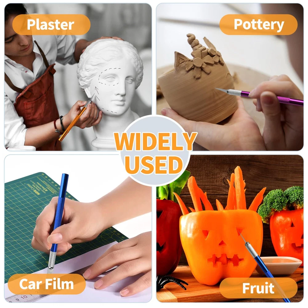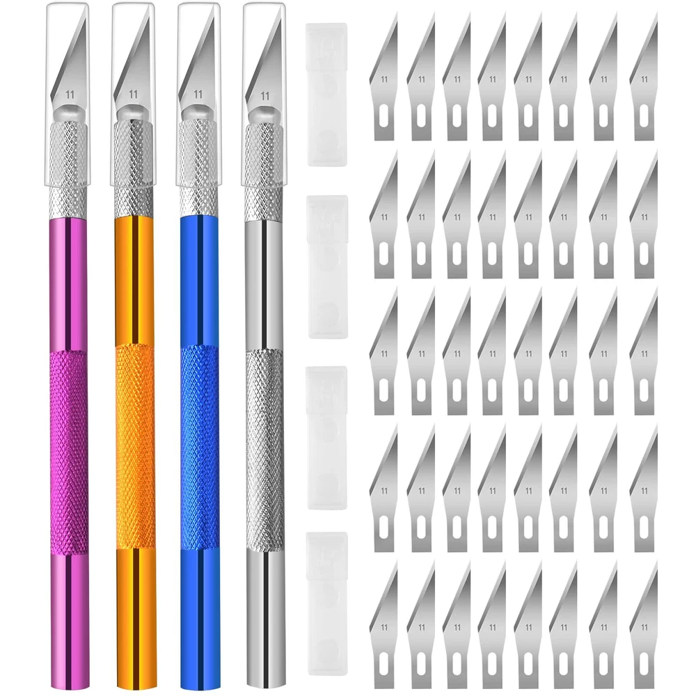 【1】Craft Knife with Extra Blades: Package including 4pcs art knife which is the standard #11 size and comes loaded with a new blade plus 40 more are supplied in four safe storage box. Bright colors (yellow, blue, purple, sliver) makes it easy to find and the tip of the stencil cutting knife is sharp. 【2】Premium Quality: The Aluminum alloy construction is lightweight and robust, ensuring durability even under the pressure of intricate cuts. The handle is ergonomically designed, providing a comfortable grip for extended use. The overall design lends itself well to precision, allowing for controlled and detailed work. 【3】Safely & Portable: 4 Hobby knives each with a safety cap of burin can avoid unnecessary cuts, craft knife cap to prevent scratches. The compact size of exacto knife 4 pack also makes it easy to store in our crafting toolbox or carry with us for on-the-go projects. 【4】Instant Blade Replacement: The blades are very easy to change. We rotate the collar around the blade to loosen the blade, pull the blade out of the handle, insert a new blade in the handle, and tighten the collar around the blade and we're done. 【5】Multi-Purpose Use: Craft knife kit perfect for cutting, carving and trimming, such as cutting thin wood, scrapbooking supplies, cardboard, wallpaper, plastic, cloth, leather and foam board craft, meet our different needs. Great set of exacto blades for hobbiests to proceed all kinds of hobby and craft work.