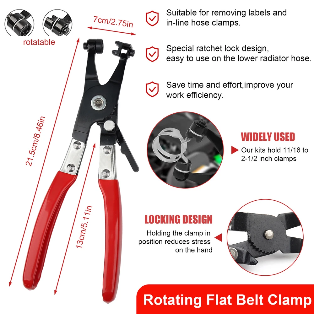 4PCS Hose Clamp Pliers Spring Clamp Pliers Self-Tightening Clamps Remover Tool Product Description Features: Made of high quality alloy steel and coated with black oxide to prevent rust. The ergonomic handles wrapped in non-slip rubber, are designed to prevent hand fatigue during prolonged use. 3 pliers set perfect for cars lower radiator, automobile maintenance, factories, production lines. HOSE PLIERS SET - Packing includes swivel flat band hose clamp pliers, long-reach cabled hose clamp pliers, vice grip, hose remover pliers. All 3 pliers have a locking function, when you open the self-tightening pipe clamp, the pliers can be locked to free your hands and speed up your repair work. Easy to Use - The long reach wire spring hose clamp pliers tip can be rotated allow access to tight spaces and can be used at any angle. The maximum opening is 2 inches, locking ratchet can keep flat-type or ring-type hose clamp open for easy installation and removal. Ideal for opening fuel, oil, water hose or coolant pipe spring clip. Design - Hose clamp pliers have swivel jaw, tip slot and multiple lock stops design for multiple angle access. The handle of plier wrapped in non-slip rubber, which can provide a comfortable grip and decrease hand fatigue during use. High Quality - This hose clamp plier is made up of premium alloy steel, heat-treated and coated with black oxide to prevent rust and corrosion. Sturdy and durable, long service life. GUARANTEE for YOU - We are committed to providing you with first-class quality assurance. If you have any quality problems or damage during transportation, please contact us in time, and we will solve the problem for you as soon as possible. Packing Includes: 1 Pcs Long reach spring wire clip plier 1 Pcs Hose removal plier 1 Pcs Flat band hose vlamp plier 1 Pcs Vice Grip