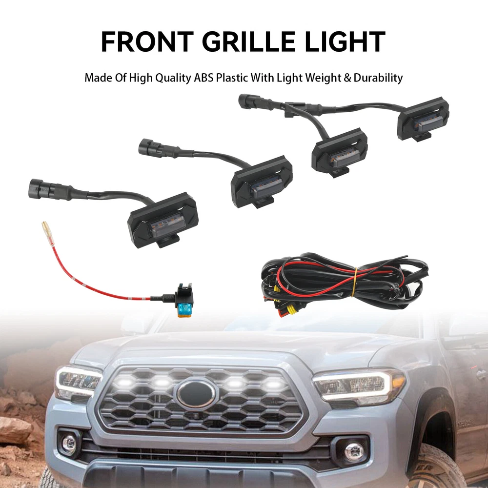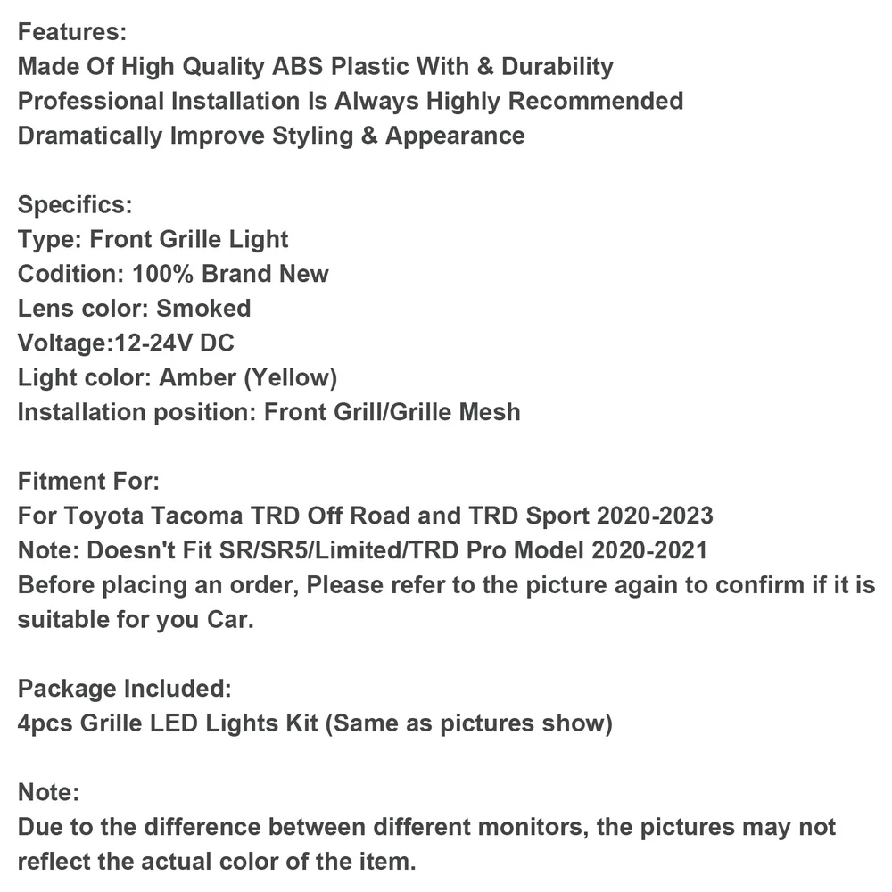You may also like Pair Grille Gloss Black Front Fog Light Lamp Cover Fit Ford Fiesta 2013-2017 YU 41.85 USD Free shipping Matte Black Front Bumper Sport Kidney Grille Grill For BMW Z4 E85 E86 2003-2008 59.85 USD Free shipping Front Bumper Fog Light Grill Fit VW Volkswagen Beetle & Beetle Convertible 53.85 USD Free shipping Bumper Fog Light Grill Bumper For Audi A4 S-LINE S4 2008-2012 Chrome Ring 59.85 USD Free shipping Tri-Colour Front Grille Grill Cover Strips Clip Trim for BMW GT3 9 Grilles 13.85 USD Free shipping Front Replacement Gloss Black M Color Kidney Grille For BMW E36 1997-1999 48.85 USD Free shipping Car Front Fence Grill Grille Chrome For BMW E46 4 Doors 1998-2001 3 Series USA 50.85 USD Free shipping 3pcs Smoked Lens Amber LED Lamp Raptor Front Grille Running Light fit Ford F-150 17.85 USD Free shipping Diamond Front Bumper Grille Grill Fit Mercedes Benz GLB X247 2020-2023 161.85 USD Free shipping Lower Bumper Fog Light Cover Grill Grille Fit AUDI A3 S3 S-Line 2013-2016 68.85 USD Free shipping Pair Fog Lamp Cover Grille Grill Fit Volkswagen Jetta 1.4L 2015-2018 21.85 USD Free shipping Tri-Colour Front Grille Grill Cover Strips Clip Trim for BMW 3 Series 2009-2012 11.85 USD Free shipping Features: Made Of High Quality ABS Plastic With & Durability Professional Installation Is Always Highly Recommended Dramatically Improve Styling & Appearance Specifics: Type: Front Grille Light Codition: 100% Brand New Lens color: Smoked Voltage:12-24V DC Light color: Amber (Yellow) Installation position: Front Grill/Grille Mesh Fitment For: For Toyota Tacoma TRD Off Road and TRD Sport 2020-2023 Note: Doesn't Fit SR/SR5/Limited/TRD Pro Model 2020-2021 Before placing an order, Please refer to the picture again to confirm if it is suitable for you Car. Package Included: 4pcs Grille LED Lights Kit (Same as pictures show) Note: Due to the difference between different monitors, the pictures may not reflect the actual color of the item. -About US Founded in 2012, VIPJQ have professional development and sales, and are involved in various products, providing customers with various high-quality products. Since its establishment, VIPJQ has always adhered to the service concept of "customer first" and the management concept of "pursuit of quality", and is committed to providing customers with high-quality original designs. We commit to provide you the best innovative, quality products & professional services with competitive prices. We value every customer, and we look forward to providing solutions for your business needs to help your business achieve its goals, please contact us immediately! We are all about you! We are a Japanese seller,but with large warehouse in USA. We are profesional on Auto Parts,Car Parts,Motorcycle Parts,3C,other hot sale items and so on. We aim to provide to customers high quality product and best service. -About Shipment&Returns The item usually will be dispatched within 3 days after you ordered.All are free shipping. And it usually takes 3-10 working days to delivery depends on buyers' address or other majeure on the way. If you are not satisfied with the items and want to return the item,we hope you could message us first,we will give you the return details, we think we could give you the best service to save your time and money.Thank you. -About Feedback&Customer Service If you are enjoy your shopping here,not only enjoy the items but also the service,we are appreciate you could give us a 5-star feedback. If you are not satisfied with the item,before you give us the negative feedback,we hope we could give you the best solution through our commutication. We think we could do it if you give us the chance.Thank you.