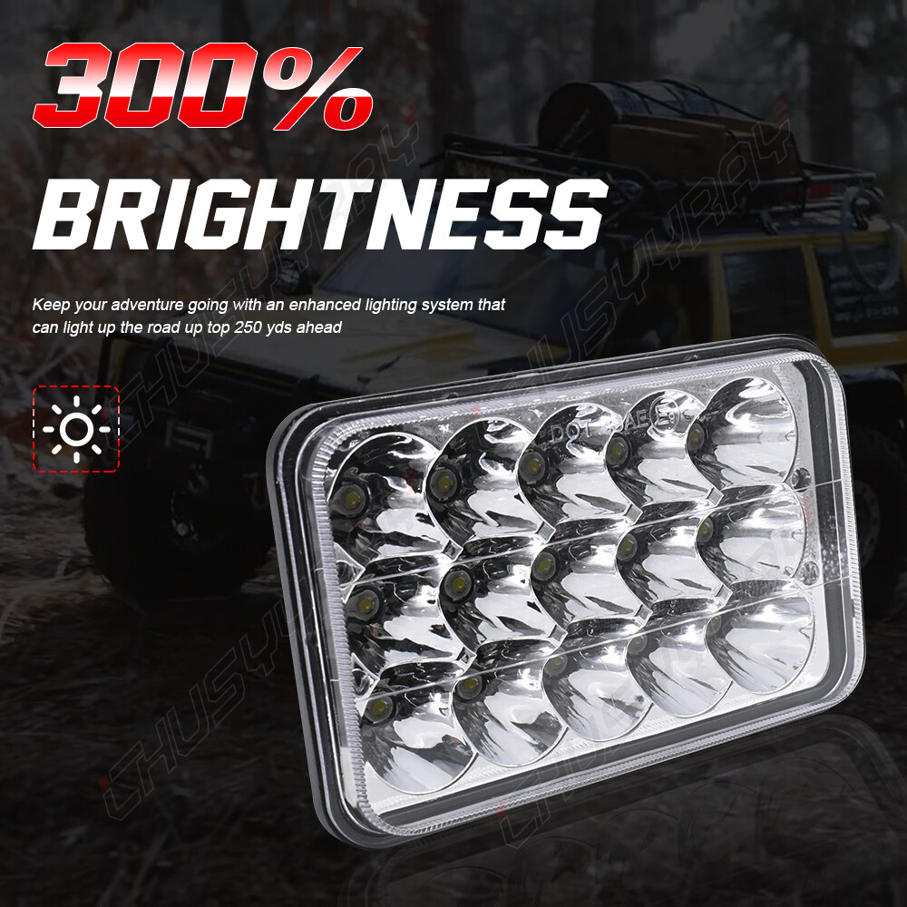 Specification: Beam Pattern: High Beam/Low Beam Plug: Factory H4 Plug With Hi/Lo Beam Function Color Temperature: 6000K~6500K LED Wattage: 45W/PC Light Color: White Working Voltage: 10-24V Operating Amperage: 3A To 12V Moisture Resistance Rate: IP67 Size(Single Work Light): 4"* 6"(170*108*79mm) Features: Average life span more than 50,000 hours of usage. Professional installation is high recommended Vehicle Fitment. Fit for most vehicle with sealed beam headlights(H6014 / H6052 / H6054 / 6054). Simple plug-and-play design. Each piece comes with 15-LED sealed beam light and toughen PMMA lens with H4 plug. Made by high quality black aluminum housing with PMMA lens. Package Includes: 4 × 4"* 6" LED Headlight Fitment: Most vehicles with 4X6 INCH Headlight (H4 Plug) Compatible with headlights: H4651 H4652 H4656 H4666 H4668 H6545
