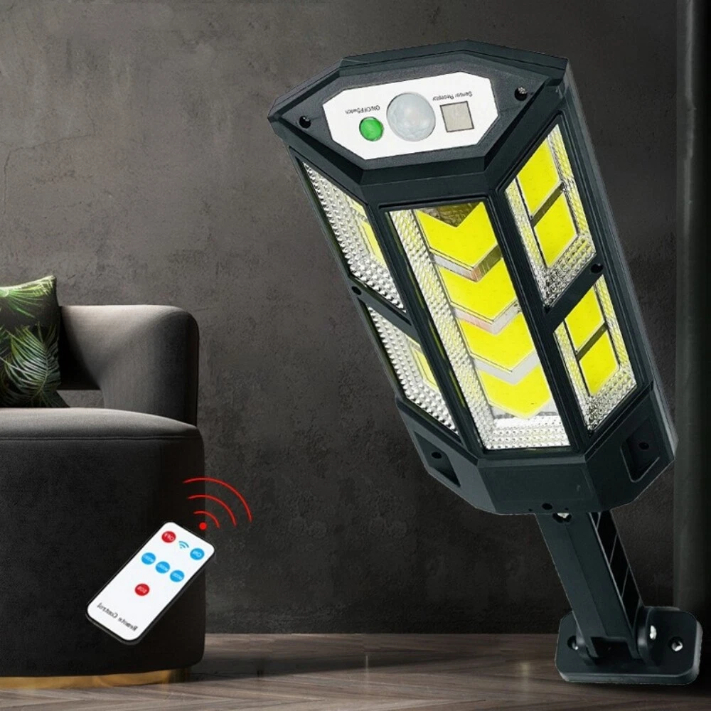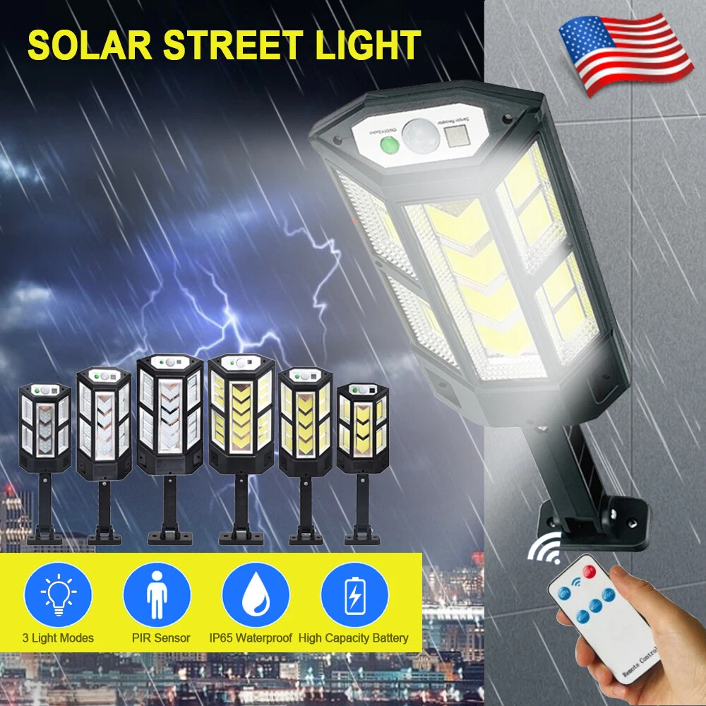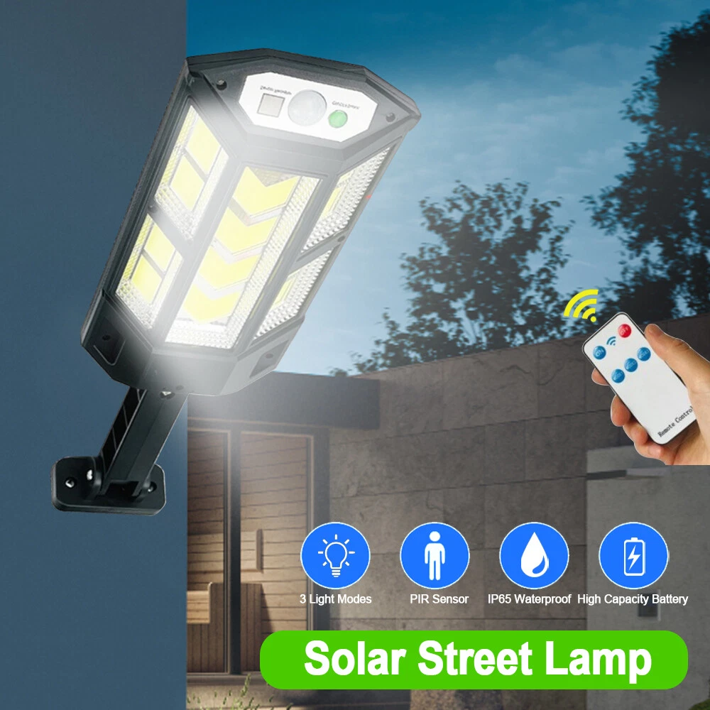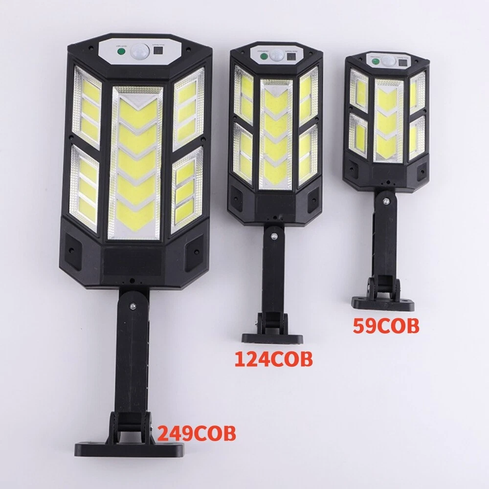COB LED Solar Wall Light Commercial Dusk To Dawn Outdoor Garden Waterproof Road Street Lamp Flood Light with Motion Sensor Product Feature: Solar Powered: These solar light are made of more energy saving laminated solar panel and premium COB LED lights, which will be more durable and suitable for longer usage time. Build in 2200 mAh rechargeable lithium-ion battery and produce over 6000 lumens to allows the led solar lights to be continuously illuminated for 8-14 hours in bright mode to meet your lighting needs. 120° Wide-Angle Solar Lighting: The outdoor wall lights features high sensitivity and 180-degree adjustable bracket design, can sensitively sense moving objects in 10-15 FT with 120 degrees range, providing security and convenience for your home when night falls. 3 Lighting Modes + Remote Control: 3 Lighting modes are configured for this solar street lamp and a wireless remote control is provided. 1: Motion Sensor mode (Turn on when motion is detected, turn off after 20 seconds); 2: Smart Brightness Control mode (When there is no one, the light is weak, someone approaches and becomes strong light, but after 20 seconds, the light becomes weak); 3: Auto mode (Turns on automatically night and stay all night). Waterproof & Durable: This solar street lights outdoor is made of sturdy and durable ABS material, combined with IP65 waterproof and dustproof design to support the street lights solar powered can work in all kinds of harsh weather. Easy to Install: Compact joint design makes it is easy installed, it does not need any extra wire and special tools. The solar outdoor lights is water resistant and heat-resistant. A great solar security light for outdoor patio, garden, deck, yard, drive, streets, parking lots, basketball courts, outside wall, fence etc. Specification: Product Name: Solar Street Light Material: ABS Color: Black Light Color: Cold White 6500K Light Beads Quantity: 43LEDs/84LEDs/147LEDs/59COB/124COB/249COB Charging Method: Solar Powered Solar Panel: 5.5V 2.5W Power Capacity: Built-in 1200mAh 18650 rechargeable lithium battery. Working Mode: Three working modes Induction Distance: 3-5m Control Method: Button + Remote Control Waterproof Level: IP65 Lamp Body Size: As shown Charging Time: 6-8 hrs Working Time: 8-14hrs Please Note: All mode works only from dark to dawn, Please cover the solar panel during daytime testing Please allow 0.5-1cm error due to manual measurement. pls make sure you do not mind before you bid. Due to the difference between different monitors, the picture may not reflect the actual color of the item. Thank you! If you still have any issues during installation, defective items, replacements or refund, please contact our customer service e-mail for a prompt solution, we will get it resolved within 24 hours. Please rest assured that we always get your back whenever you are in need of assistance. Package Included: 4 x Solar Street Light Wall Light 4 x Remote Control