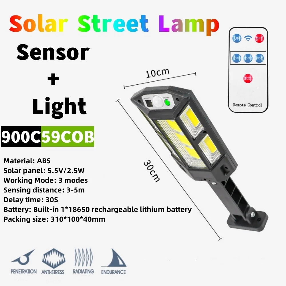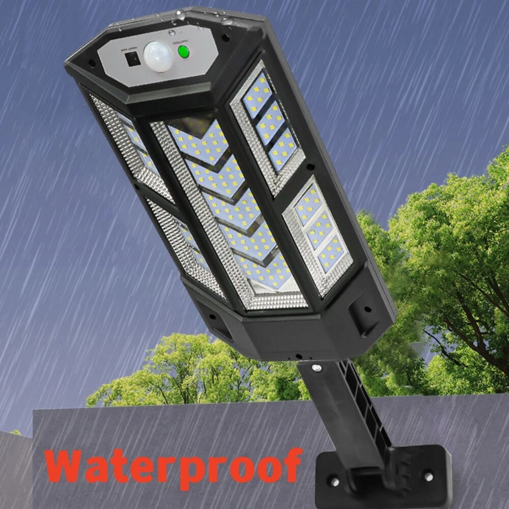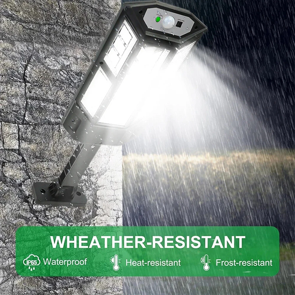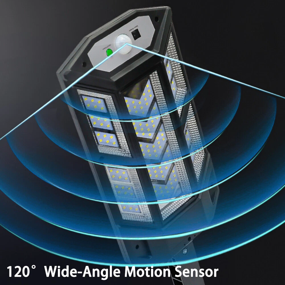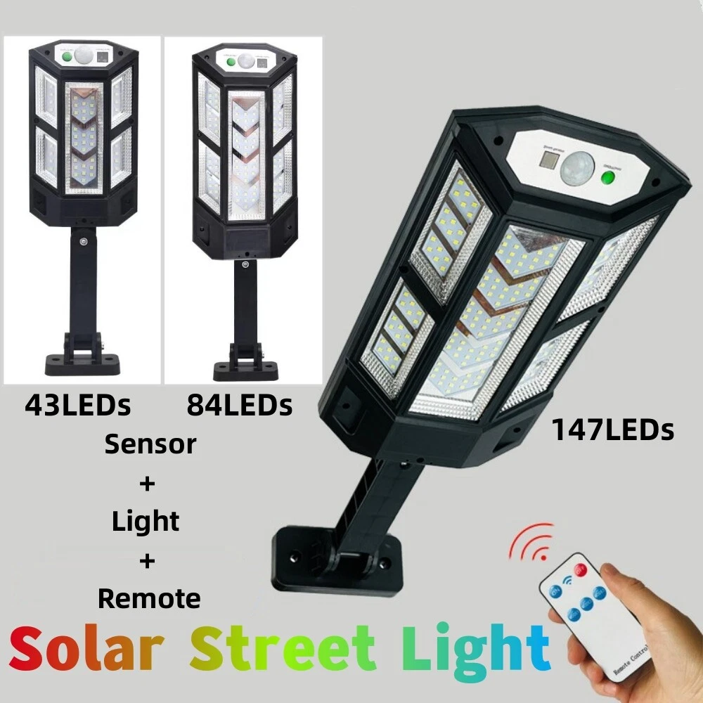 COB LED Solar Wall Light Commercial Dusk To Dawn Outdoor Garden Waterproof Road Street Lamp Flood Light with Motion Sensor Product Feature: Solar Powered: These solar light are made of more energy saving laminated solar panel and premium COB LED lights, which will be more durable and suitable for longer usage time. Build in 2200 mAh rechargeable lithium-ion battery and produce over 6000 lumens to allows the led solar lights to be continuously illuminated for 8-14 hours in bright mode to meet your lighting needs. 120° Wide-Angle Solar Lighting: The outdoor wall lights features high sensitivity and 180-degree adjustable bracket design, can sensitively sense moving objects in 10-15 FT with 120 degrees range, providing security and convenience for your home when night falls. 3 Lighting Modes + Remote Control: 3 Lighting modes are configured for this solar street lamp and a wireless remote control is provided. 1: Motion Sensor mode (Turn on when motion is detected, turn off after 20 seconds); 2: Smart Brightness Control mode (When there is no one, the light is weak, someone approaches and becomes strong light, but after 20 seconds, the light becomes weak); 3: Auto mode (Turns on automatically night and stay all night). Waterproof & Durable: This solar street lights outdoor is made of sturdy and durable ABS material, combined with IP65 waterproof and dustproof design to support the street lights solar powered can work in all kinds of harsh weather. Easy to Install: Compact joint design makes it is easy installed, it does not need any extra wire and special tools. The solar outdoor lights is water resistant and heat-resistant. A great solar security light for outdoor patio, garden, deck, yard, drive, streets, parking lots, basketball courts, outside wall, fence etc. Specification: Product Name: Solar Street Light Material: ABS Color: Black Light Color: Cold White 6500K Light Beads Quantity: 43LEDs/84LEDs/147LEDs/59COB/124COB/249COB Charging Method: Solar Powered Solar Panel: 5.5V 2.5W Power Capacity: Built-in 1200mAh 18650 rechargeable lithium battery. Working Mode: Three working modes Induction Distance: 3-5m Control Method: Button + Remote Control Waterproof Level: IP65 Lamp Body Size: As shown Charging Time: 6-8 hrs Working Time: 8-14hrs Please Note: All mode works only from dark to dawn, Please cover the solar panel during daytime testing Please allow 0.5-1cm error due to manual measurement. pls make sure you do not mind before you bid. Due to the difference between different monitors, the picture may not reflect the actual color of the item. Thank you! If you still have any issues during installation, defective items, replacements or refund, please contact our customer service e-mail for a prompt solution, we will get it resolved within 24 hours. Please rest assured that we always get your back whenever you are in need of assistance. Package Included: 4 x Solar Street Light Wall Light 4 x Remote Control