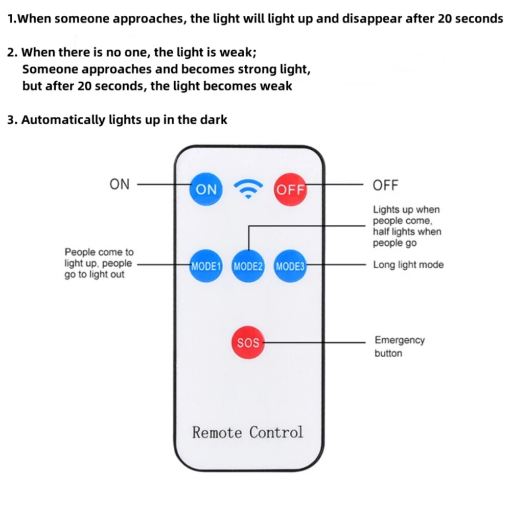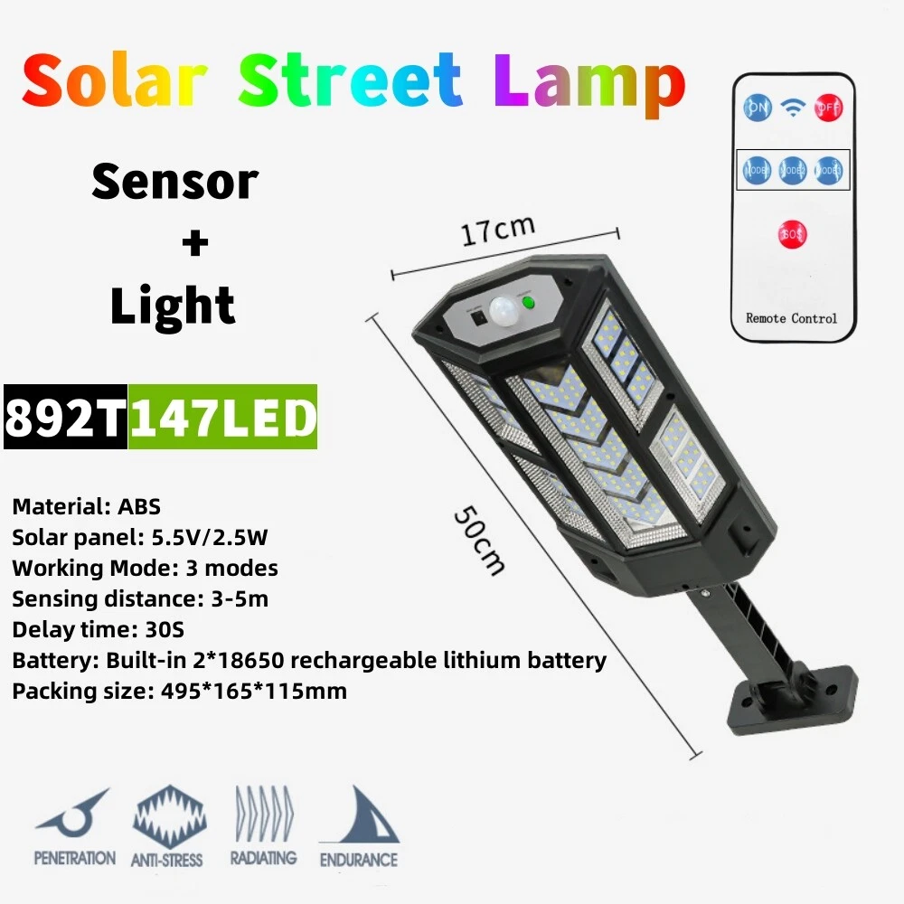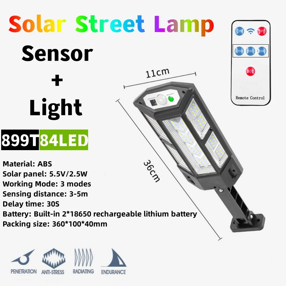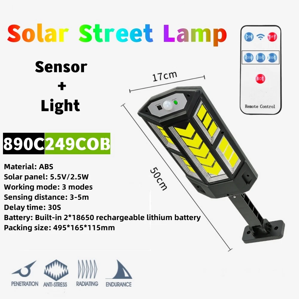 COB LED Solar Wall Light Commercial Dusk To Dawn Outdoor Garden Waterproof Road Street Lamp Flood Light with Motion Sensor Product Feature: Solar Powered: These solar light are made of more energy saving laminated solar panel and premium COB LED lights, which will be more durable and suitable for longer usage time. Build in 2200 mAh rechargeable lithium-ion battery and produce over 6000 lumens to allows the led solar lights to be continuously illuminated for 8-14 hours in bright mode to meet your lighting needs. 120° Wide-Angle Solar Lighting: The outdoor wall lights features high sensitivity and 180-degree adjustable bracket design, can sensitively sense moving objects in 10-15 FT with 120 degrees range, providing security and convenience for your home when night falls. 3 Lighting Modes + Remote Control: 3 Lighting modes are configured for this solar street lamp and a wireless remote control is provided. 1: Motion Sensor mode (Turn on when motion is detected, turn off after 20 seconds); 2: Smart Brightness Control mode (When there is no one, the light is weak, someone approaches and becomes strong light, but after 20 seconds, the light becomes weak); 3: Auto mode (Turns on automatically night and stay all night). Waterproof & Durable: This solar street lights outdoor is made of sturdy and durable ABS material, combined with IP65 waterproof and dustproof design to support the street lights solar powered can work in all kinds of harsh weather. Easy to Install: Compact joint design makes it is easy installed, it does not need any extra wire and special tools. The solar outdoor lights is water resistant and heat-resistant. A great solar security light for outdoor patio, garden, deck, yard, drive, streets, parking lots, basketball courts, outside wall, fence etc. Specification: Product Name: Solar Street Light Material: ABS Color: Black Light Color: Cold White 6500K Light Beads Quantity: 43LEDs/84LEDs/147LEDs/59COB/124COB/249COB Charging Method: Solar Powered Solar Panel: 5.5V 2.5W Power Capacity: Built-in 1200mAh 18650 rechargeable lithium battery. Working Mode: Three working modes Induction Distance: 3-5m Control Method: Button + Remote Control Waterproof Level: IP65 Lamp Body Size: As shown Charging Time: 6-8 hrs Working Time: 8-14hrs Please Note: All mode works only from dark to dawn, Please cover the solar panel during daytime testing Please allow 0.5-1cm error due to manual measurement. pls make sure you do not mind before you bid. Due to the difference between different monitors, the picture may not reflect the actual color of the item. Thank you! If you still have any issues during installation, defective items, replacements or refund, please contact our customer service e-mail for a prompt solution, we will get it resolved within 24 hours. Please rest assured that we always get your back whenever you are in need of assistance. Package Included: 4 x Solar Street Light Wall Light 4 x Remote Control