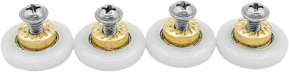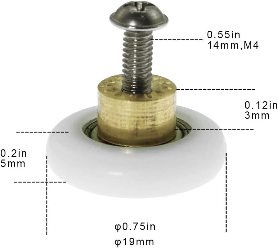 About this item Wheel thickness :5mm, comes with screws,steel part of the wheel: 9mm diameter x 3mm height;suitable for 4-6mm thick shower door Roller diameter: 19mm, Inner hole: 4mm, fixed with M4 screw The pulley is made of copper +POM wheel, and the screw is made of stainless steel,corrosion resistance and rust resistance,it has good comprehensive performance Pulley bearing capacity, good stability; Small friction coefficient, good mute effect Easy installation, often used for bathroom glass sliding door pulley/sliding track