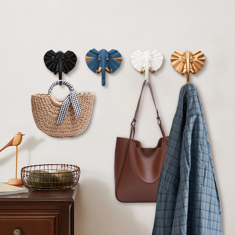 Specification Material: Resin Style: Modern Process: Spraying, Carving Color: Black+ Gold+ White+ Blue Mount Type: Wall Mounted Number of Items: 4 Load-Bearing Capacity: 5kg/11.02lbs (Drilling Installation), Approx. 3kg/6.61lbs (Adhesive Installation) Each Product Size: 10*4*11cm/3.94*1.57*/4.33in Package Size: 33*19*16cm/12.99*7.48*6.3in Gross Weight: 1kg/2.2lbs Net Weight: 0.8kg/1.76lbs Package Included 4 * Hooks Other Accessories for Installation 4PCS Resin Wall-mounted Decoration Hooks for Coat/Key/Bag&Creative Coat Hooks Welcome~ Description In addition to their cute appearance, each hook has been carefully designed to ensure good load-bearing capacity and high durability, allowing small objects in daily life to have a place to stay. The 4-piece design allows you to apply it to multiple spaces. They are not only practical daily assistants, but also works of art on the wall, silently telling home stories. Key Features Good Material: The product is made of high-quality resin through spray painting and carving treatment, which is environmentally friendly and non-toxic , and has a long service life. Creative Styling: The geometric elephant-head shape full of creativity can add fun to the wall, attract attention, and become a highlight of your home decoration. Space Saving: The wall-mounted design allows you to fully utilize the wall space and hang various items such as keys, bags, scarves(not included), etc., saving a lot of desktop space while allowing for easy access. Good Load-Bearing Capacity: When using perforated installation, each hook can withstand a weight of 11.02 pounds, ensuring the safety and stability of the hung items. 4PCS A Set: This set includes 4 hooks that can be arranged on different walls or rooms as needed while streamlining the purchasing process. Multiple Installation Methods: The package comes with expansion screws, traceless nails, and adhesive patches, allowing you to use different installation methods according to different wall surfaces. Easy Clean-Up: The surface of the product is smooth and the structure is simple. You can easily use a soft cloth(not included) to wipe it clean. Ideal Gift: Thanks to its beautiful appearance and practicality, you can give it as a gift to your friends on their birthday, housewarming, or any other holiday. Details Smooth Edges: The smooth edges without burrs prevent your clothes, bag, or other items from being scratched. Adhesive Pads: They are carefully cut to fit the edges of the product, making the installation more aesthetically pleasing, easy, and firm. How to Install Traceless Nails Installation: 1. Tap the traceless nails into the wall. 2. Insert the hook into the slot and press it tightly. Traceless Nails & Screws Installation: 1. Use a 5mm drill bit (excluded) to drill holes in the wall. 2. Secure the traceless nails to the wall with screws and nails. 3. Insert the hook into the slot and press it tightly. Screws Installation: 1. Use a 5mm drill bit (excluded) to drill holes in the wall. 2. Insert the expansion plug into the holes. 3. Screw the screws into the plugs. Adhesive Installation: 1. Tear the protective film and stick the adhesive pad on the back of the hook. 2. Stick the hook onto the wall, press firmly, and wait for 24 hours before using it. Application This product can be widely used in entrances, bedrooms, living rooms, dressing rooms, cloakrooms, changing rooms, coffee shops, offices, studios, and other spaces to hang your jackets, scarves, bags, towels, keys, hats, umbrellas, or other items. Specification Material: Resin Style: Modern Process: Spraying, Carving Color: Black+ Gold+ White+ Blue Mount Type: Wall Mounted Number of Items: 4 Load-Bearing Capacity: 5kg/11.02lbs (Drilling Installation), Approx. 3kg/6.61lbs (Adhesive Installation) Each Product Size: 10*4*11cm/3.94*1.57*/4.33in Package Size: 33*19*16cm/12.99*7.48*6.3in Gross Weight: 1kg/2.2lbs Net Weight: 0.8kg/1.76lbs Package Included 4 * Hooks Other Accessories for Installation Notes Adhesive installation is suitable for smooth walls such as metal, marble, glass, latex paint, stone, wood, plastic, and ceramic tiles. It is not suitable for wallpaper walls, wall cloth walls, or white walls. Please do not hang too heavy products on the installed products. Please allow the slight color difference caused by the shooting light and 1-3cm error due to manual measurement, and make sure you do not mind before ordering. tu1 Payment Delivery details Terms of sales About us Contact us Payment We accept ebay payment ใ Fees such as import duties, taxes are not included in the item price or shipping costs. These charges are the buyer's responsibility. Delivery details Shipping: 2-9 working days to: USA Terms of sales We maintain high standards of excellence and strive for hundred percent customer satisfaction. Feedback is very important to us. We hope that you contact us immediately before you give neutral or negative feedback, so that we can address your concerns. It is impossible to address issues if we do not know about them! About us Your satis faction is our ultimate goal. We work hard to earn your trust and future business. Our certified technicians have tested each item before shipping. The unit comes with 1 year limited warranty on all manufacturing defects. a) If you receive a defective item, you may return it or ask for a discount. Please contact us within 14 days after you receive the package. b) What you returned must be intact and in its original packaging as re? u. Customer is responsible for shipping costs of the returned item. c) We will cover the cost of shipping back t with the shipping rate indicated in the registration page. We will send you a new unit or refund the full payment you paid. Thank you. Contact us Business Hour Business Hour: Monday To Friday: 8:30 AM to 5:00 PM (Beijing China time) Due to time zones, our reply to your questions may not be immediately. But within above working time, we will reply your email within 24 hours. 