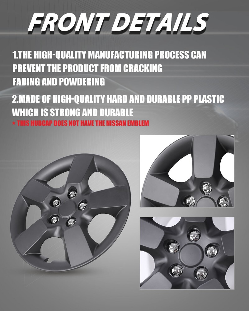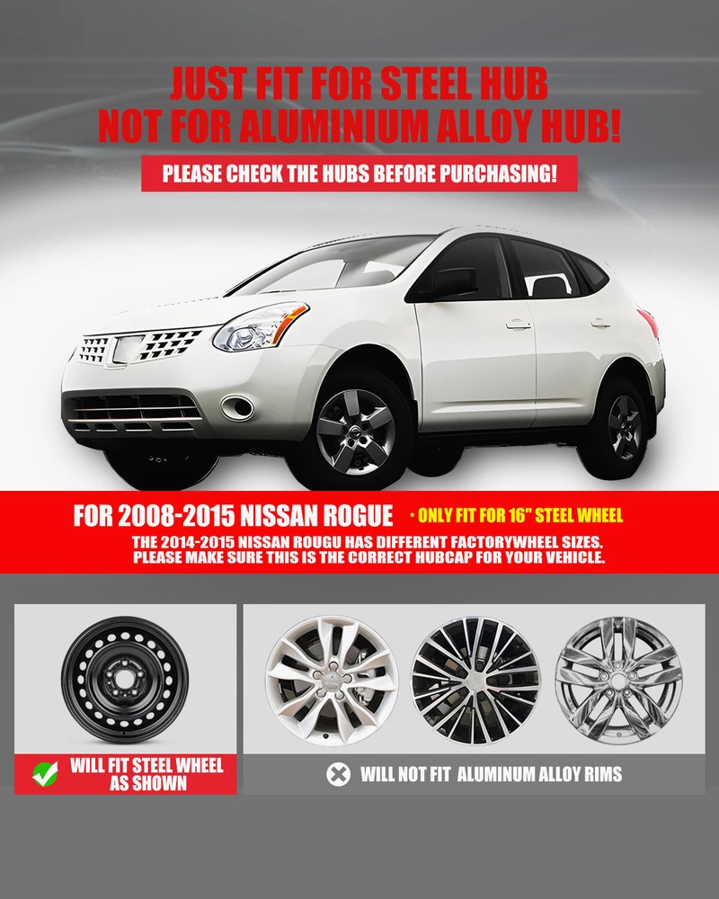 Store Categories Other Car Refrigerator Front Bumper Rear Bumper Fender Flares Inner Fenders Side Steps Running Board A-Pillar Light Mount Brackets Headlights Taillights Fog Lights LED Headlights LED Taillights LED Fog Lights Jeep Chevrolet Ford Toyota Dodge GMC Wheel Covers Features ✴ PERFECT FIT: This wheel hub cap is specifically designed to perfectly fit for 16-inch wheels, ensuring a seamless match and enhanced aesthetics. It complements the overall design of the vehicle, elevating its visual appeal. ✴ HIGH-QUALITY MATERIAL: Constructed from high-quality materials, this wheel hub cap guarantees durability and longevity. It withstands various road conditions and environmental factors encountered during daily driving, maintaining its pristine condition. ✴ EASY INSTALLATION: Installing this wheel hub cap is a breeze and requires no specialized tools or modifications. It comes with a user-friendly system, allowing for a hassle-free installation process by following the provided instructions. ✴ PROTECTIVE FUNCTION: Besides its aesthetic appeal, this wheel hub cap serves as a protective barrier for the wheels. It prevents scratches and potential damage caused by stones, debris, or other objects, safeguarding the wheel's surface. ✴ AFTER-SALES SERVICE: If There Is a Loss of Product Parts, or Any Parts of The Problem, We Can Provide After-Sales Service, Please Contact Us on The Order Page. Wheel Covers Specification ✴ Type: Hub caps ✴ Number in Pack: 4 ✴ Color: Matte Black ✴ Material: PP ✴ Compatible Wheel Diameter: 16 in ✴ Finish: Matte ✴ Installation Type: Snap-On ✴ Model: For 2008-2015 Nissan Rogue/For 2008-2015 Nissan Rogue Select Wheel Covers Package ✴ 1 Set of 4 Hub caps and 4 retention rings Payment Delivery details Terms of sales About us Contact us Payment We accept PayPal, credit card , Apple Pay & Google Pay etc. Delivery details All items will be shipped within 1-3 business days after payment received, we will try our best to ship out as soon as we can, hope for your understanding. Please double confirm your address and contact information, which will help the delivery faster and more accurately. Note :buyers who purchase international products need to pay import tariffs!!! Terms of sales Professional installation is highly recommended. Any problem of the item please feel free to contact us first , please D o Not leave negative feedback before that, or simply return it within 60 Days in original condition. We will resolve it for you ASAP. About us Any questions please do not hesitate to contact us directly by eBay message . We will reply you within 24 hours asap, thanks for your understanding. Contact us Should you have any problem or require any further information please feel free to contact us . If you are satisfied with our product and service, please kindly leave us a positive feedback. Popular Categories On Jun 13, 2025 at 03:58:52 PDT, seller added the following information: