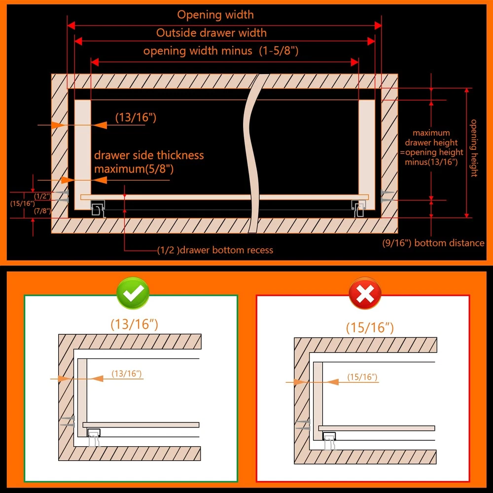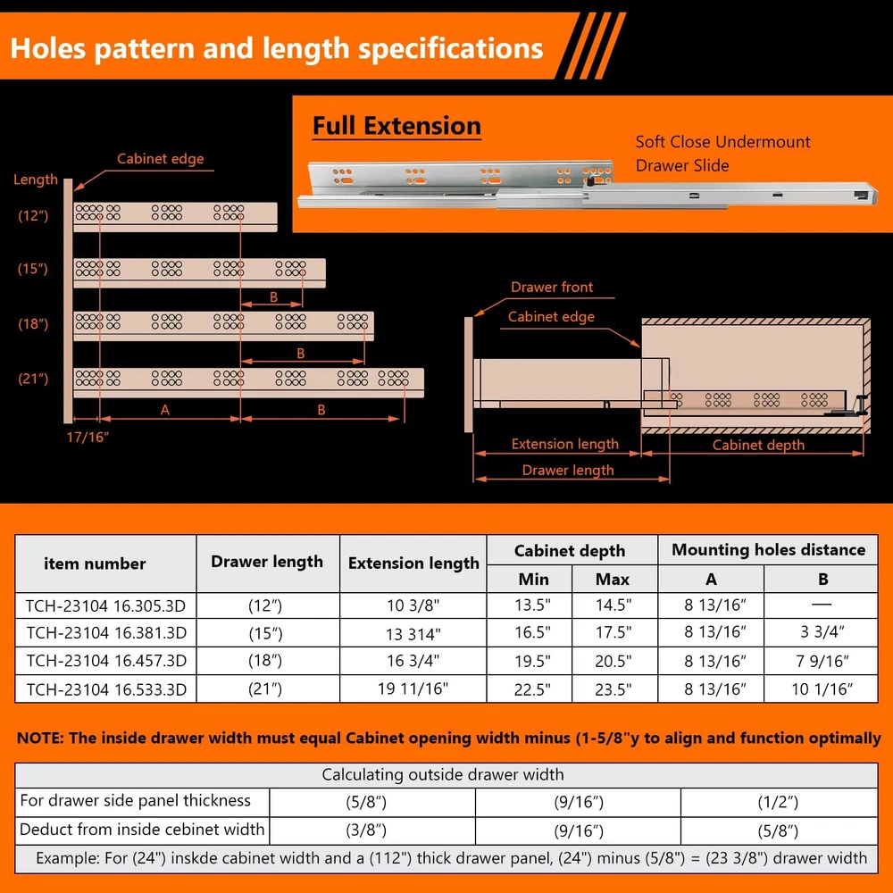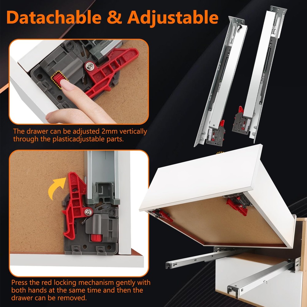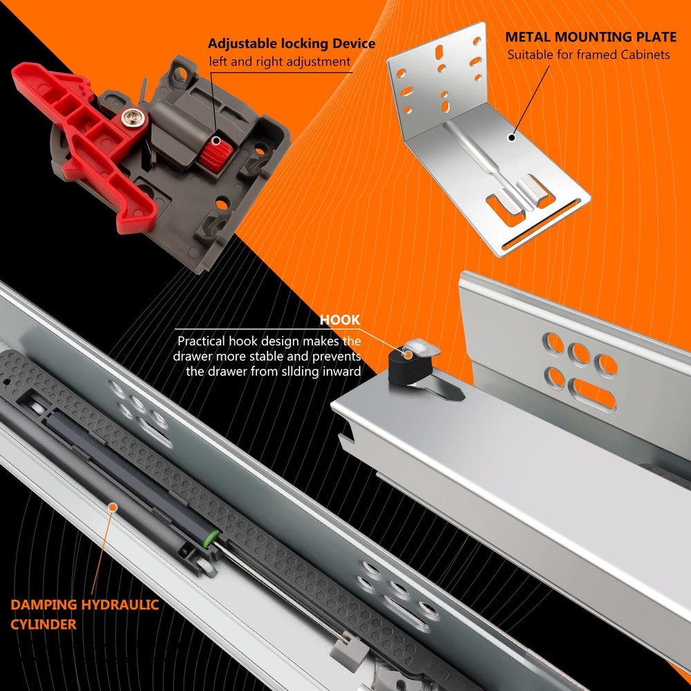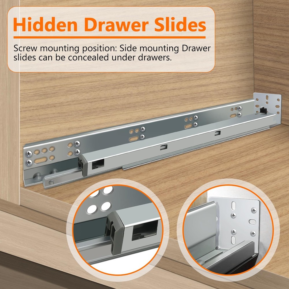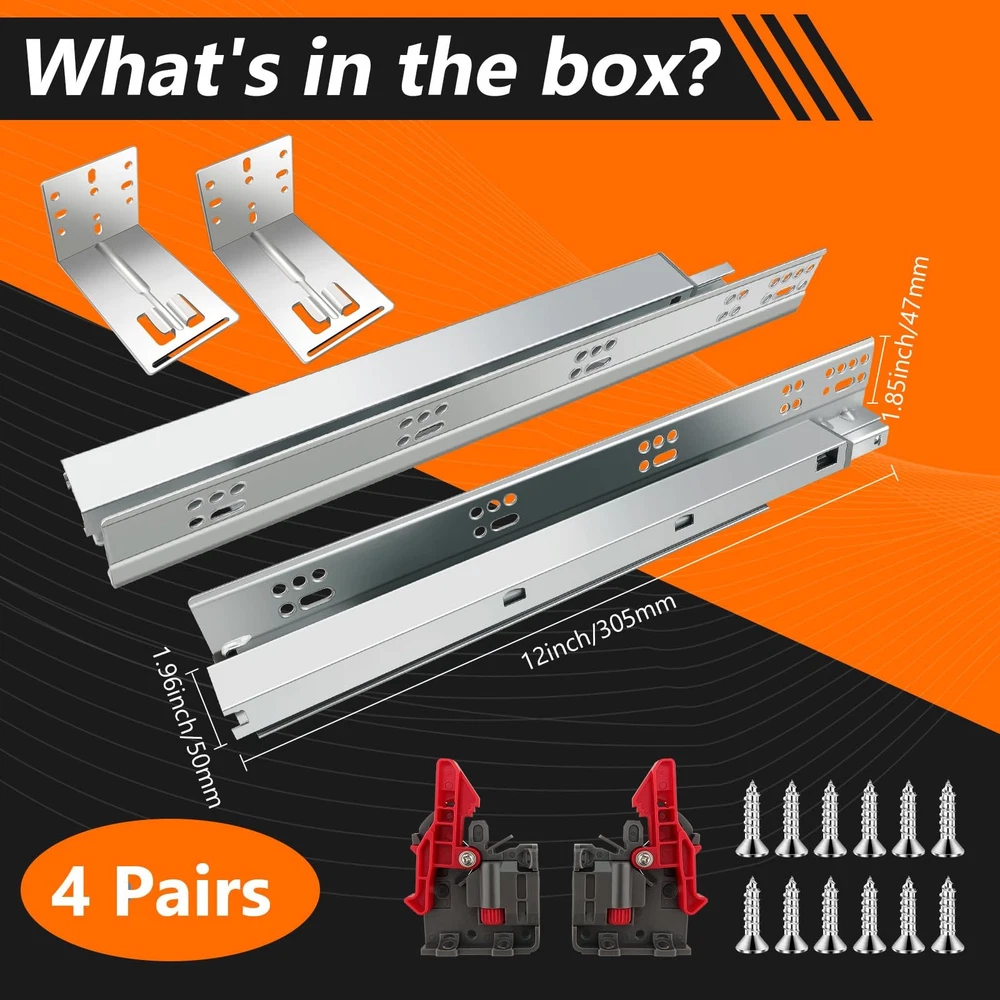 4Pair 8PCS Undermout Drawer Slides 12 15 18 21 Inch Bottom Mount Soft Close Drawer Slides Full Extension Concealed Drawer Rails/Mounting Screws,Locking Device and Brackets,80 LB Load Capacity 12" Description Features: [4 pairs Under Mount Drawer Slides]- 4 pair(8 pieces) of 12 inch undermount drawer slides.And each pair match with 12pcs screws,adjustable locking device, mounting screws, instructions. Undermount Drawer Slides are fit all drawrs with Face Frame or Frameless Cabinets. Such as cabinetry, desk pedestals,office,drawers TV cabinet,beside tables and general storage drawers. [Material]: All of the drawer slides producd by JI2OOYI are made from high-grade cold rolled steel with electrom zinc plated finish makes precise thickness and smooth surface. Soft close function creat less noise when it's opened and closed. [Measurement]:12"(305mm) under mount soft close drawer slide,inside cabinet length(min):340mm,inside cabinet length(max):360mm.Load Capacity: 85LB.The maximum thickness of the side panel of the applicable drawer is 16mm (5/8)(not recommended for 3/4 inch material.). Clearance between slides with cabinet: 20mm (0.78inch)- 40mm (1.58inch). [3-fold full extension]- Slides Width: 2.16" (55mm)--length:12" (304mm)--Fully extended length:21.6"(549mm) .our 3 fold full extension drawer design allows for easy and clear access to your belongings. Three-stage stretching can pull out the drawer completely.Make full use of your drawer space. [Undermount Drawer Slides]:With a adjustable locking device and metal plate makes installation simple and easy to clean.Drawer slides are placed on the bottom of the drawer,and screws are mounted on both sides of the cabinet.Suitable for American-style cabinets.Just hold the two locking device with both hands at the same time,the drawer can be easily taken out. Product Details: Color: Silver Material: Alloy Steel Brand: JI2OOYI Product Dimensions: 12"L x 2.16"W x 2.16"Th Finish Type: Zinc Plated Mounting Type: Bottom Mount Weight Limit: 85 Pounds Drawer Type: undermount drawer slides Manufacturer: JI2OOYI Number of Items: 8 Part Number: under-4 Item Weight: 15.82 pounds Product Dimensions: 12 x 2.16 x 2.16 inches Country of Origin: China Item model number: under-4 Size: 12inch-305mm Finish: Zinc Plated Item Package Quantity: 4 Maximum Weight Capacity: 85 Pounds Included Components: 4 pair of bottom mount drawer slides,mounting screws,adjustable locking device Batteries Included?: No Batteries Required?: No Date First Available: November 4, 2023 Handling We will ship all orders within 3 business days of payment. Delivery We do not ship outside of the Continental US. Feedback We take our reputation seriously, we buy and sell online, so we understand the value of trust. If you are unsatisfied with your order, please contact us and we will work with you to resolve it to your satisfaction.