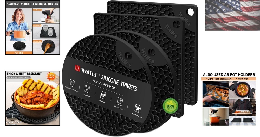 Multipurpose Food-Grade Silicone Trivets - 4 Pack of Durable Hot Pads in Black ‹ › ‹ › ‹ › ‹ › ‹ › ‹ › ‹ › ‹ › ‹ › ‹ › Multipurpose Food-Grade Silicone Trivets - 4 Pack of Durable Hot Pads Color: Black Features: Non-Slip and High Heat Resistant: These trivets withstand heat from -104℉ to 446℉, protecting your countertop or table from hot pots and pans fresh out of the microwave or stove. High-Quality Silicone: Crafted from food-grade silicone, BPA-free and flexible, ensuring durability and safety. These trivets won't rust, crack, or chip, and are lighter than traditional metal options. Multi-Functional: Perfect for a variety of uses including hot pot holders, drying mats, jar openers, spoon holders, garlic peelers, and coasters. Sizes: Square Trivets: 7.1" x 7.1", Round Trivets: 7" x 7", Thickness: 0.24". Easy to Dry and Clean: Designed to capture water vapor and condensation, these trivets are easy to dry by simply squeezing or shaking. Hand wash or conveniently place in the dishwasher. Easy to Use and Store: Lightweight and convenient for everyday use. Storage is a breeze as they can be hung on hooks or simply placed on your table, keeping your space clean and tidy. Benefits: Protects your surfaces from heat damage Versatile in function and stylish in design Long-lasting and easy to maintain Effortlessly complements any kitchen decor Lightweight for convenience, yet durable for daily use Why choose our Silicone Trivets? Elevate your culinary experience with our Multipurpose Food-Grade Silicone Trivets. Designed for high-performance heat protection and crafted from materials, these trivets ensure safety while adding elegance to your kitchen. With unmatched versatility, they serve various functions, making them indispensable for any home chef. Choose quality, choose convenience, and embrace style with our Silicone Trivets - grab your 4 Pack today and redefine your kitchen essentials! Shipping Free & Fast Shipping - We offer free shipping to most of the USA with a normal delivery time of 3-7 days. However, due to the current situation, additional delivery time (up to 3 weeks) may be required for some items. Alternative Carriers - We may use alternative carriers (e.g. USPS, FedEx, UPS, etc.) to ensure your package arrives safely and on time. Due to the use of multiple carriers, we are unable to provide a tracking number automatically. Handling Time - Orders are processed and shipped within 1-2 business days of receiving cleared payment. Shipping Restrictions - Shipping to Alaska, Hawaii, Puerto Rico, Guam, and other US territories may incur shipping charges or delivery restrictions. Please contact us before ordering, or your order can be refunded/cancelled. State Restrictions - There may be restrictions based on your state of purchase. For example, certain items may not be shipped to California due to state regulations. Contact for Tracking Updates - If you require tracking updates or have any concerns about the delivery of your order, please feel free to contact us, and we will be happy to assist you. Return 30-Day Hassle-Free Returns - We want you to be completely satisfied with your purchase. If you are not, you can return the item within 30 days of receiving it for a full refund or exchange. Easy Return Process - To start a return, simply contact us and we will provide you with a prepaid return shipping label and detailed instructions. Restocking Fee - There are no restocking fees for returns. However, the buyer is responsible for return shipping costs if the return is not due to a seller's error. Refund Processing Time - Refunds will be processed within 5 business days of receiving the returned item in its condition. Payment We accept all major credit cards, PayPal, and Apple Pay for your convenience. Your payment information is secure and encrypted to ensure a safe and seamless transaction. Please complete your payment within 3 days of purchase to avoid any delays in shipping. Feedback Your feedback is extremely important to us. We strive to provide the best products and customer service possible. If you are satisfied with your purchase, please take a moment to leave us a positive review. If you have any concerns or issues with your order, please contact us before leaving negative feedback. We are committed to resolving any problems and ensuring your satisfaction. Contact Us If you have any questions or concerns, please feel free to out to our customer support team. You can contact us through the eBay messaging system. We are available Monday to Friday, 9:00 am to 5:00 pm EST, and we will do our best to respond to your inquiry within 24 hours. Buy it now and enjoy a pleasant shopping experience! Unit Quantity: 4 Material: Silicone,Food Grade Silicone,BPA Free Department: Adults,Unisex Occasion: Multipurpose,Kitchen Set Includes: Trivet Mats Features: Dishwasher Safe,Heat Resistant,Non-Slip,Flexible,Long-Lasting,Easy to Clean,Lightweight,Convenient to Store Color: Black Type: Potholders Number of Items in Set: 4 Style: Modern Size: One Size