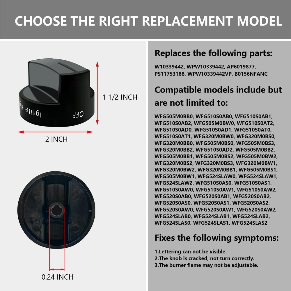 (4 Pack) W10339442 Gas Range Knob Black Replacement Part for Whirlpool Product Details Material: ABS plastic Brand: Reyhoar Color: Black Product Dimensions: 2"L x 2"W Exterior Finish: Black Specific Uses For Product: Oven Door Special Feature: Easy to Install, Durable Included Components: Knob Theme: Appliance Parts Item Weight: 23 Grams Handle Material: Acrylonitrile Butadiene Styrene Hand Orientation: Ambidextrous Unit Count: 1 Count Number of Items: 4 Manufacturer: Rayhoor Part Number: AP-BN01 Item Weight: 0.811 ounces Country of Origin: China Item model number: W10339442 Gas Range Knob Finish: Powder Coated Number Of Pieces: 4 Special Features: Easy to Install, Durable Batteries Included?: No Batteries Required?: No Material: ABS plastic Brand: Reyhoar Color: Black Product Dimensions: 2"L x 2"W Exterior Finish: Black StyleHandle Type: 4 PackKnob ShapeFinish Type: RoundPowder Coated 【Perfect Replacement】 Our 4 Pack W10339442 Gas Range Knob replaces part numbers: W10339442, WPW10339442, AP6019877, PS11753188, WPW10339442VP, B0156NFANC 【Widely Applicable】Compatible with Whirlpool, Maytag Range / Stove / Oven. Product Dimensions:2.05"Φx 1.54"H (5.2 x 3.9cm). 【Premium Quality】This high-quality exact equivalent meets or exceeds original manufacturer specifications. It has a durable plastic construction for reliable use. 【Save Time & Money】Saves you a service fee from the appliance guy! Inexpensive way to fix or repair a range. Reyhoar's Knob is sometimes known as a valve knob, works for a range, oven, or stove. This knob accepts a D-shaped shaft. No tools are required for completing this repair. A Range Top Surface Burner Knob, directly fit replacement for your worn, broken or missing knob. Replaces the following parts: W10339442, WPW10339442, AP6019877, PS11753188, WPW10339442VP, ### Compatible models include but are not limited to: WFG320M0BB0, WFG320M0BS0, WFG320M0BW0, WFG505M0BB0, WFG505M0BS0, WFG505M0BW0, WFG510S0AB0, WFG510S0AB1, WFG510S0AB2, WFG510S0AD0, WFG510S0AD1, WFG510S0AD2, WFG510S0AS0, WFG510S0AS1, WFG510S0AS2, WFG510S0AT0, WFG510S0AT1, WFG510S0AT2, WFG510S0AW0, WFG510S0AW1, WFG510S0AW2, WFG520S0AB0, WFG520S0AB1, WFG520S0AB2, WFG520S0AS0, WFG520S0AS1, WFG520S0AS2, WFG520S0AW0, WFG520S0AW1, WFG520S0AW2, WFG524SLAB0, WFG524SLAB1, WFG524SLAB2, WFG524SLAS0, WFG524SLAS1, WFG524SLAS2, WFG524SLAW0, WFG524SLAW1, WFG524SLAW2, etc. Fixes the following symptoms: 1. Selection will not set; 2. Will not turn; 3. Will not stay on. Specifications: 1. Material: ABS plastic 2. Color: Black 3. Product Dimensions: 2.05"Φx 1.54"H (5.2 x 3.9cm) 4. Quantity: 4 Pcs