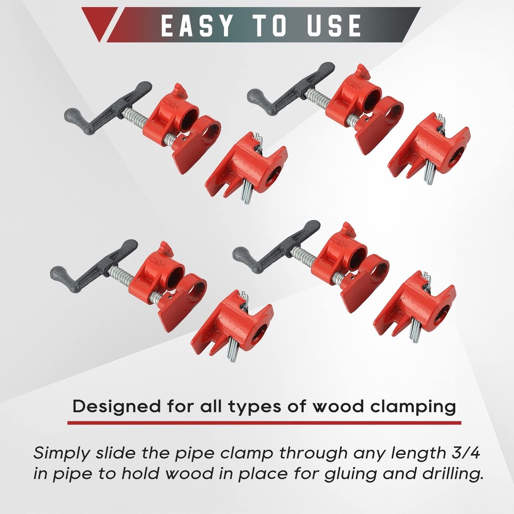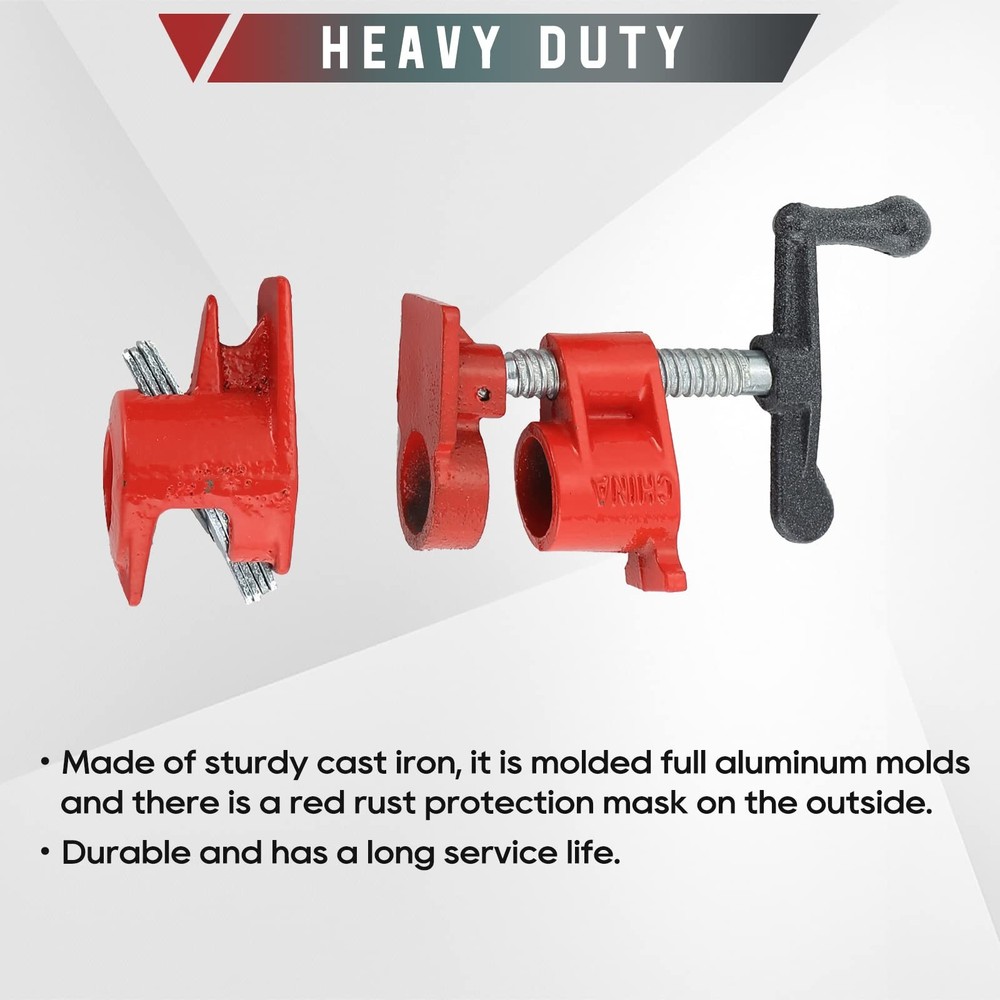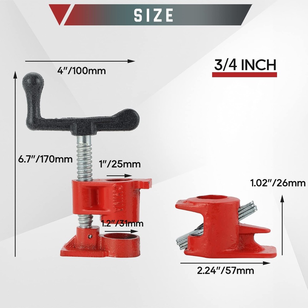 Features: ✔ Constructed of tough cast iron, makes this pipe clamp durable and sturdy to use. ✔ Large feet offer more stability and clearance between handle and workbench. ✔ Spring lever control will lock jaw at needed location and provide quick release. ✔ Ergonomic grip handle offers easy clamping and reduces hand fatigue. ✔ Large clutch plates release easily for increased durability and reliability. ✔ Suitable for 3/4" threaded pipe, keep your woodwork precise in place while gluing. ✔ A great addition to carpenters, woodworkers, metalworkers, hobbyist and other professionals. Specifications: Condition: 100% Brand New Material: Iron Color: Red Quantity: 4pcs Weight: Approx. 5500g Package Included: 4 x 3/4" Woodworking Pipe Clamps Heavy Duty: The sturdy wood pipe clamps are made of sturdy cast iron, it is molded full aluminum molds and there is a red rust protection mask on the outside, which is durable and has a long service life. For 3/4inch Threaded Pipe: The wood gluing clamp set is designed for all types of wood clamping, simply slide the pipe clamp through any length 3/4 in pipe to hold wood in place for gluing and drilling. Quick Release: Spring lever control will lock jaw at needed location and provide quick release. This woodworking clamp features ergonomic grip handle for easy and fast clamping, offers efficient woodworking. Wide Application: The woodworking pipe clamp is a great addition to any woodworking work bench, an necessary tool for carpenters, woodworkers, metalworkers, hobbyist and other professionals, great parallel clamps for woodworking. Package Included: This package includes 4 woodworking clamps that is suitable for 3/4 inch thread pipe, ideal pipe clamps for woodworking.