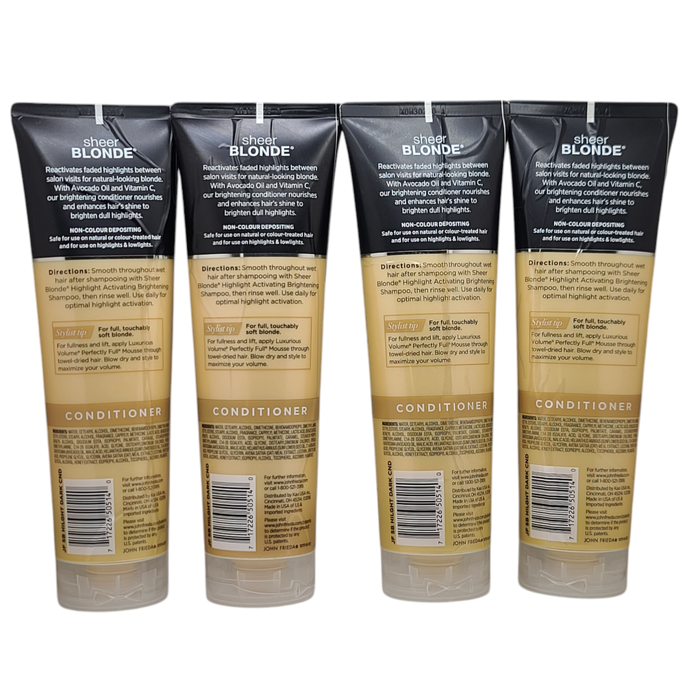 KleverKosmetics Our eBay Store About Us Contact Us Add to Favorite Sellers 4 Pack, John Frieda Sheer Blonde Highlight Activating Brightening Conditioner 8. 4 Pack!! John Frieda's Sheer Blonde Highlight Activating Brightening Conditioner 8.45 oz is specifically formulated to enhance and brighten blonde hair, whether natural or color-treated. Infused with sunflower and white tea, this conditioner nourishes and improves the texture of each strand, leaving hair healthier, shinier, and more luminous. It effectively removes dull build-up, revealing natural-looking blonde with a full spectrum of tones. 4 Pack!! Enhances Blonde Highlights: Formulated to enhance natural or color-treated highlights, boosting brightness and vibrancy. Nourishing Ingredients: Enriched with sunflower and white tea to nourish and improve hair texture, promoting softness and shine. Moisturizing Formula: Hydrates and softens hair, leaving it smooth and manageable. Safe for Color-Treated Hair: Suitable for both natural and color-treated blonde hair, preserving color vibrancy. Free from Harsh Chemicals: Formulated without parabens, phthalates, ammonia, and silicones, ensuring safe use for color-treated hair. Return and Refund Information • Please be aware that colors on the screen may appear slightly different in person. • Please be familiar with product. Feel free to contact us if you have any questions. • DUE TO HEALTH AND SANITARY ISSUES CONCERNING COSMETICS OR SKINCARE WE DO NOT ACCEPT RETURNS ON THESE ITEMS. ALL SALES ARE FINAL. • WE WILL ONLY ACCEPT RETURNS WHEN THE ERROR IS ON OUR END. • Attention VeRO members: We're not affiliated with or endorsed by the companies mentioned in this listing. All trademarks and copyrights are acknowledged, they are only used for informative description of the items offered for sale. Warranty information We are not an authorized dealer of this product and any warranty included with the product may not be honored by the manufacturer.