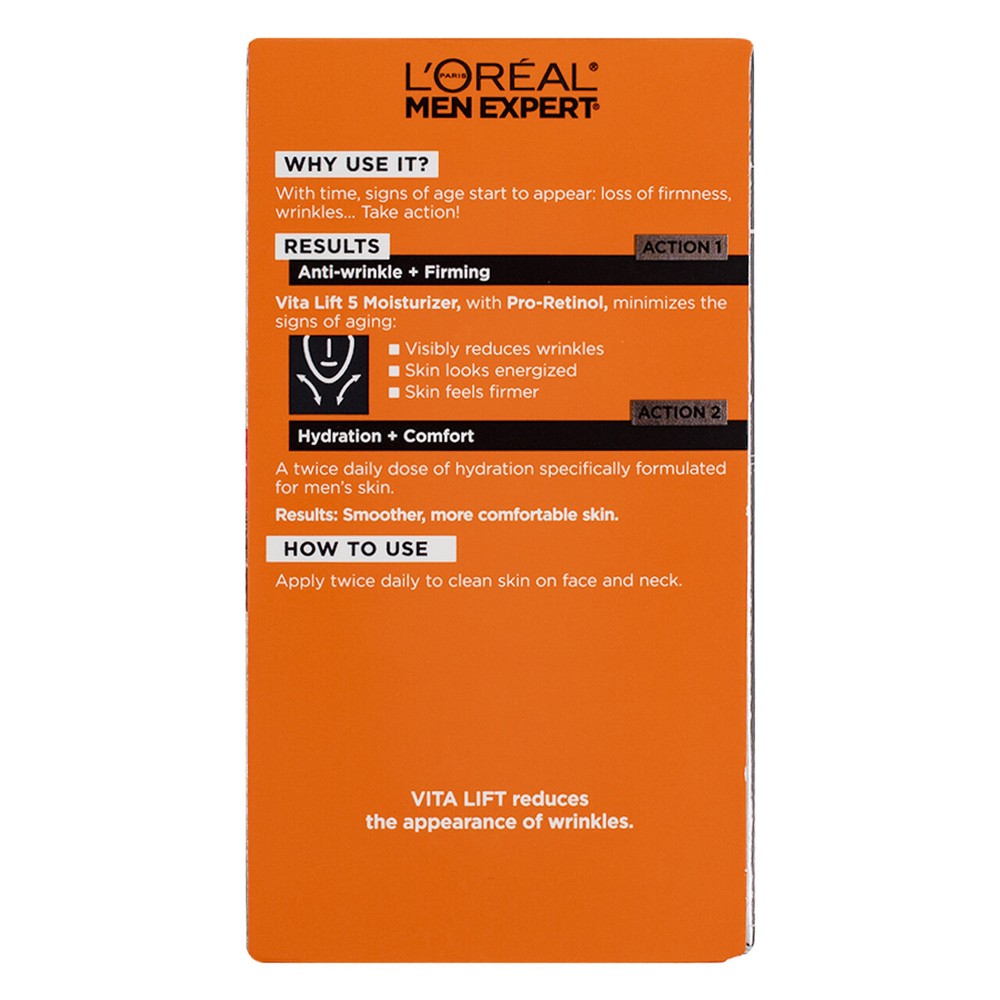 4 Pack L'Oreal Paris Men Expert Vita Lift Daily Moisturizer Anti-Wrinkle Cream, 1.6 fl oz Warnings Disclaimer The product descriptions and instructions provided by vitabox.com are for informational purposes only and are qualified in their entirety by the information available from manufacturers of the products. You should carefully read all product packaging, and contact the manufacturer with any questions before using a product. While we endeavor to ensure that product descriptions are current, manufacturers sometimes change their products. We are not liable for inaccuracies or misstatements about products. We do not provide medical advice or recommendations. You should not use the information provided by vitabox.com for diagnosing or treating a health problem or disease. If you have or suspect that you have a medical problem, immediately contact your health care provider. Information and statements regarding dietary supplements have not been evaluated by the Food and Drug Administration or any other government agency and are not intended to diagnose, treat, cure, or prevent any disease. Disclaimer The product descriptions and instructions provided by vitabox.com are for informational purposes only and are qualified in their entirety by the information available from manufacturers of the products. You should carefully read all product packaging, and contact the manufacturer with any questions before using a product. While we endeavor to ensure that product descriptions are current, manufacturers sometimes change their products. We are not liable for inaccuracies or misstatements about products. We do not provide medical advice or recommendations. You should not use the information provided by vitabox.com for diagnosing or treating a health problem or disease. If you have or suspect that you have a medical problem, immediately contact your health care provider. Information and statements regarding dietary supplements have not been evaluated by the Food and Drug Administration or any other government agency and are not intended to diagnose, treat, cure, or prevent any disease.