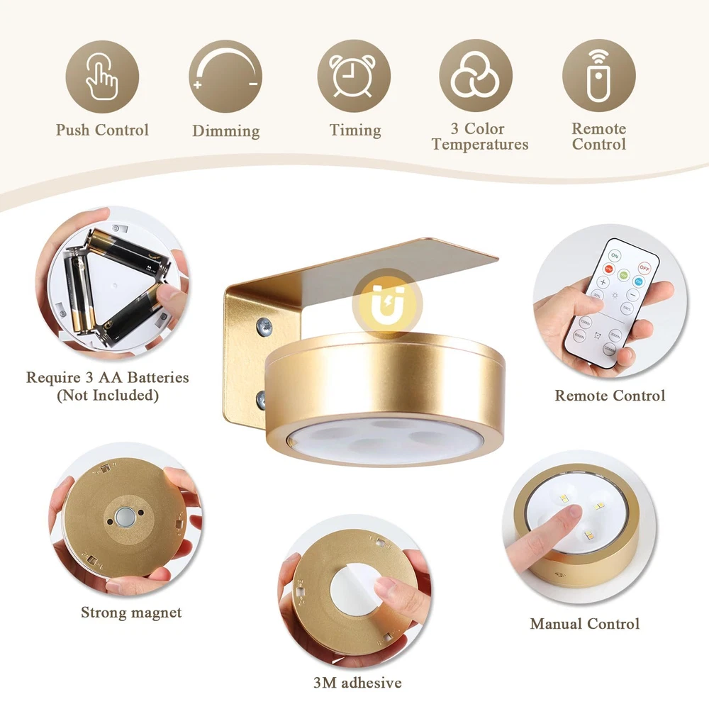 Description Gold Magnetic 4-Pack Battery Operated Picture Lights Product Description: LED Battery Operated Picture Lights Simple design but widely used painting lamp and art display lamp: This wireless art display light for picture frame painting is creative, artistic, simple and personalized. Widely used for picture display, portrait display, painting art lighting, picture frames, library lighting, and accent lighting. This magnetic picture lights can also be used as a flashlight, removable light, portable light, emergency light. Two mounting options for this magnetic picture lighting: 1. with magnetic mount and strong 3M adhesive. Remove the tape on the bottom of the mount. Use the strong adhesive to mount the lamp base on a smooth and clean surface, and then use the magnetic attraction to mount the lamp body. 2. Screws and holes are provided on the lampholder. If the surface of the light fixture you are installing is not smooth and clean, you can use screws to reinforce it. You can use screws to reinforce the installation. art lighting for paintings wireless Product Information: Color temperature: 3000K-4500K-6000K Power: 2.25W Battery requirements: AA battery power supply Material: plastic/acrylic Control mode: press/remote control Endurance: 30-60 hours of continuous lighting (Rechargeable AA batteries recommended) lights for pictures on wall wireless Please note: Before installing with 3M adhesive, please make sure the installation surface is clean, flat and smooth. Otherwise it will affect the performance of the 3M adhesive and cause the fixture to fall off. Please be careful when using screws when installing reinforcement as this will inevitably damage the surface being installed. Accessories: Lamp body × 2 Lamp holder x 2 Mounting plate x 1 Remote control x 1 User manual x 1 【Magnetic Design & Electromagnetic Drive】Gold wireless Picture Light features a magnetic attachment structure that makes it easy to remove and replace batteries. Picture light is powered by 3 AA batteries (batteries not included). Run time 30-60 hours (Rechargeable AA batteries recommended) 【Dimmable & Timer Function】Button control and remote control both can switch the color temperature(3000K-4500K-6000K). Also two ways for dimming this magnetic picture lights for wall. Button control: Stepless(Long press). Remote control: stepless(Button”+”&”-”); You can use the remote control to turn on/off the lights and easily realize dimming function, with four timing functions, and you can set the lights to turn off automatically after 15, 30, 60, or 120 minutes. 【Push button and remote control】Two control methods for this magnetic art lighting for paintings wireless which are button control and remote control. LED picture light also comes with a remote. Eliminated the hassle of button control. You can complete all settings through the remote control: ON/OFF; 3 color temperature switching; brightness adjustment and Timing 【Easy to Install】This LED wall lights comes with a magnetic fixture and strong 3M adhesive. The package comes with all the necessary accessories for installation, you just need to use the expansion screws to fix the iron plate on the wall and then use the magnetic hockey puck light to fix it on the iron frame, it is very easy to use.3M adhesive can be used in cabinets or closets! 【Application&After-Sales Service】Our universal multifunctional wall lamp is small&simple design but modern&widely application. This magnetic wall light is widely used in wall art light on living room, bedroom,decoration room, kitchen, office, garage, good for small or mdeium size pictures paintings frames artworks protraits posters canvas etc.We provide 24 months warranty for wireless picture lights for wall, please feel free to contact us if you have any needs.