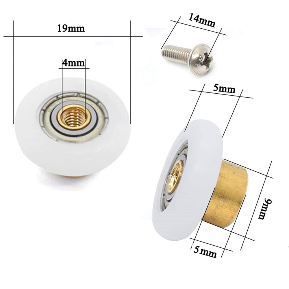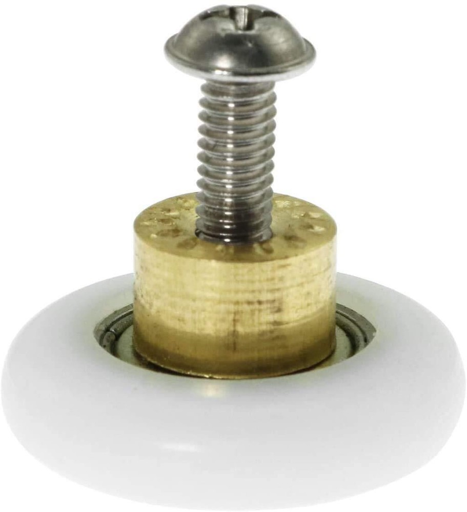 4 Sets Shower Door Rollers Runners Wheels Replacement Part Bathroom Glass Shower Sliding Door - 19mm x 5mm Product main image Description Material: Copper + POM wheel Roller outer diameter:19mm Inner hole:4mm M4 screw can be used Pulley bearing capacity, good stability; Small friction coefficient, good mute effect. Easy installation, often used for bathroom glass sliding door pulley/sliding track. Package include: 4pcs shower door roller 4pcs M4x12mm stainless steel screws Note:Please measure the dimensions for better installation before purchase. Features: Type: 4pcs shower door roller. Wheel thickness :5mm, comes with screws, suitable for 4-6mm thick shower door. Roller diameter: 19mm, Inner hole: 4mm, fixed with M4 screw. The pulley is made of copper +POM wheel, and the screw is made of stainless steel,corrosion resistance and rust resistance,it has good comprehensive performance. Pulley bearing capacity, good stability; Small friction coefficient, good mute effect. Easy installation, often used for bathroom glass sliding door pulley/sliding track. Product Details: Brand: XUKEKOY Color: Silver, White Material: Copper Style: Normal Item Weight: 1.13 Ounces Brand: XUKEKOY Color: Silver, White Material: Copper Style: Normal Item Weight: 1.13 Ounces Assembly Required: No Manufacturer: shower door rollers Part Number: 110 Item Weight: 1.13 ounces Product Dimensions: 0.2 x 0.7 x 0.4 inches Country of Origin: China Included Components: screws Batteries Included?: No Batteries Required?: No Date First Available: November 5, 2020