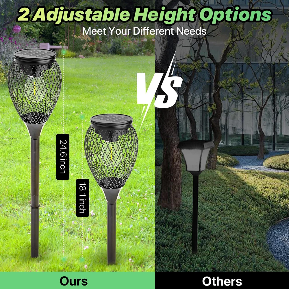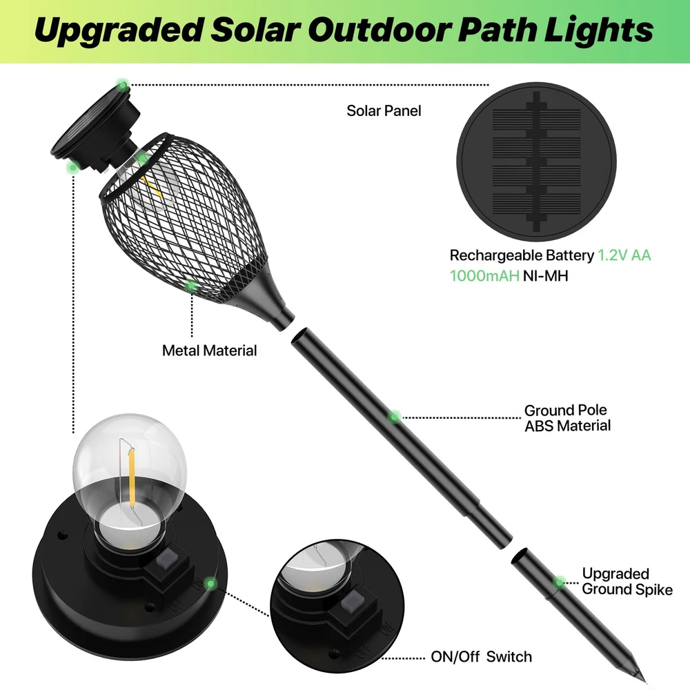 【Upgraded Brighter & More Durable】Upgraded bright solar pathway lights are made of metal material & tungsten bulbs & strong stakes, and thicker & more durable than other solar lights. The warm white outdoor solar lights are the perfect way to decorate your garden's landscape and light up your home. 【High Capacity & Longer Working Time】These solar path lights have a larger battery capacity of 1000mAh, while the others only 400mAh.The solar path lights provide 8-12 hour warm white illumination from dusk to dawn after a 4-6 hour charging time. The solar lights provide brighter lighting and work longer than other outdoor led solar pathway lights. The outdoor solar lights can automatically turn on at night and turn off at dawn by sensitively sensing the brightness. The solar lights can create a romantic atmosphere for your garden, lawn, driveway, pathway and yard. 【Easy to Install & 2 Adjustable Height】 No wiring or any tools are required to install these solar pathway lights. Just assemble and insert the solar landscape lights into the ground. Choose one pole or two for installation, adjustable height of the solar lights can greatly meet your different lighting and decoration needs. You can install these solar garden lights in your garden, yard, pathway, sidewalk, driveway etc. ★Note: Please make sure to turn ON the switch before charging. (switch is under the solar panel)★ 【Best Gift Choices】: The sidewalk solar lights can provide a perfect lighting atmosphere for any outdoor places, such as garden, yard, lawn, path, walkway, patio, porch, balcony, etc. The Solar stake lights outdoor decorative are great gift ideas for Holiday, Christmas, Birthday, Anniversary, Mother’s day, Party etc. The solar garden lights can bring more happiness & surprise for your family members and friends etc. 【Weatherproof & Warranty】The solar garden lights are waterproof IP65, which can withstand sunny, rainy, and snowy days. Besides, we provide 60 days replacement or risk-free refund warranty for our solar powered lights. If you have any questions about our landscape path lights, please contact us immediately and we will do our best to make you satisfied.