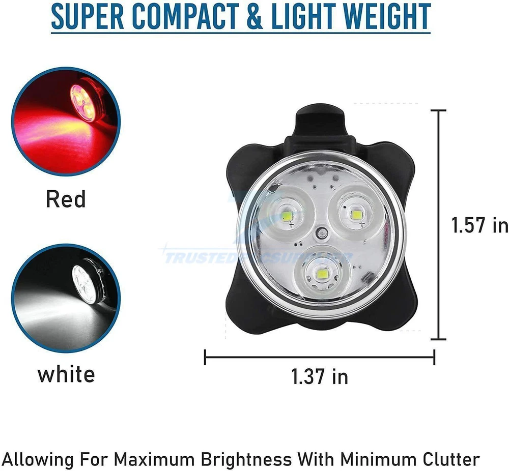 Product Description 4Set USB Rechargeable LED MTB Bicycle Light 900000LM Racing Bike Front Headlight Feature: * bicycle light 4 lighting modes *USB Rechargeable: Both headlight and back light can be charged by laptop, power bank or any device with USB port. *Safe to use: Ensure the lights bright even in heavy rain with water resistant , and reduce the glare and prevent accidents. Its durable Heavy duty body is anti shock to endure rough handling. *Easy to install:Come with the silicone strap with mount bracket and high -card deck buckle, no tools required. *Wide use:Not only a bike light for riding, but also a flashlight for emergency use, hiking, walking, jogging,hiking,camping, and other any activity when you need illumination. Specification: Size:Lamp diameter :43mm L*W:75*75mm USB:140mm volcano bicycle light :7*2*1.7cm Material: aluminum alloy + plastic PC Brightness: 40000 lumens Range: 300 meters Battery capacity: 2600 mAH Wick: bright wick Mode: High brightness/half brightness/quick flashing/slow flashing. Charging time: about 2 hours Lighting time: 3-5 hours Charging method: USB charging Led bulb life:100,000 hours Waterproof:IPX-4 Color:black ,red Weight:262g/9.24oz/0.58lb Rear Light Description: -Visable at daytime: Did you know that 75 percent of cycling accidents happen in daytime.This taillight keeps you visable not only at night but also in the daytime.Keeping you and your loved ones safe all the time. -Keep you safe: Wide angle visual design provides more visibility than any lights on the market.Whether you're running,walking with your dog,cycling,skateboarding or hiking,these safety lights will keep you safe and secure. -Waterproof: Highly airtight construction,stronger waterproof.These tail lights are water resistant for any weather,extremely durable. -USB rechargeable: This taillight can be charged by USB cable via computers,chargers or portable power bank.This will save you lots of money on batteries. -Multi-purpose: Hook onto your belt,running gear,reflective vest,backpack,dog collars,harnesses,or anywhere on your clothing. Mount to your bicycle,helmet,skateboard,scooter,stroller, wheelchair,or anywhere you can imagine. Description: Material: ABS+PC Color: red Size: 7*2cm 4 lighting modes Led beads: 2835 patch Waterproof rating: IPX5 Battery capacity: 220 mAh (polymer lithium battery) Endurance: 5H Lumens: 30 What's included: 1/2 x Head light (white light) 1/2 x Tail light (red light) 1/2 x USB cables 2/4 x Silicone mounting Strap About Us Payment Shipping Returns Contact Us 1. Unless specified otherwise, all our products are IN STOCK and are shipped from USA Local warehouse - Not Overseas! 2. We provide a 30 day Satisfaction Guarantee or your money back (provided items are in the same new and resaleable condition.) 3. We have a PayPal Verified Business Account, please buy with Confidence! 4. Every item will be tesrted before send.We know our products well and if we don't have the answers we will do our best to find them for you! 5. Our friendly team look forward to serving you! Your satisfaction is our No.1 Priority We will do our best to satisfacy you. 1.Paypal, Credit Card, G Pay etc, many payment way is accepted. 2.Please be sure your shipping address is correct before make a payment. 1.We will ship out the item within 1-3 business days after comfirming the payment, appreciate your patience. 2.If the items are broken on the way(we will check the orders clearly before we sent them),please contact us in 3 days you received it. We will send you a new one or refund your payment. 1.We stand behind every buyer.Items can be returned for exchange or refund within 30 days. 2.Please contact us when you have any confusion of our item, we will solve the trouble for you as soon as possible. 1.This is professional Seller.We will reply your message within 24 hours. 2.Please contact us whenever you have any question about the item. We will deal with it as soon as possible. 3. If you are unhappy with the item or our service,please Contact Us before leave feedback,just give me a chance,thank you! About Us 1. Unless specified otherwise, all our products are IN STOCK and are shipped from USA Local warehouse - Not Overseas! 2. We provide a 30 day Satisfaction Guarantee or your money back (provided items are in the same new and resaleable condition.) 3. We have a PayPal Verified Business Account, please buy with Confidence! 4. Every item will be tesrted before send.We know our products well and if we don't have the answers we will do our best to find them for you! 5. Our friendly team look forward to serving you! Your satisfaction is our No.1 Priority We will do our best to satisfacy you. Payment 1.Paypal, Credit Card, G Pay etc, many payment way is accepted. 2.Please be sure your shipping address is correct before make a payment. Shipping 1.We will ship out the item within 1-3 business days after comfirming the payment, appreciate your patience. 2.If the items are broken on the way(we will check the orders clearly before we sent them),please contact us in 3 days you received it. We will send you a new one or refund your payment. Returns 1.We stand behind every buyer.Items can be returned for exchange or refund within 30 days. 2.Please contact us when you have any confusion of our item, we will solve the trouble for you as soon as possible. Contact Us 1.This is professional Seller.We will reply your message within 24 hours. 2.Please contact us whenever you have any question about the item. We will deal with it as soon as possible. 3. If you are unhappy with the item or our service,please Contact Us before leave feedback,just give me a chance,thank you! You may also like 42 Tips 96W Universal Power Supply Charger for Laptop Notebook AC/DC Power 13.98 USD 15.99 USD 0.99 USD 13% off 9PC ABS Socket Organizer 1/2 3/8 1/4 inch Drive Socket Rail Holders Wall Mount 18.49 USD Free shipping Car Steering Wheel Tray Desk Two Sided For Laptop Drink Food Work Table Holder 8.09 USD 8.99 USD 0.99 USD 