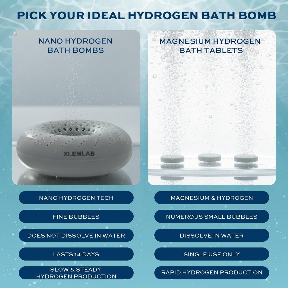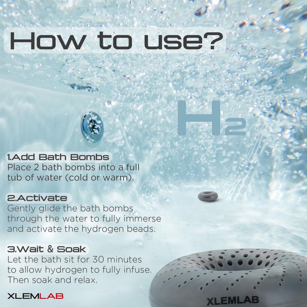 Bring a little extra relaxation to your bath with our hydrogen bath bombs. Use 2 bombs in warm water before bathing, and let the soft microbubbles create a soothing experience. Designed for repeated use, lasting up to 14 days with proper storage. Designed for gym-goers and athletes, hydrogen bath bombs provide a soothing molecular hydrogen bath to help you unwind after workouts or long, busy days. Enjoy a relaxing muscle soak that eases body tension and turns your bath into a refreshing daily ritual. Simple Use, Anytime – Drop 2 hydrogen bath bombs into warm water 30–60 minutes before bathing. Swirl gently to activate. For a stronger hydrogen presence, you can use 4 bombs per bath. Lasts Up to 14 Days – Each hydrogen bath bomb is reusable for up to 14 days. While testing shows hydrogen may be released for up to 45 days, we recommend it within 14 days for the most consistent experience. Easy Storage for Ongoing Use – Keep the bath bombs in a bowl of water between uses to maintain the hydrogen reaction. The stored water can also be used for general rinsing or household purposes. Inspired by Wellness Trends – Hydrogen baths are gaining popularity for their clean, relaxing soak experience. Bring this trend home and enjoy a quiet, refreshing moment — no fragrances, no colorants, just simplicity. Slow Release, Steady Hydrogen – Our hydrogen beads react gradually in water, releasing hydrogen over time with only light bubbling. A calm surface simply means the hydrogen is working silently beneath. Normal Residue from – You may notice some dark gray upon opening. This is not dirt — it's hydrogen material that may shift during transit. Simply rinse the product with water before use.