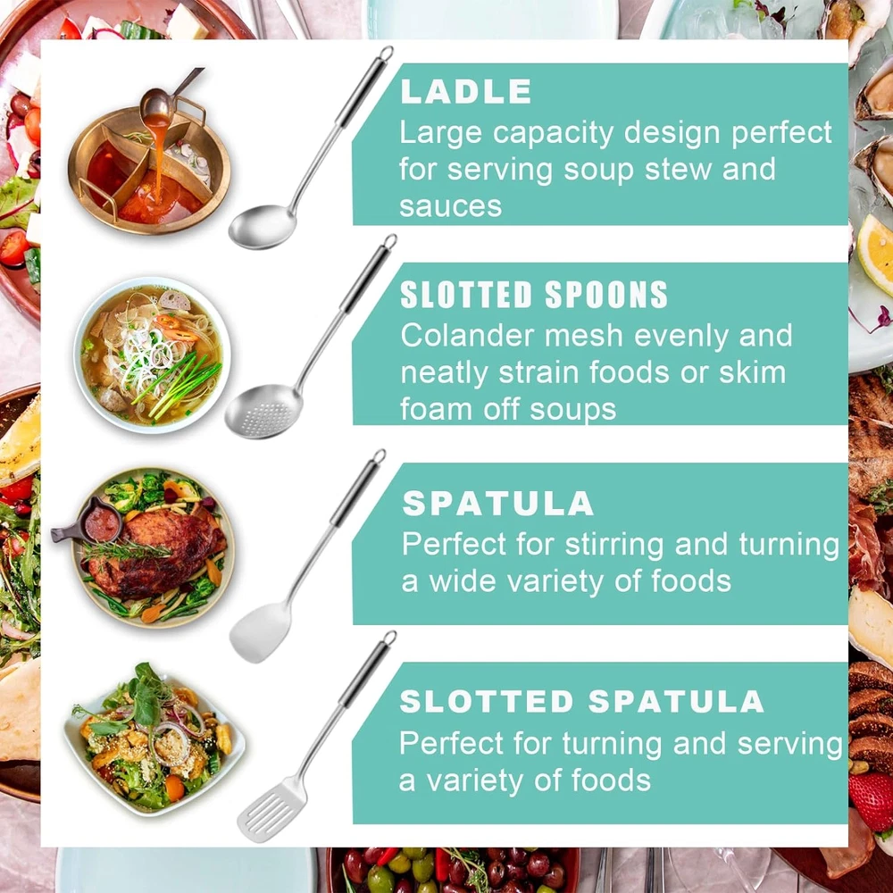 【4-Pcs Cooking Utensils & Multifunctional】Our kitchen utensils set include ladle, slotted spoon, spatula and slotted spatula. The cooking spatula is great for flipping pancakes, pork chops, steak, burgers, pancakes, eggs in a frying pan. The soup ladle is suitable for stirring or scooping sauces, gravies, soups and more. The slotted spoon is suitable for french fries and vegetables. The cooking utensils are the essential tools for preparing meals in home kitchens, restaurants and more 【Stainless Steel Material & Exquisite Craftsmanship】The spatula and spoon sets are made of stainless steel, which is heat-resistant, sturdy, anti-corrosion and rust resistance that provide you with long-term use. In addition, our kitchen utensils are manufactured through several processes, finely crafted to make the edges and surfaces smooth. Using the soup ladle spoon and metal spatula to serve soup and turn food will not ruin the original shape of the food or scratch your pan 【Ergonomic Heat-Resistant Handle】The long handle of the kitchen utensils with hollow heat-proof design that make the handle more heat resistant. The stainless steel cooking utensils set detail design of the handle will effectively prevents damage to the hands from excessive temperatures when cooking or serving food. Moreover, the wok utensils ergonomic round handle for easily holding that more comfortable and secure for you to use 【Save Space】Our spatula and spoon sets are designed with a built-in hanging hole at the top of the handle for easy hanging and storage. As well as keeping your kitchen tidy and saving space, it also allows spoon spatula to be hung vertically to drain, keeping them dry and hygienic 【Easy to Clean & Dishwasher Safe】The head and handle of the cooking utensils are integrally formed, making it easy to wash by hand or in the dishwasher. After use, wash the cooking utensils with a mild detergent and leave to dry after cleaning. Furthermore, the kitchen utensils set seamless design also avoids food hygiene problems caused by residual sewage in the gap after cleaning that give you more peace of mind 【Our Service】If you have any questions about our spatula and spoon sets, please feel free to contact us, we will be happy to serve you Product Description Pleafind 4-Pieces Stainless Steel Kitchen Utensils Set Whether in the home or any other kitchen, the cooking utensils set is the essential cooking utensils. Our wok utensils are made of stainless steel, which is sturdy enough for everyday use, such as the wok spatula is great for flipping pancakes, pork chops, pieces of meat, steak, burgers, pancakes, eggs in a frying pan. The soup ladle spoon is suitable for stirring or scooping sauces, gravies, soups, stews, mashed potatoes and more. The slotted spoon is suitable for french fries and vegetables. The cooking utensils set is the ideal tools for preparing meals in home kitchens, restaurants and more. If you are looking for high quality spatula and spoon sets for your family or restaurant, Pleafind 4-pieces stainless steel wok utensils set is a good choice for you. This cooking utensils set has a long handle, which provide enough distance from the pan to prevent getting scalded while also enough control to scoop or turn foods easily. In addition, the head of the wok utensils are large enough that will meet your needs for different foods. Your Simple Care Makes The Cooking Utensils Set More Long-lasting 1.Please wash the kitchen utensils with warm soapy water before first using it. 2. After use the cooking utensils set, please clean and dry them completely for their durability. 3.Don’t scratch these spoon spatula with the iron wire to keep their surface smooth. 4.The wok utensils are dishwasher safe, you can put the spatula spoon in the dishwasher to save your labor. Smooth Edge and Exquisite Craftsmanship Our cooking utensils are manufactured through several processes, finely crafted to make the edges and surfaces smooth. Using the soup ladle spoon and metal spatula to serve soup and turn food will not ruin the original shape of the food or scratch your pan. More importantly, the stainless steel cooking utensils set sleek, seamless design avoids food hygiene caused by residual sewage in the gap after cleaning. Easy to Clean and Storage The head and handle of the cooking utensils set is integrally formed, making it easy to wash by hand or in the dishwasher. Besides, our kitchen utensils set has a built-in hanging hole at the top of the handle for easy hanging and storage, which not only saves space, but also keeps the spatula and spoon sets dry and hygienic. Comfortable and Heat-Resistant Handle The handle of the spatula and spoon sets with hollow heat-proof design, which is safer and more comfortable to use, and can effectively prevent injury to the hands due to high temperature when cooking or serving food.